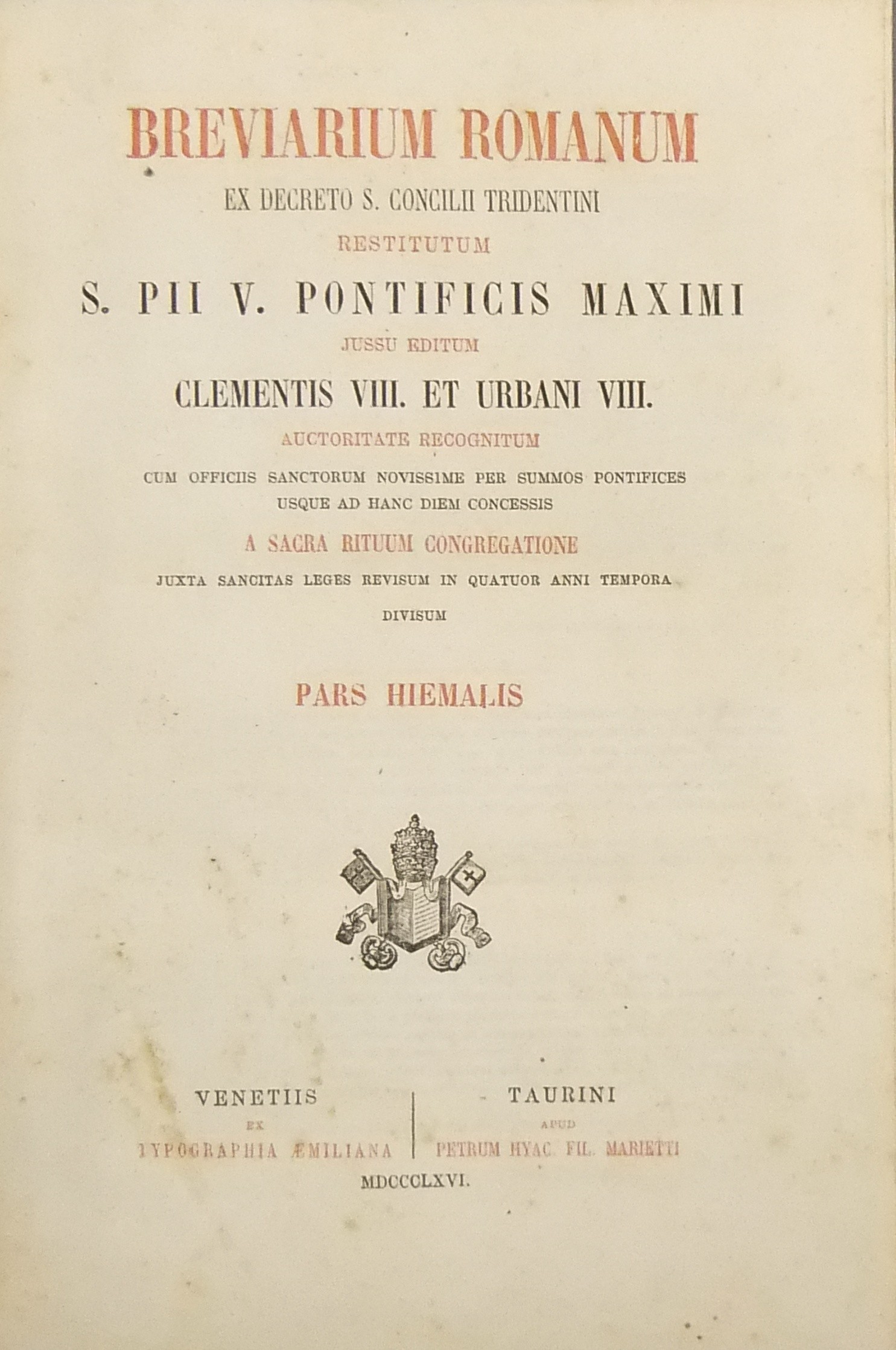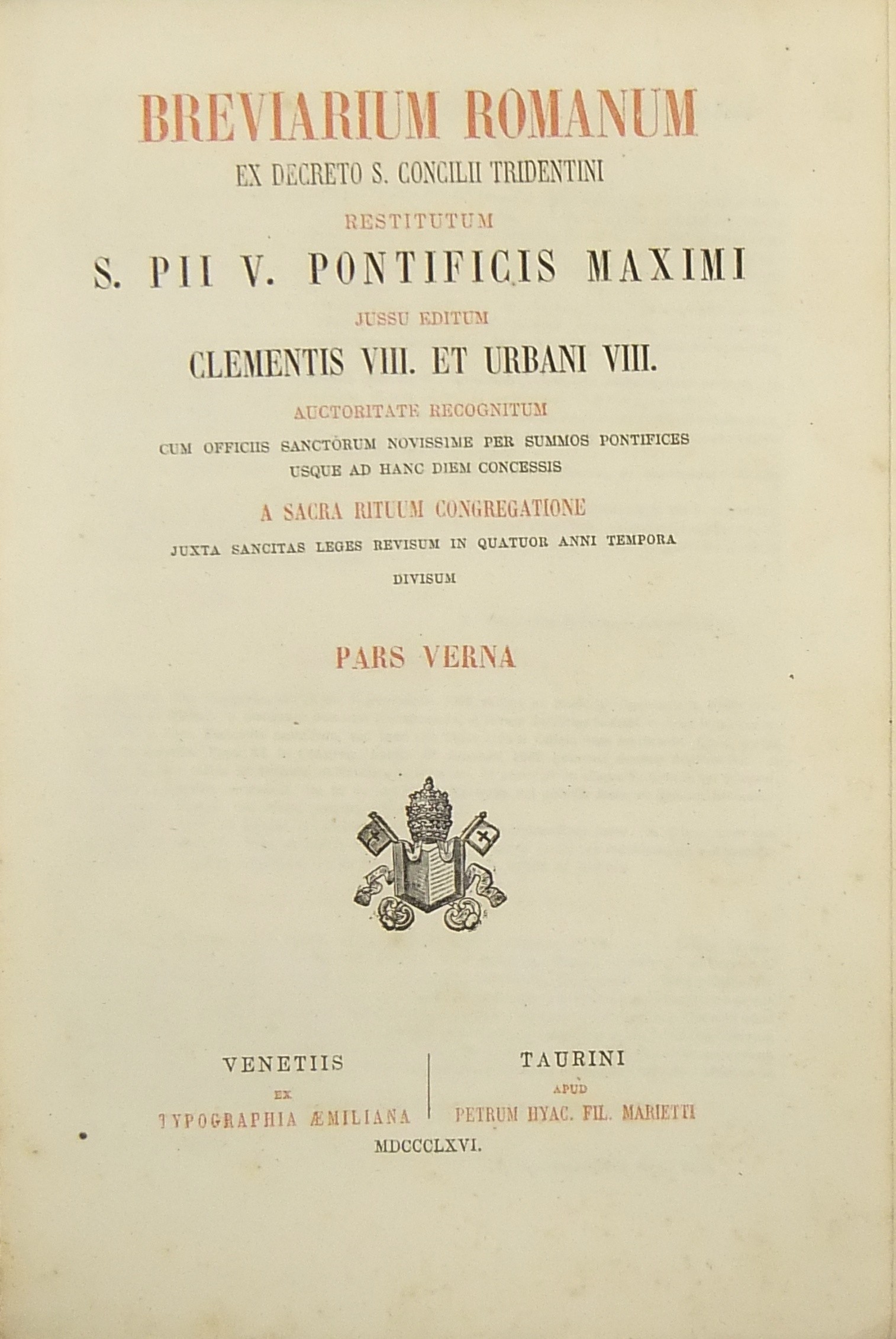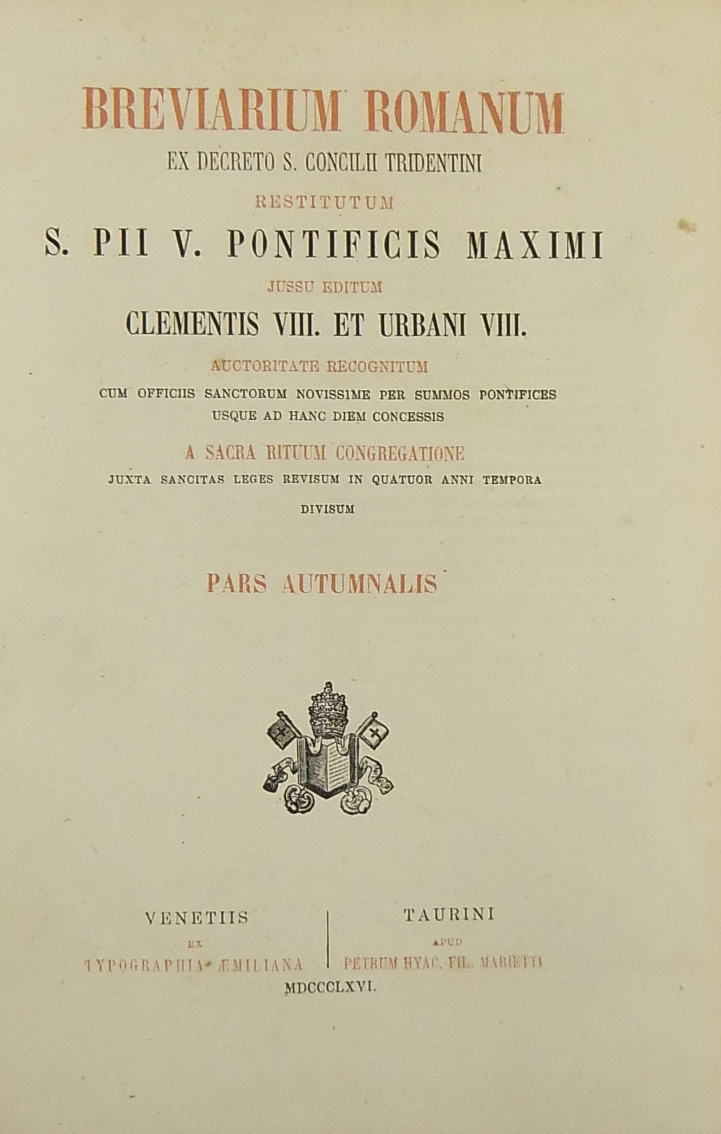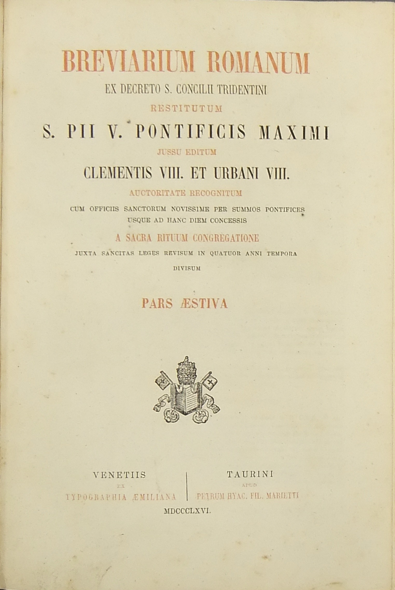 Breviarium romanum ex decreto S. Concilii Tridentini restitutum S. PII V Pontificis Maximi jussu editum Clementis VIII et Urbani VIII ... (Pars Hiemalis - Paes Aestiva - Pars Autumnalis - Pars Verna)