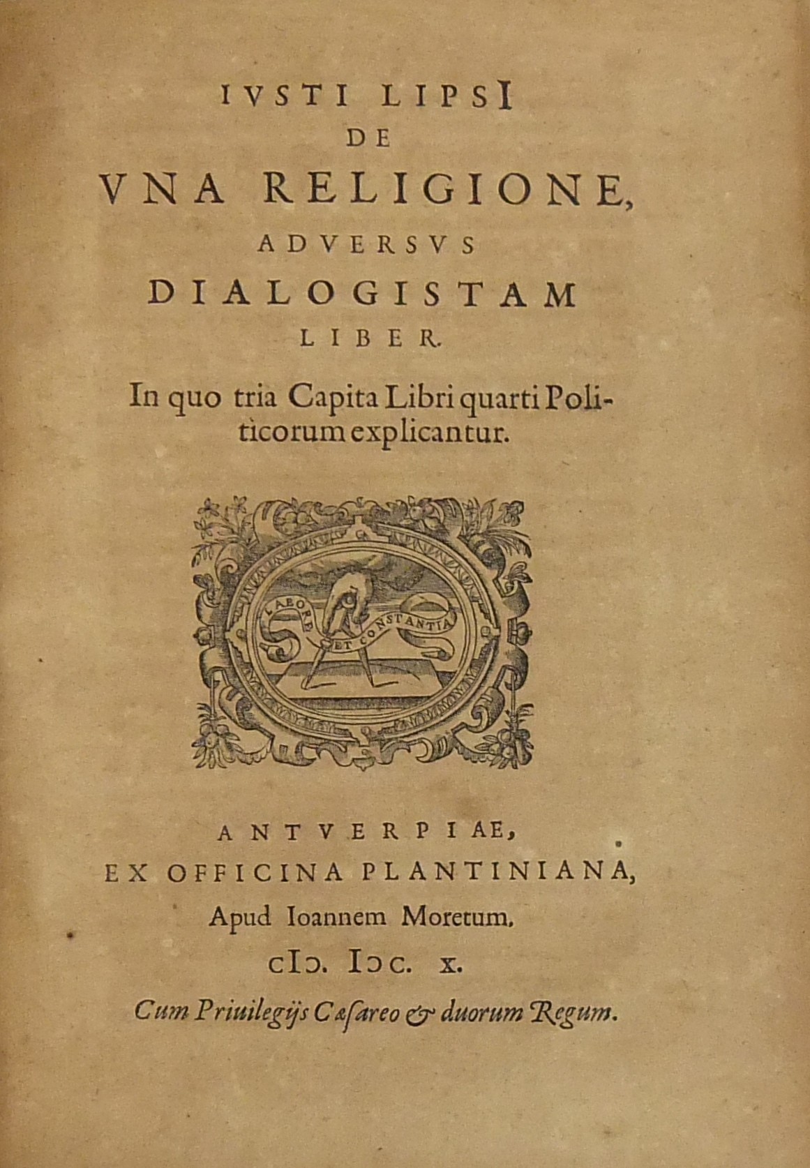 Iusti Lipsi Politicorum sive civilis doctrinae libri sex. Qui ad Principatum maxime spectant. Additae Notae auctiores tum et De una religione liber. Omnia postremo Auctor recensuit. UNITO A: Iusti Lipsi: Ad libros politicorum notae, et de una religione liber. Aucta omnia & innouata