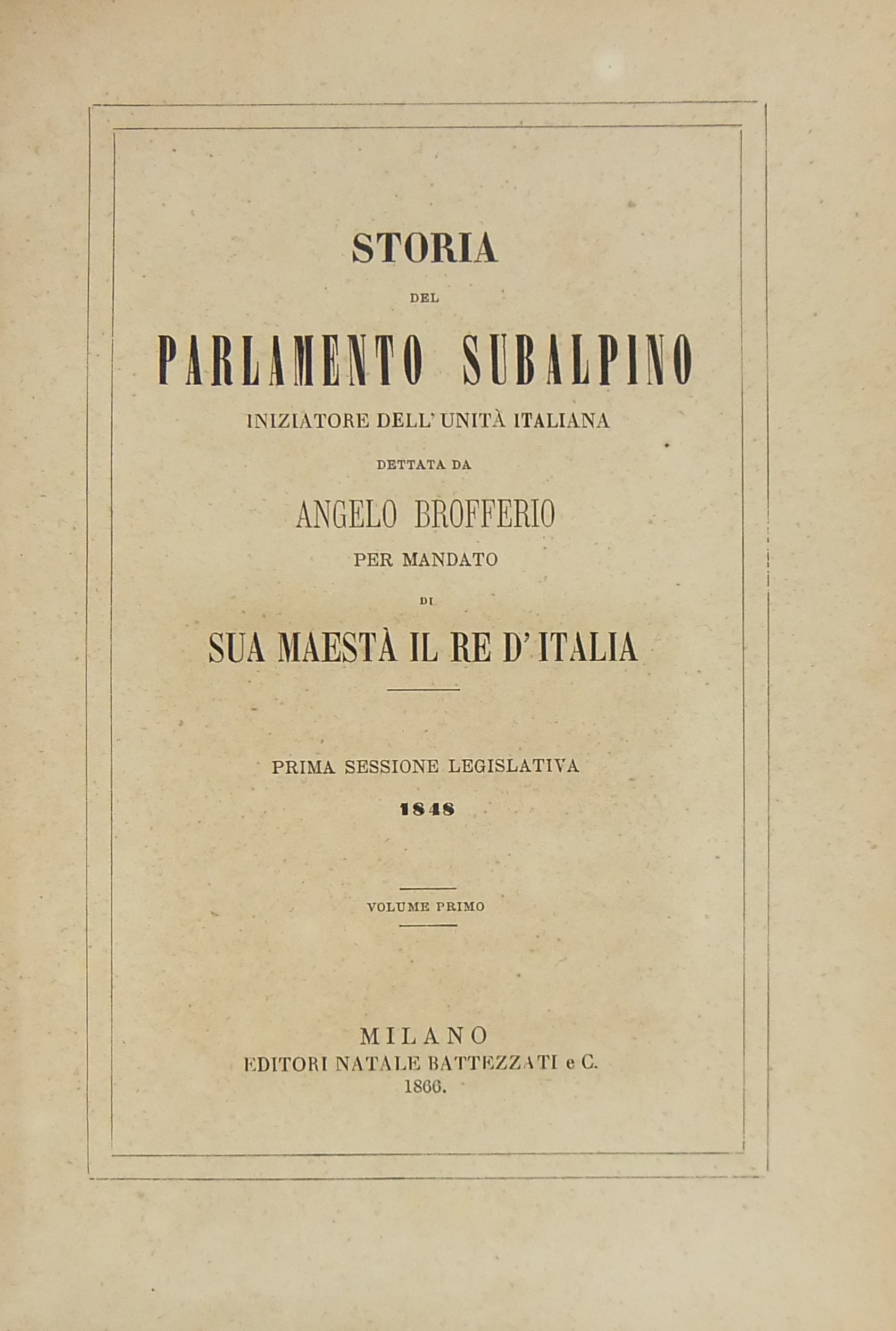 Storia del Parlamento Subalpino iniziatore dell'unità d'Italia. Dettata da Angelo Brofferio per mandato di Sua Maestà il Re d'Italia. Vol. I e II - Prima sessione legislativa 1848. Vol. III e IV - Seconda sessione del 1849 e sessione del 1850. Vol. V - Sessione del 1851. Vol. VI - Sessione del 1852