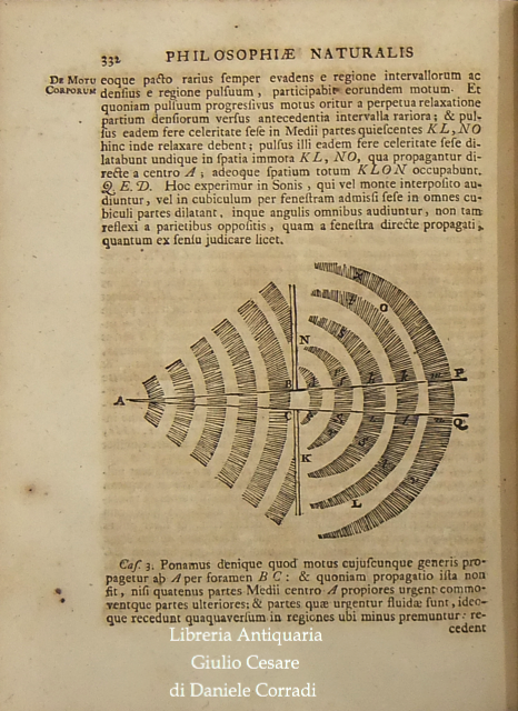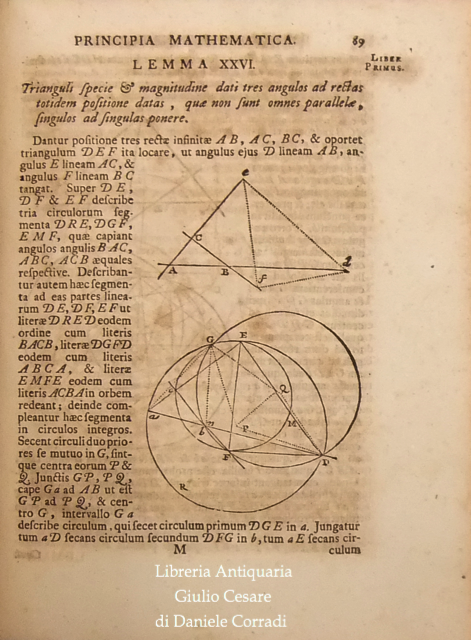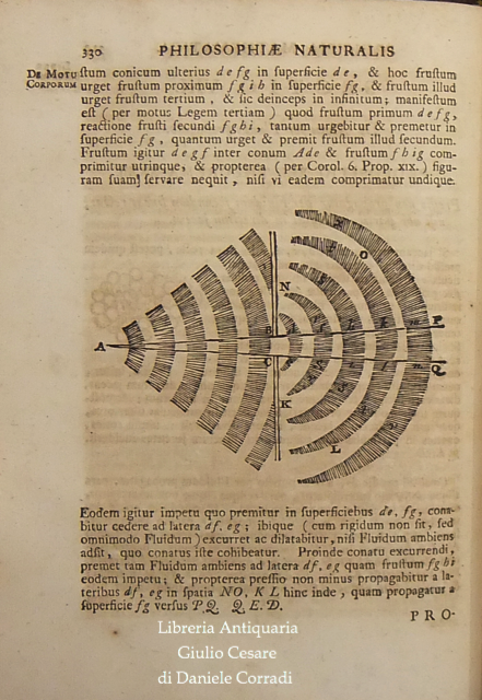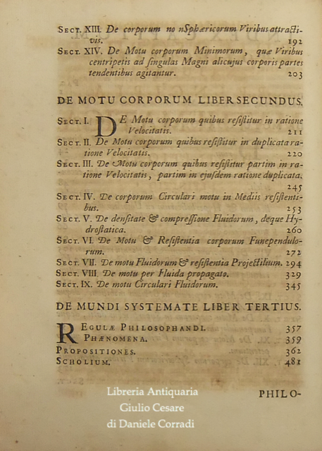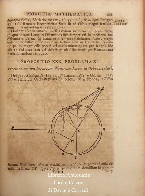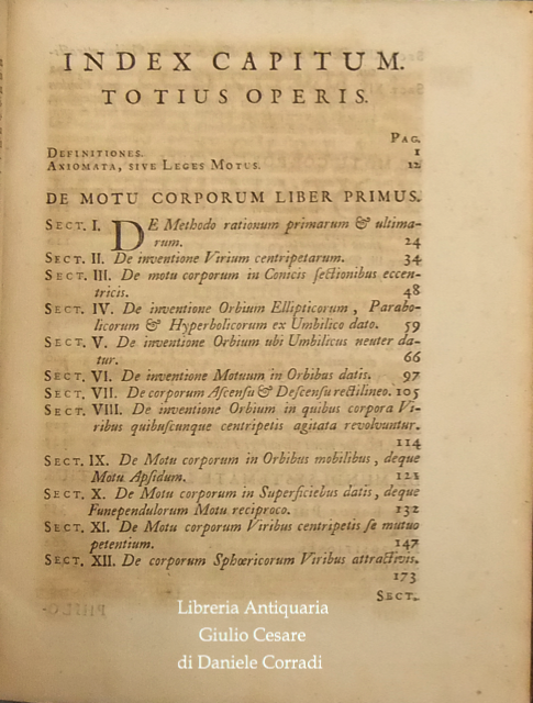 L'Autore in quest'opera suddivisa in tre libri (nei primi due espone il moto dei corpi e dei mezzi di contrasto quali aria e acqua e nel terzo descrisse la legge di gravitazione universale) stabilì i fondamenti per la meccanica classica. Nei Principia Newton compie l'unificazione tra la fisica galileiana e l'astronomia di Keplero. Marca calcografica della Compagnie des Libraires di Amsterdam sul frontespizio (Due mani uscenti da nuvole strette davanti a fascio littorio che regge una bilancia con due putti seduti su casse ai lati. In basso cornucopie. In alto motto in cartiglio che cita: "Vis Unita Major". Tavola grande ripiegata raffigurante l'orbita della cometa, che secondo la tesi di Newton poteva essere non solo ellittica, ma anche iperbolica e parabolica. Alle prime carte dedica a Carlo II, a seguire un poemetto di E.D. Halley a Newton e due prefazioni di Newton, datate "Maii 8, 1686" e "Mar. 28, 1713"; poi la prefazione editoriale curata da Rogerus Cotes (Roger Cotes, professore di astronomia e filosofia sperimentale del Trinity College), datata "Cantabrigiae Maii 12, 1713" e infine lo "Index Capitum totius operis".