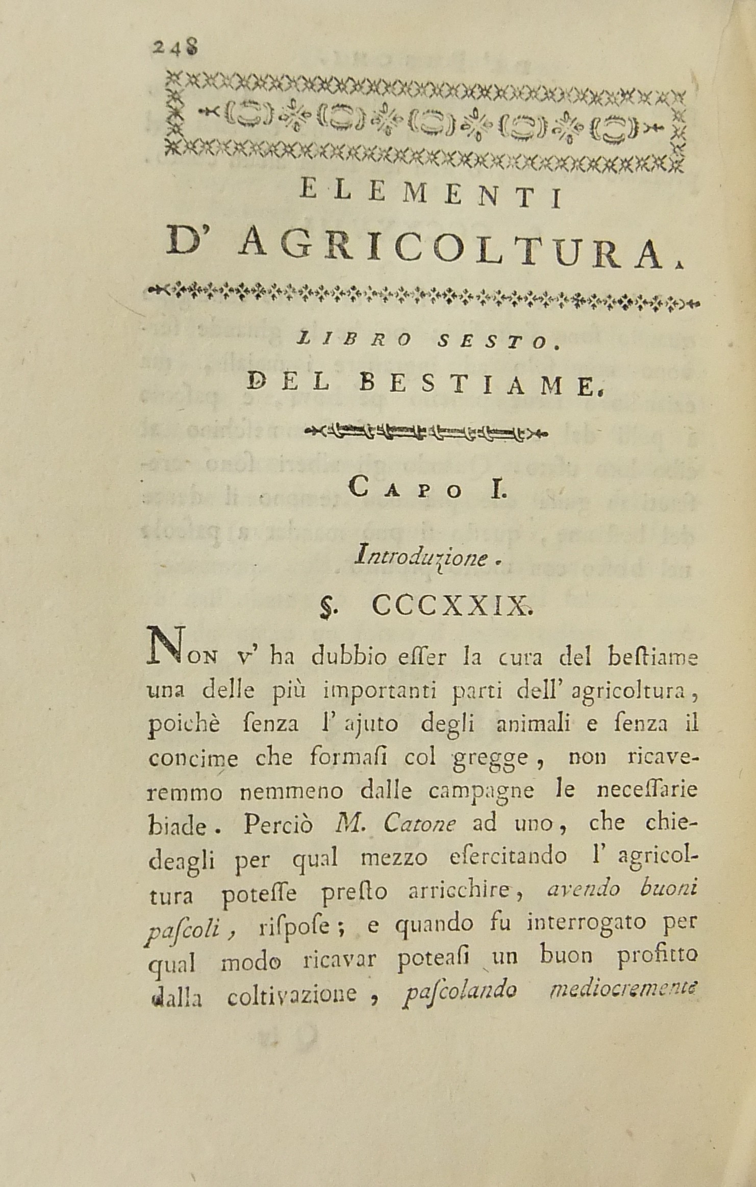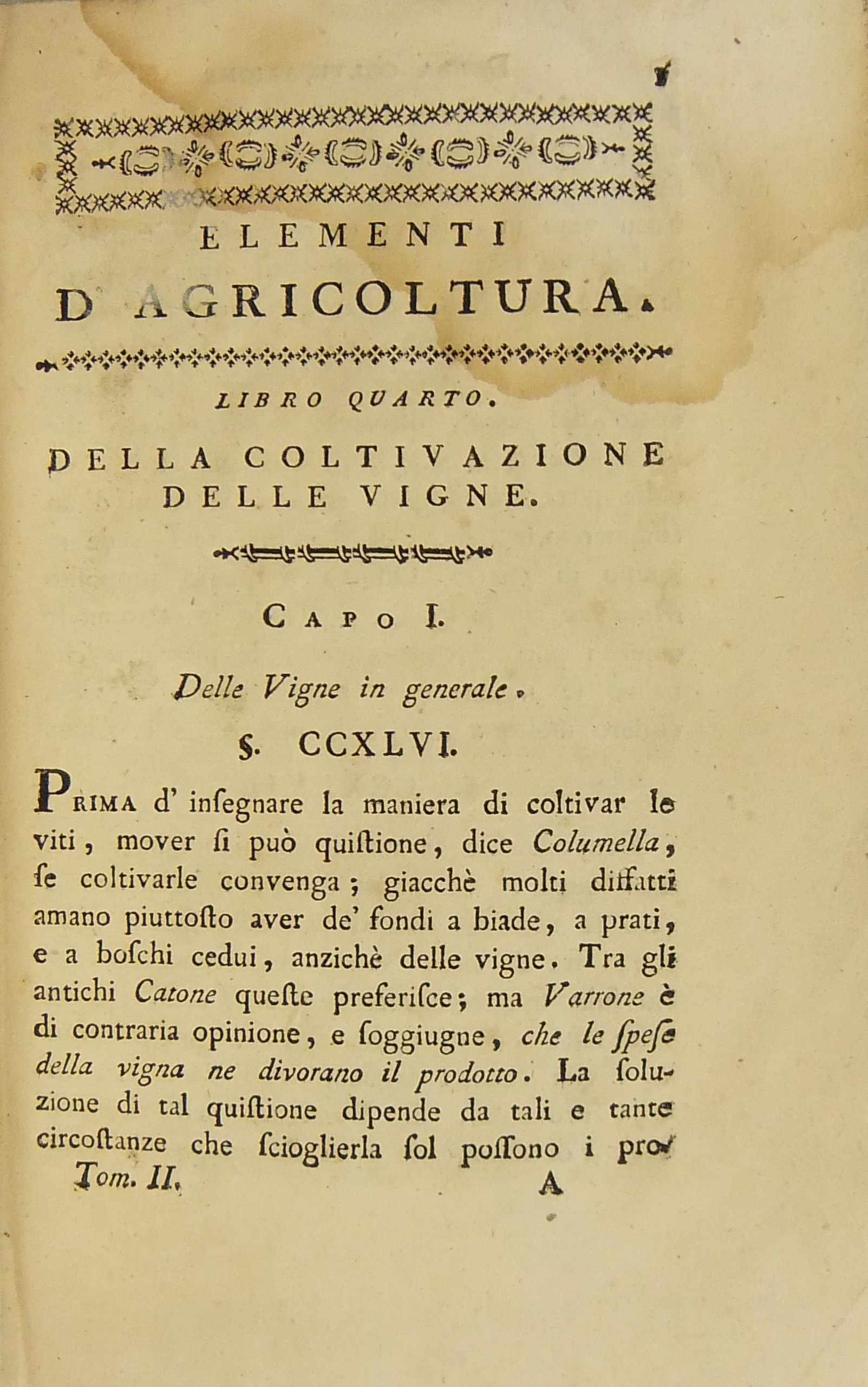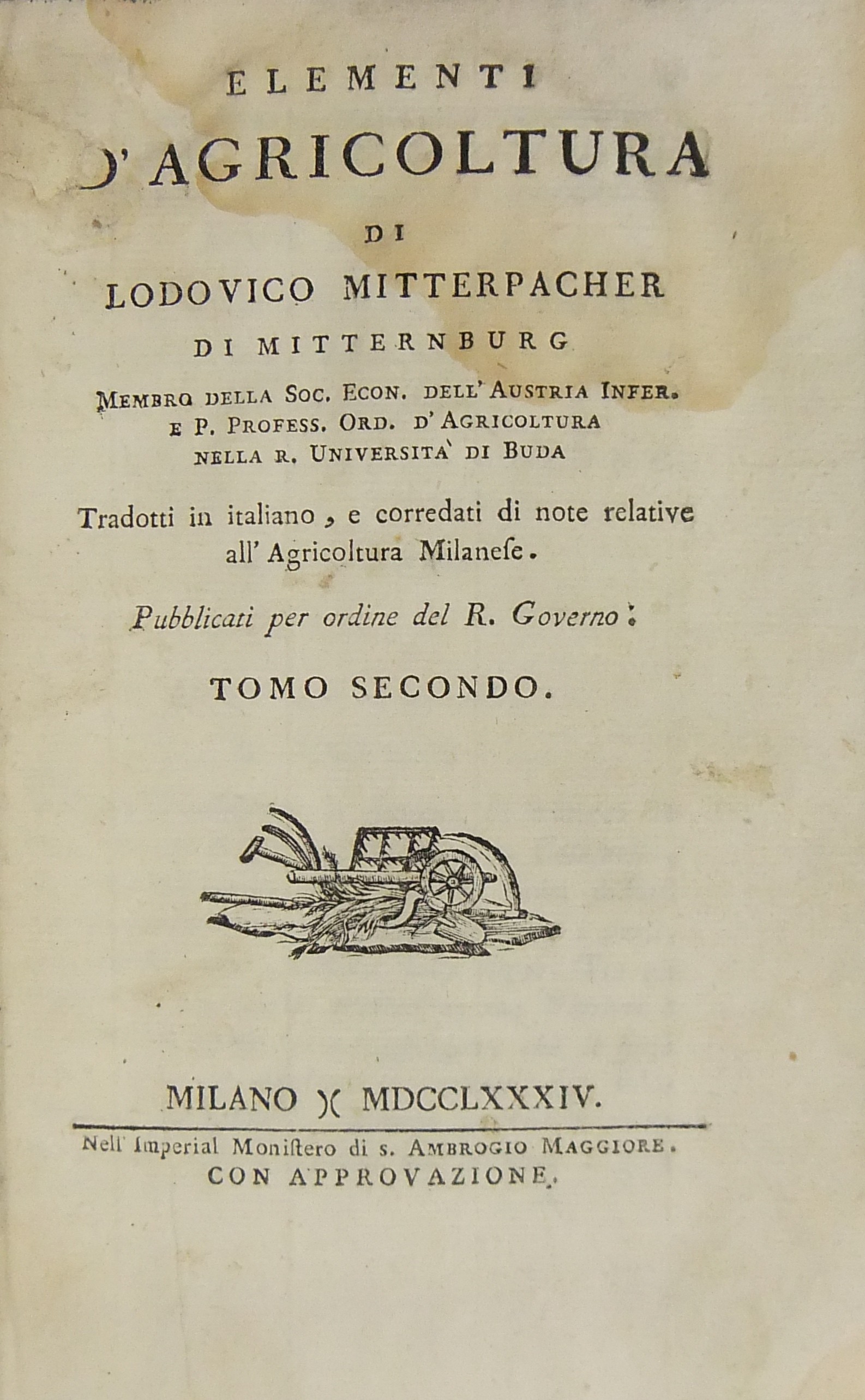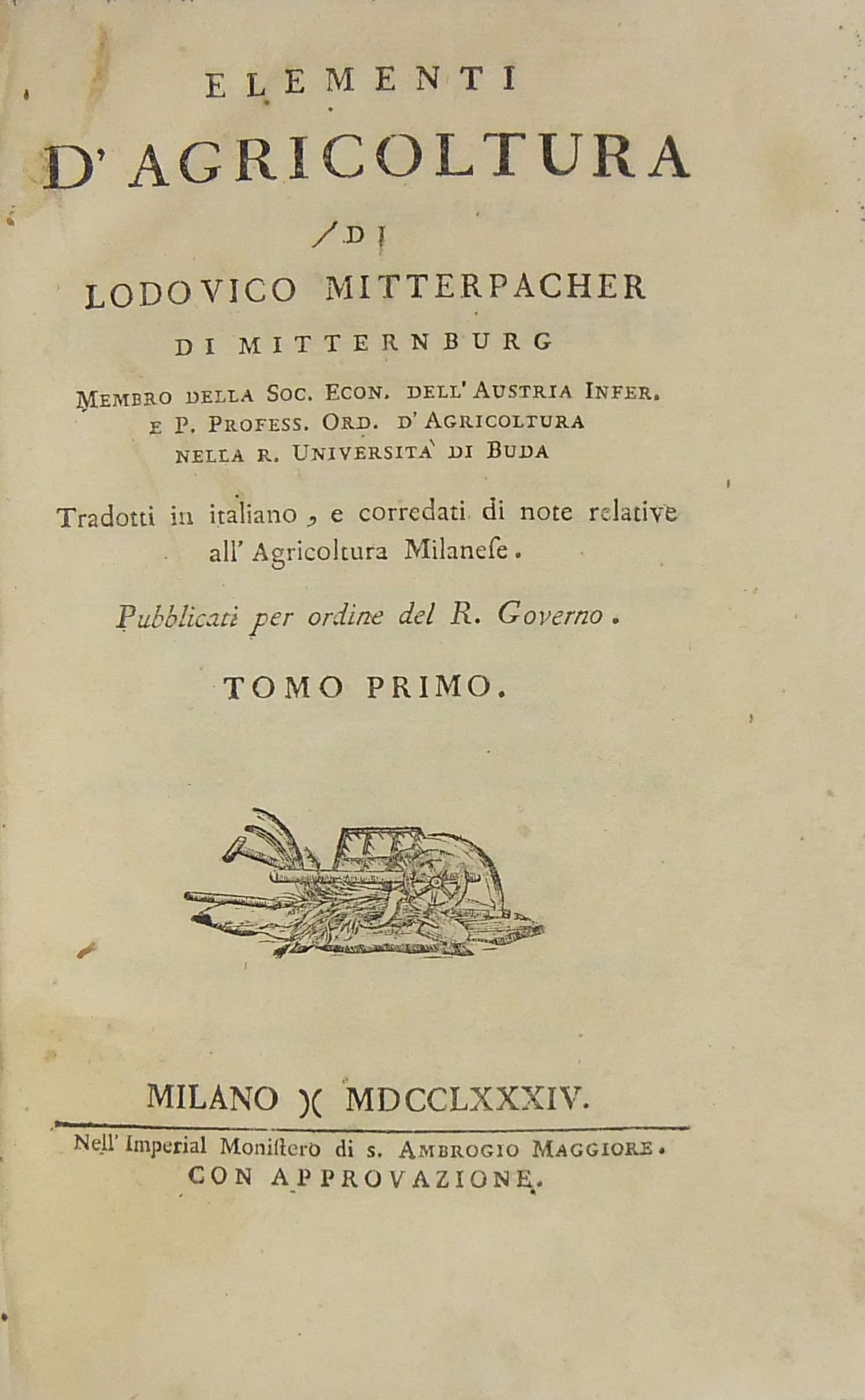 Elementi d'agricoltura ... Tradotti in italiano, e corredati di note relative all'agricoltura milanese. Pubblicate per ordine del R. Governo. Libro I - Introduzione alla storia fisica delle piante; Libro II - Della coltivazione de' campi; Libro III - Della coltivazione degli orti; Libro IV - Della coltivazione delle vigne; Libro V - Della coltivazione de' boschi; Libro VI - Del bestiame; Libro VII - Degli altri animali che fanno parte della coltivazione; Libro VIII - Dell'educazione delle api, e de' filugelli.