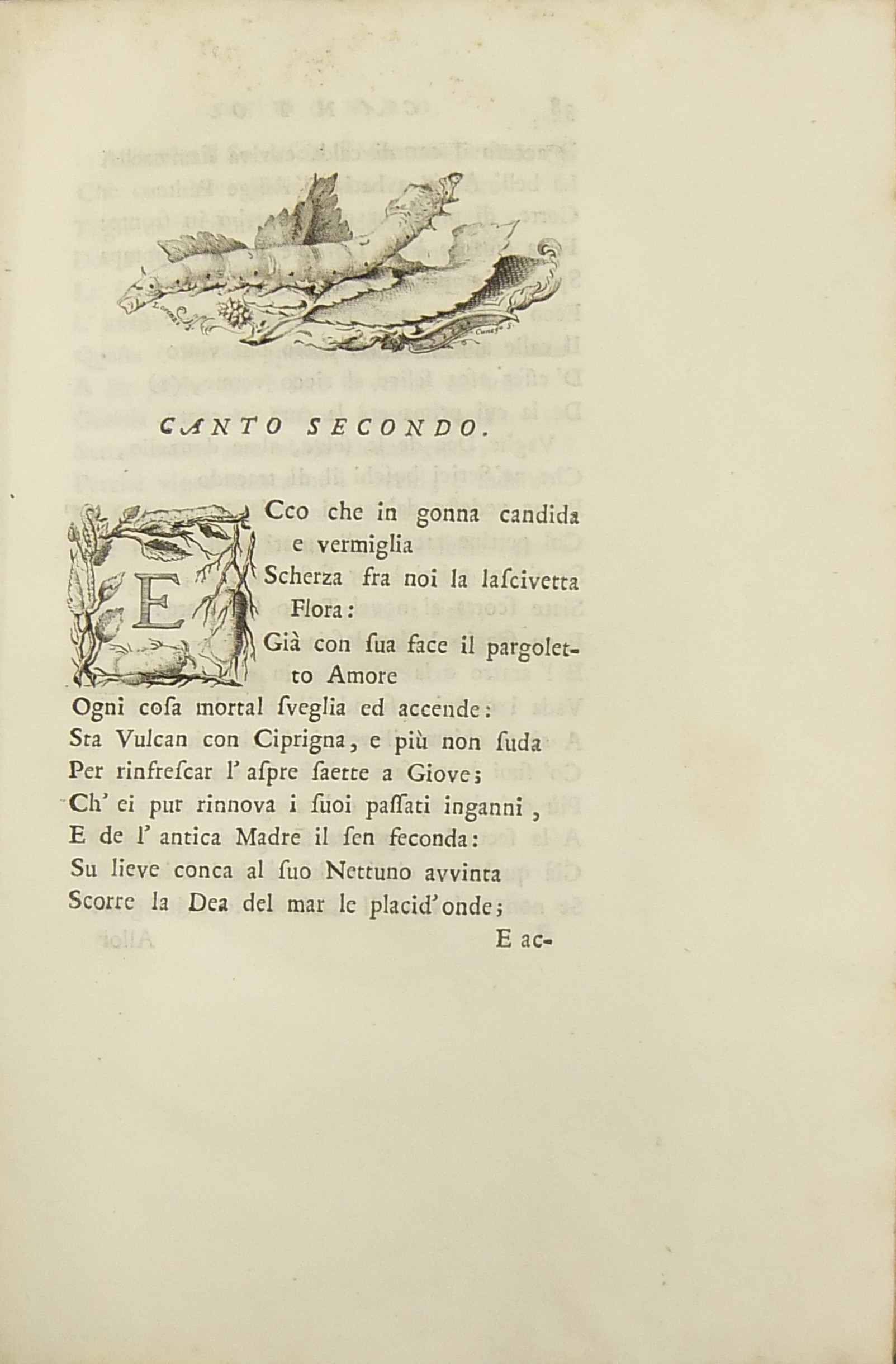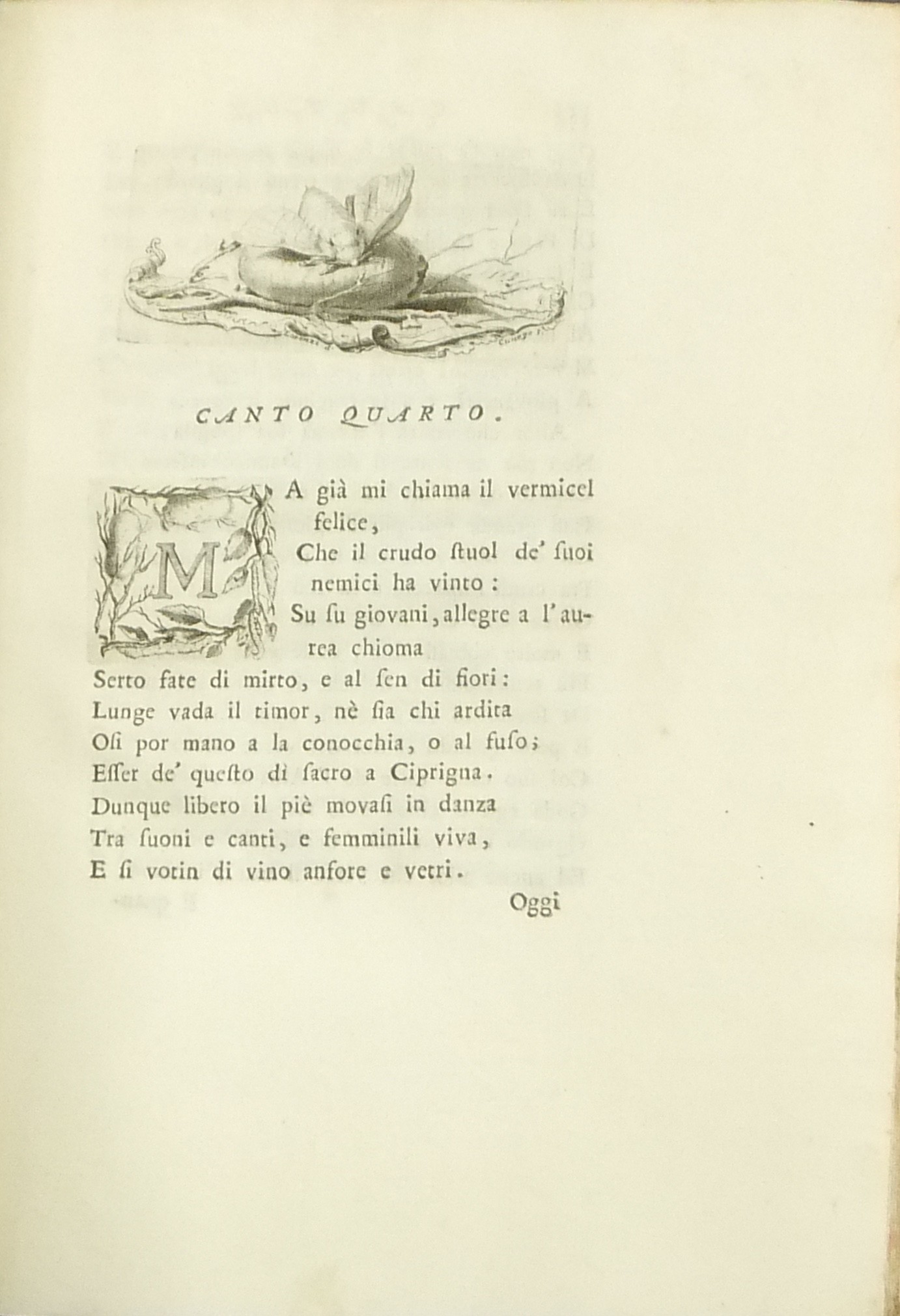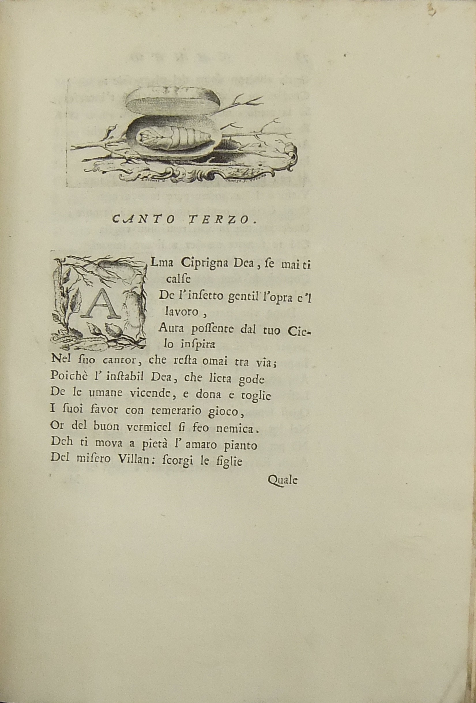 Il nome dell’Autore figura nella dedica. Vignetta calcografica sul frontespizio, iniziali, testatine e finalini incisi da Domenico Cunego su disegno di Francesco Lorenzi. Ampie annotazioni a stampa da pag. 147 a 214. Poema didascalico diviso in quattro canti in versi sciolti avente come oggetto l’allevamento dei bachi da seta
