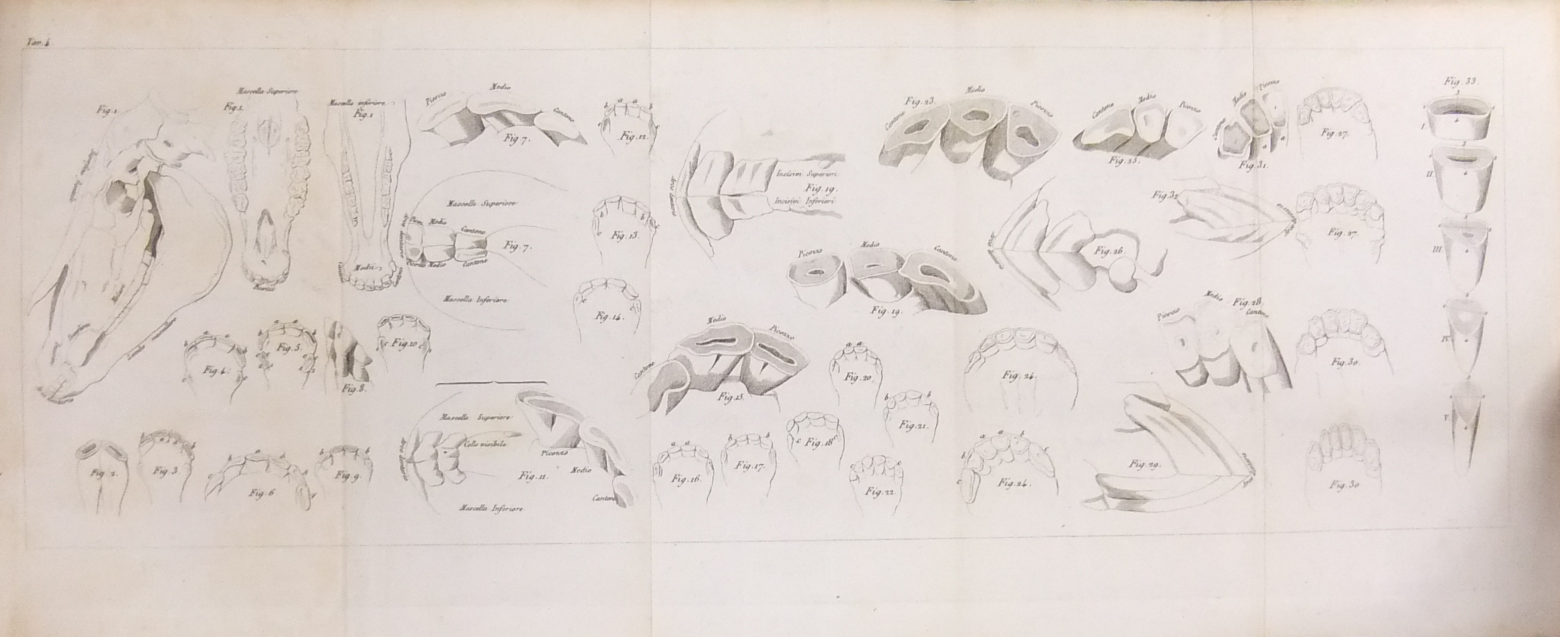 Con 4 tavole divise in 2 grandi ripiegate, contenenti anche 33 figure raffiguranti dentature dei cavalli, ferri, selle, redini, etc