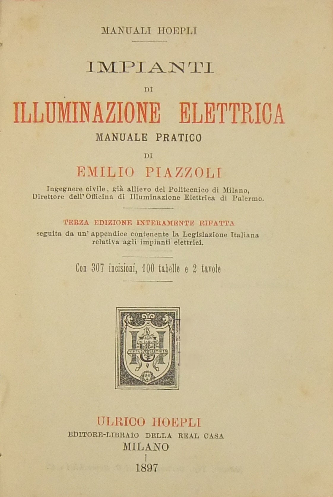Terza edizione interamente rifatta seguita da un'appendice contenente la Legislazione Italiana relativa agli impianti elettriciLuogo: Milano