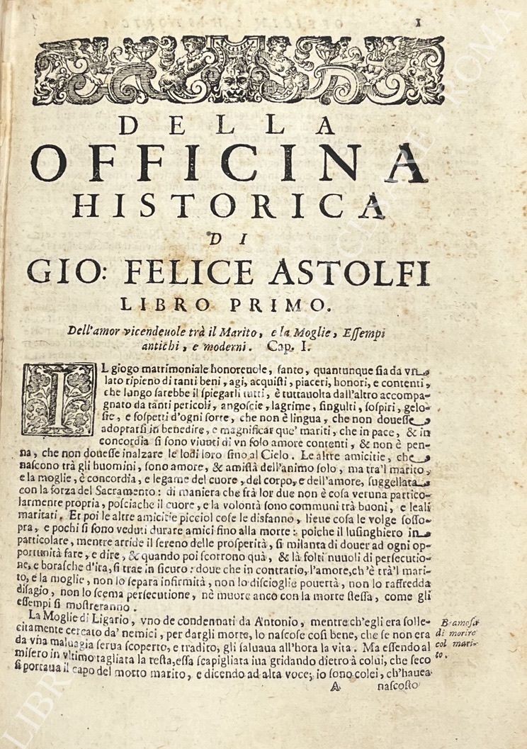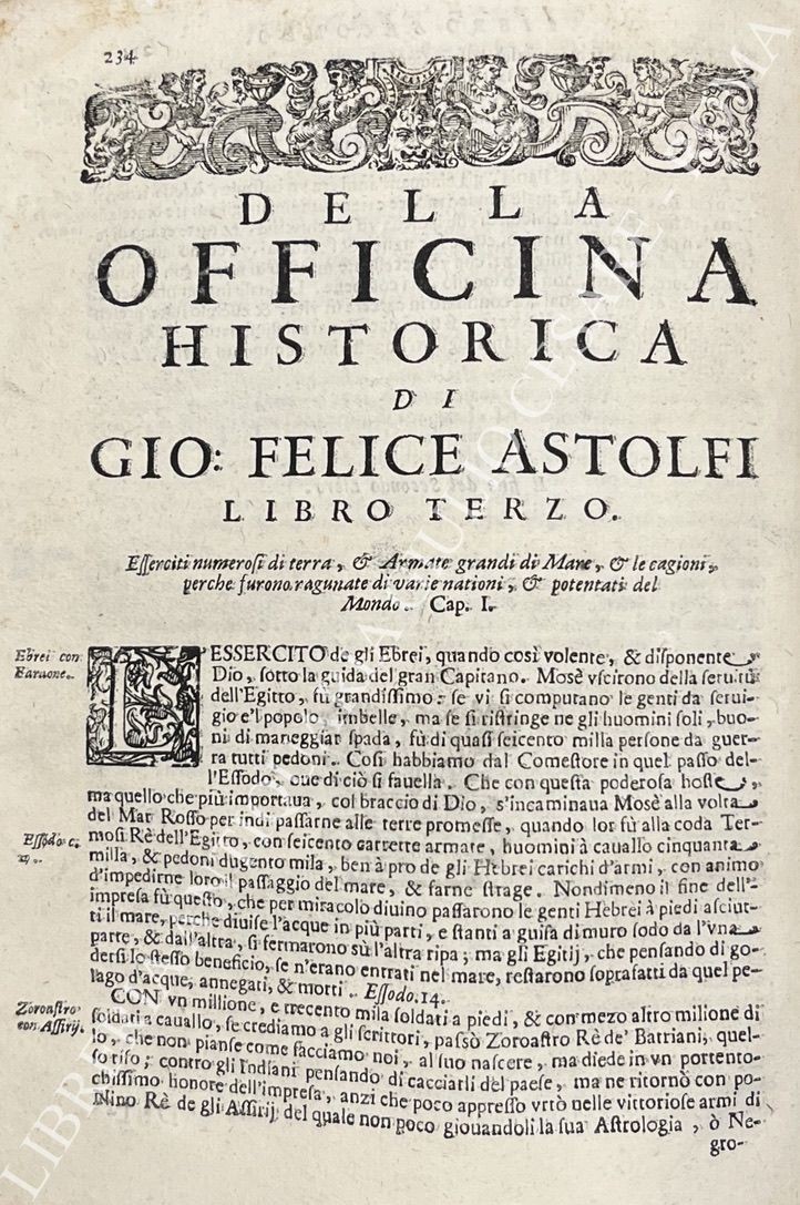 Della officina historica di Gio: Felice Astolfi, libri quattro. Nella quale si spiegano Essempi notabilissimi, Antichi & Moderni, a Virtù, & a Diffetto pertinenti... Aggiuntevi nel fine le Notitie del Mondo di LVCIO AMPELIO: Illustrate maggiormente con una nuova Tavola in quest'ultima Impressione
