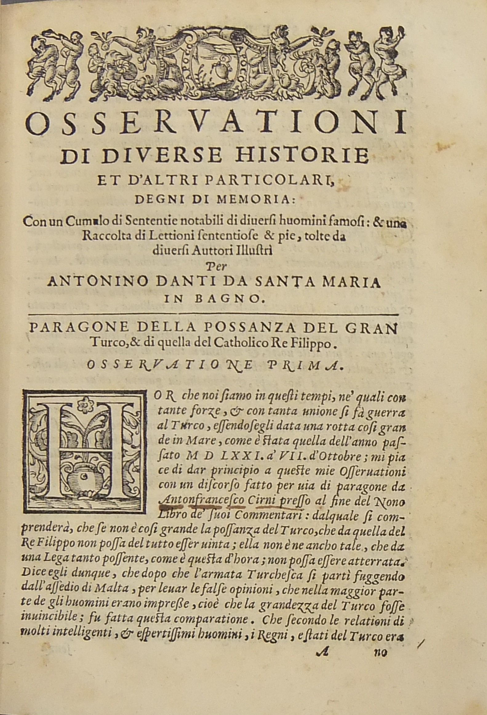 Osservationi di diverse historie et d'altri particolari degni di memoria: Con un Cumulo di sententie notabili di molti huomini famosi: & con una Raccolta di Lettioni sententiose & pie, tolte da piu Auttori Illustri per Antonino Danti da Santa Maria in Bagno al molto Magnifico Signore il Sig. Iacopo Bagni