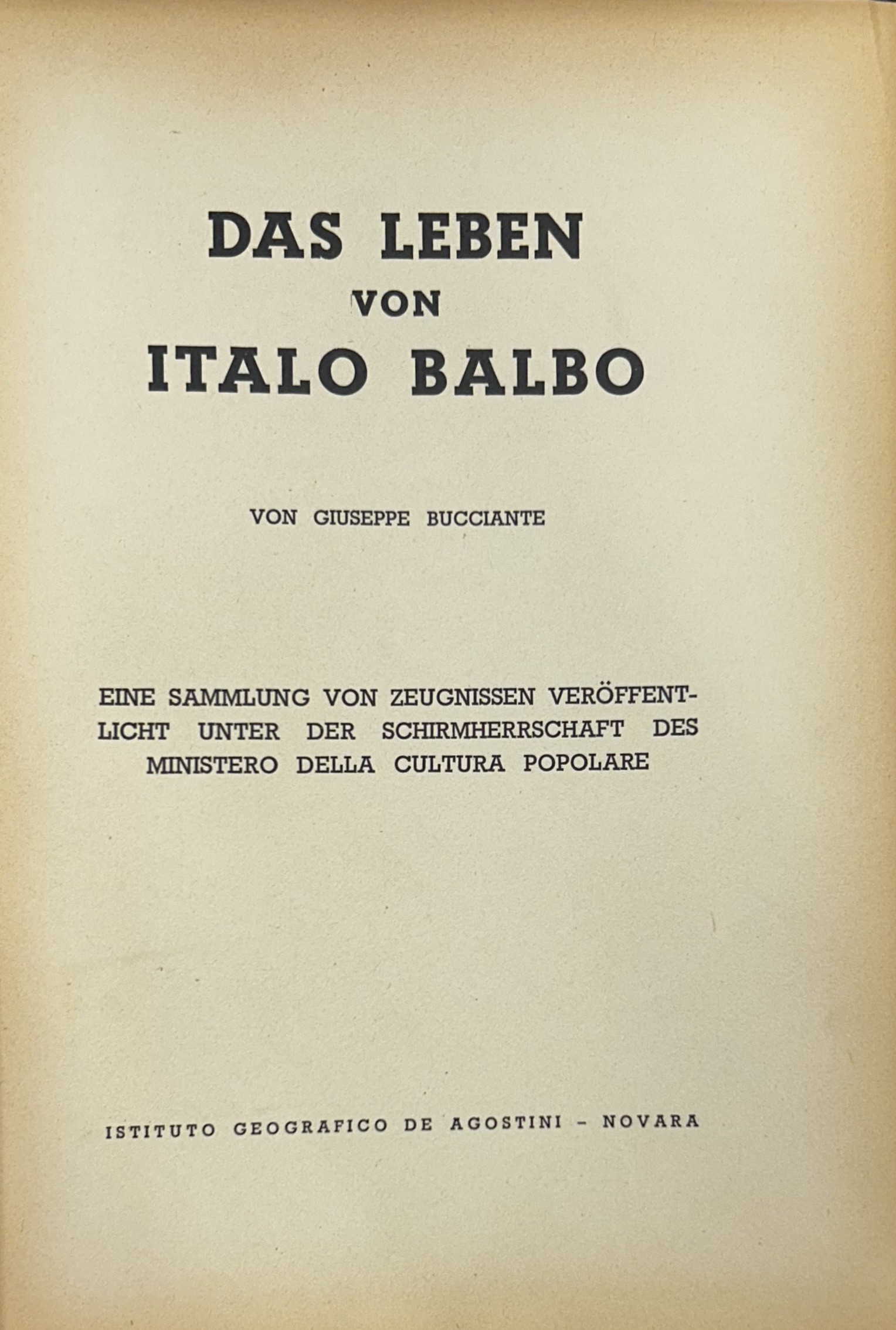 Das Leben von Italo Balbo. Eine Sammlung von Zeugnissen veroffentlicht unter der Schirmherrschaft des Ministero della Cultura Popolare