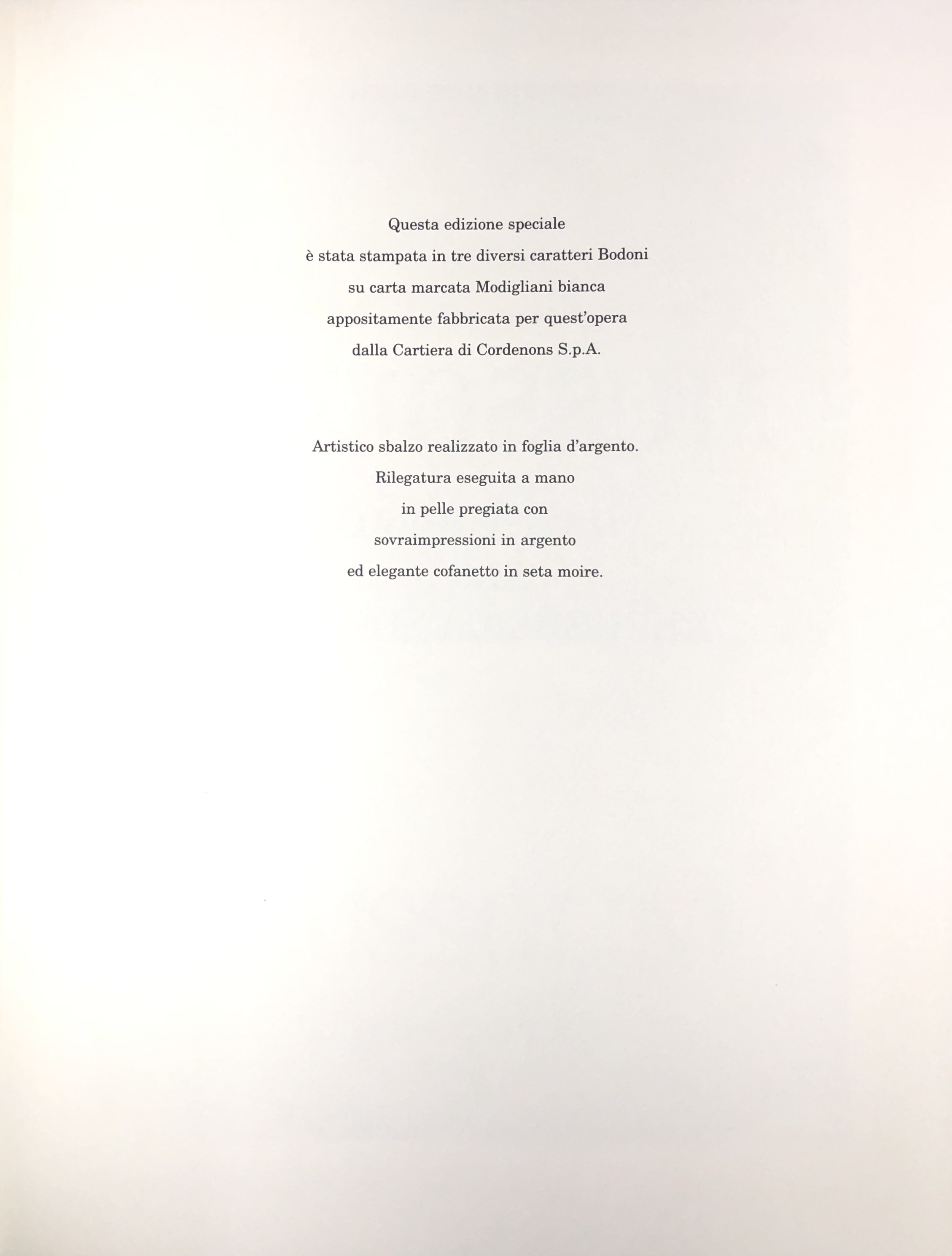 Edizione speciale stampata in tre distinti caratteri Bodoni, su carta marcata Modigliani prodotta dalla cartiera di Cordenons