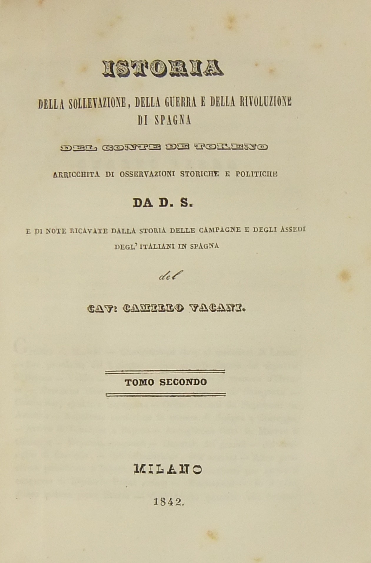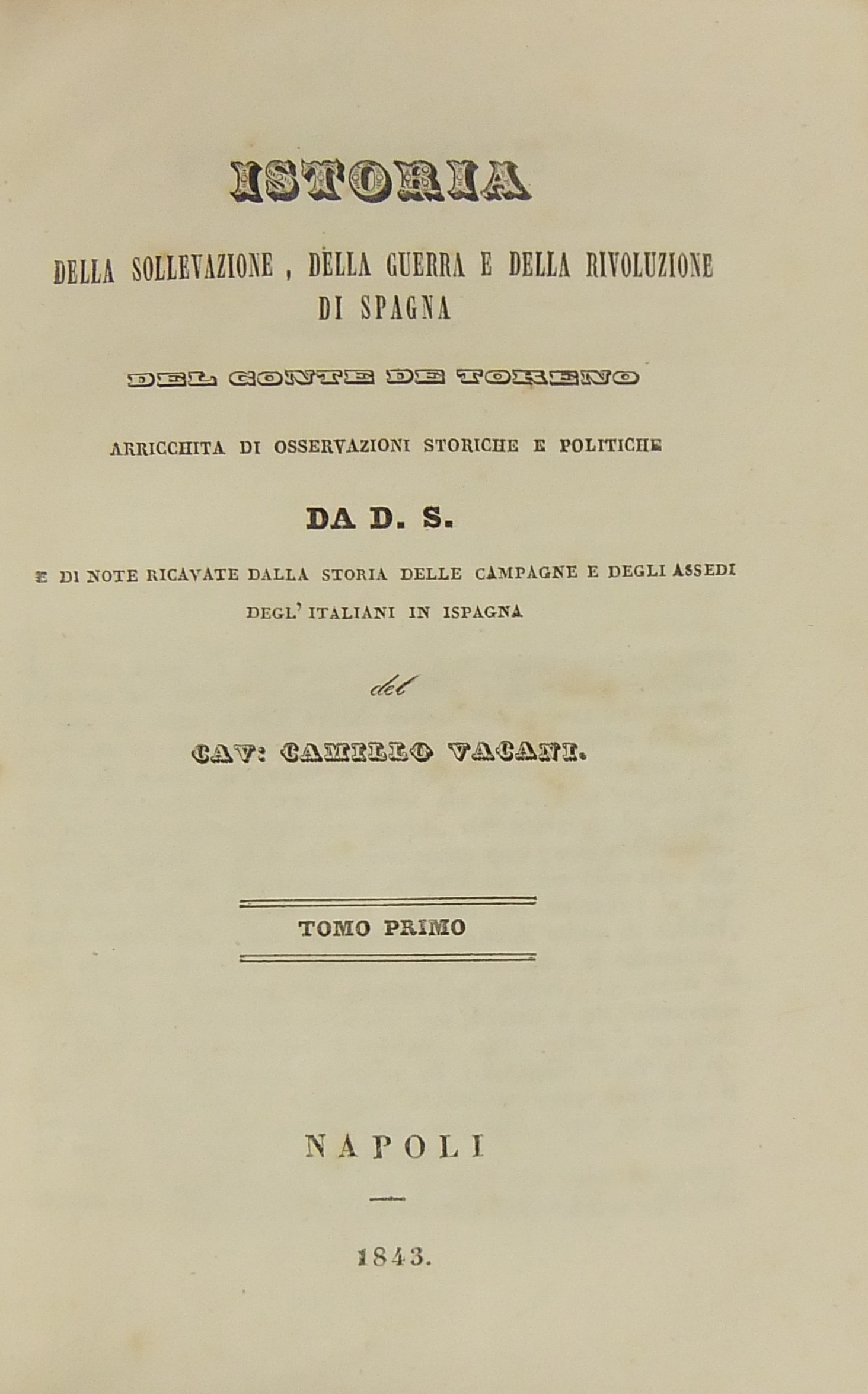 Istoria della sollevazione della guerra e della rivoluzione di Spagna del conte de Toreno arricchita di osservazioni storiche e politiche da D. S. e di note ricavate dalla storia delle campagne e degli assedi degl'italiani in Ispagna del cav. Camillo Vacani