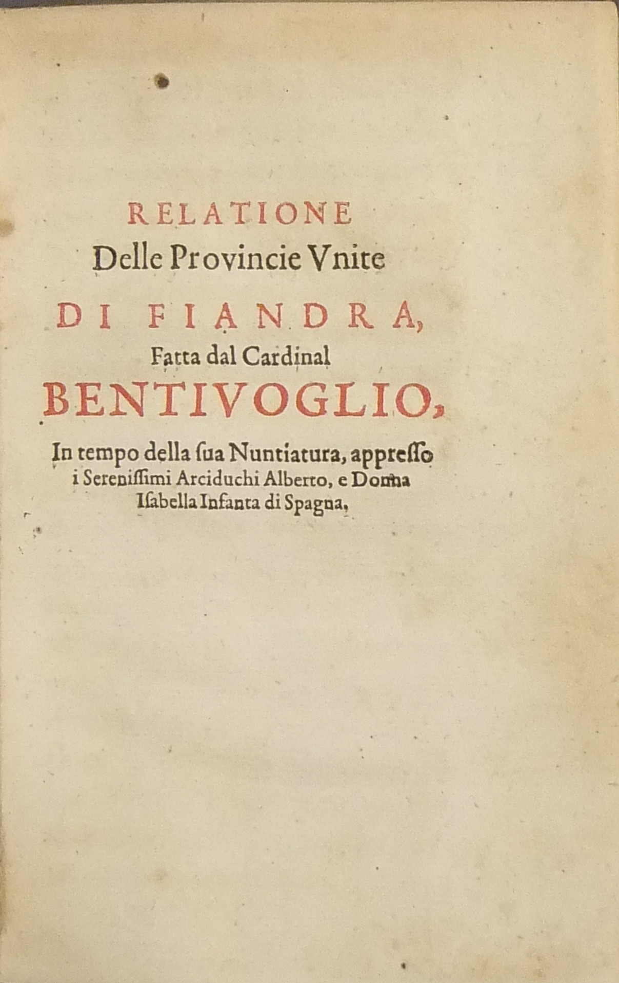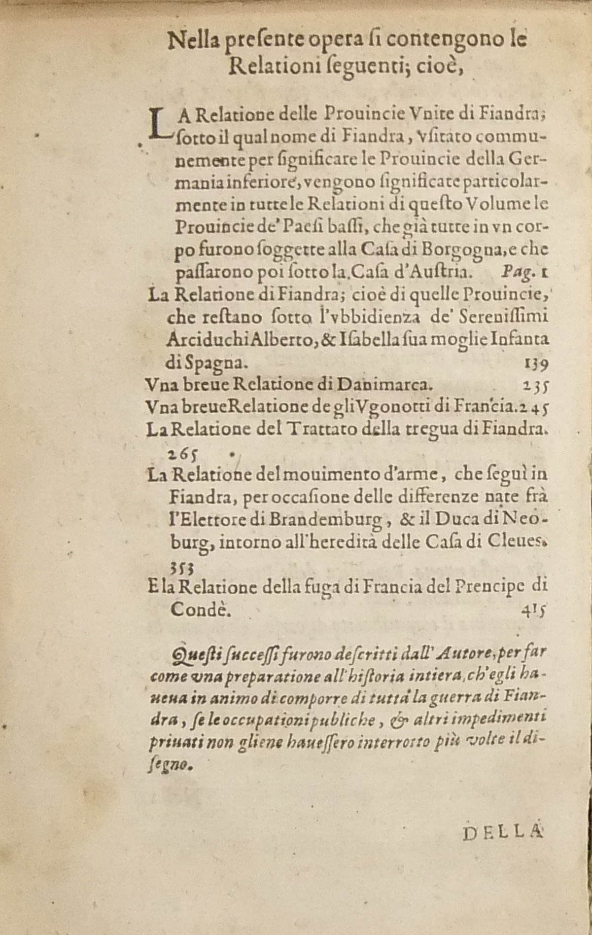 Contiene: “Della relatione delle Provincie Unite di Fiandra”; “Relatione di Fiandra cioè di quelle provincie che restano sotto l’ubbidienza dei serenissimi arciduchi Alberto e donna Isabella Infanta di Spagna sua moglie”; “Breve relatione di Danimarca”; “Breve relatione de gli Ugonotti di Francia”; “Relatione del trattato della tregua di Fiandra”; “Relatione del movimento d’arme che seguì in Fiandra”; “Relatione della fuga di Francia del Prencipe di Condè”.