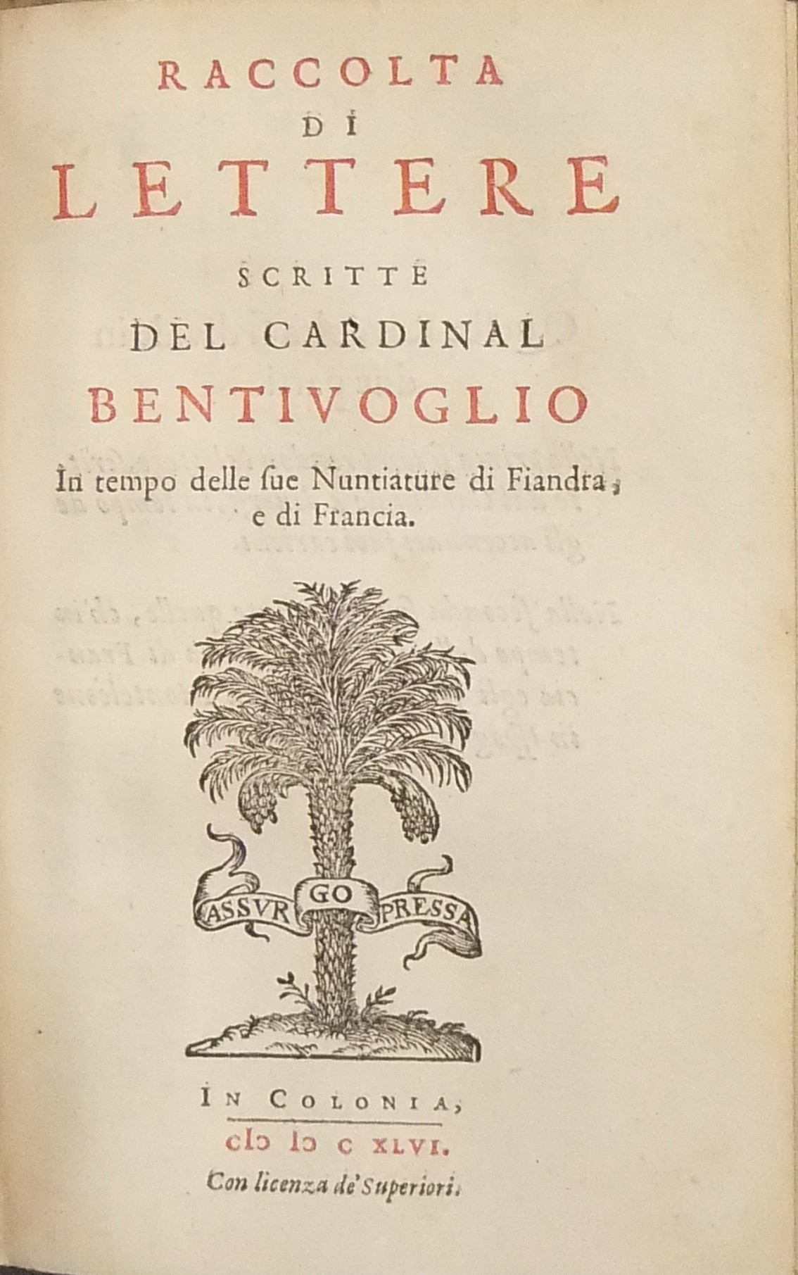 Bella marca tipografica incisa ai frontespizi bicromatici raffigurante una palma con motto che recita: "Assurgo Pressa"