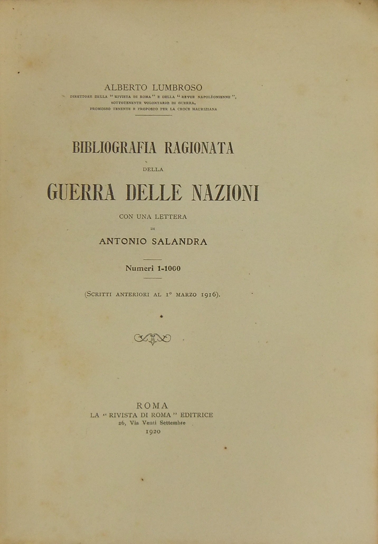Bibliografia ragionata della Guerra delle Nazioni. Con una lettera di Antonio Salandra. Numeri 1-1000 (Scritti anteriori al 1 marzo 1916)