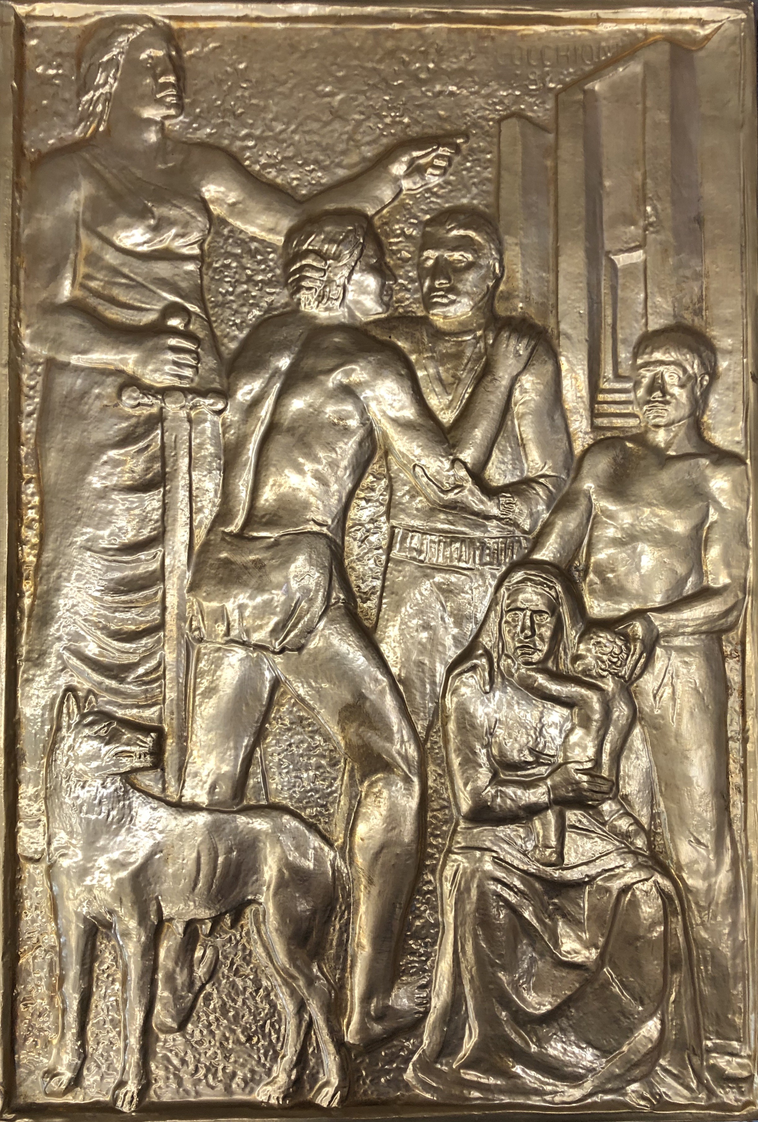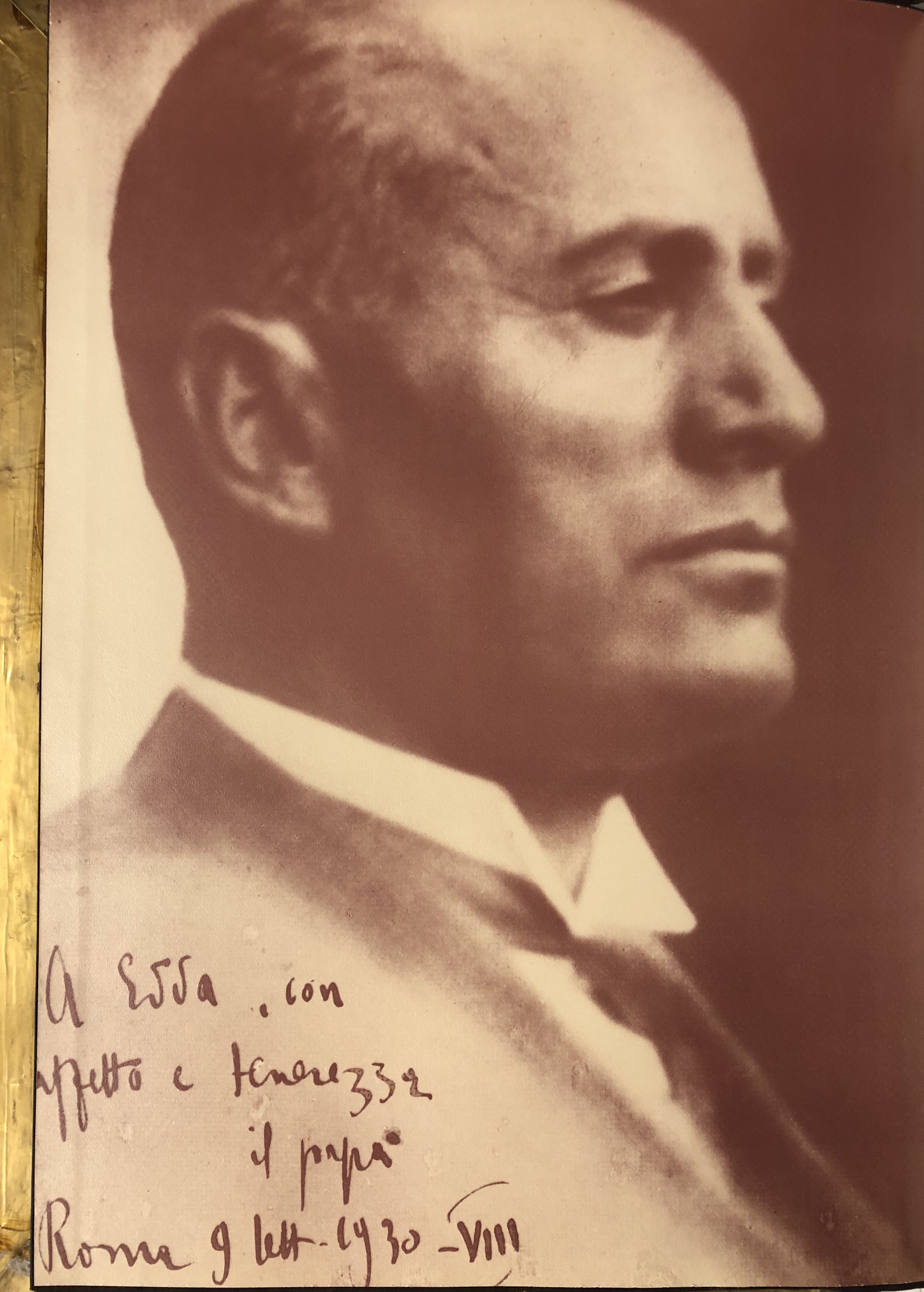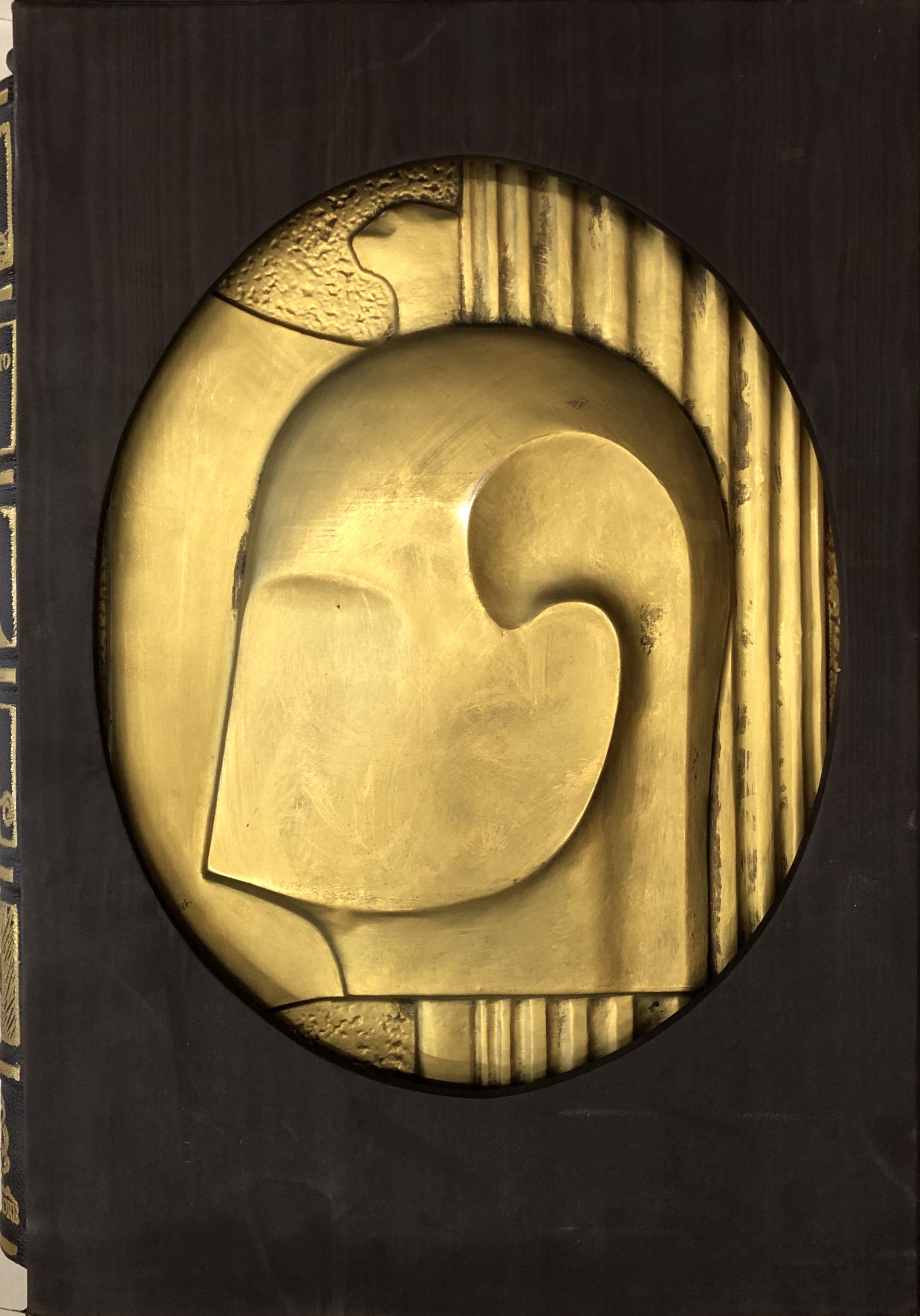 Sontuosa legatura, dorso in pelle con titoli e fregi al dorso, bassorilievi in bronzo di spessore di circa 2 cm. dell’artista Antonio Cocchioni ad entrambi i piatti. Grande cofanetto interamente ricoperto in seta viola moirée, con finestra ovale in corrispondenza della scultura anteriore che rimane in tal modo visibile