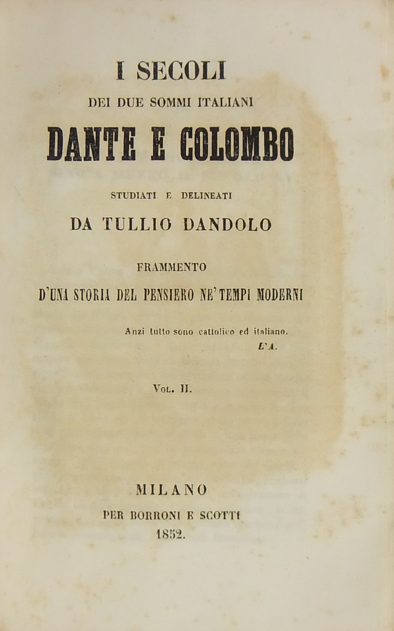 I secoli dei due sommi italiani Dante e Colombo.. Frammento d'una storia del pensiero ne' tempi moderni