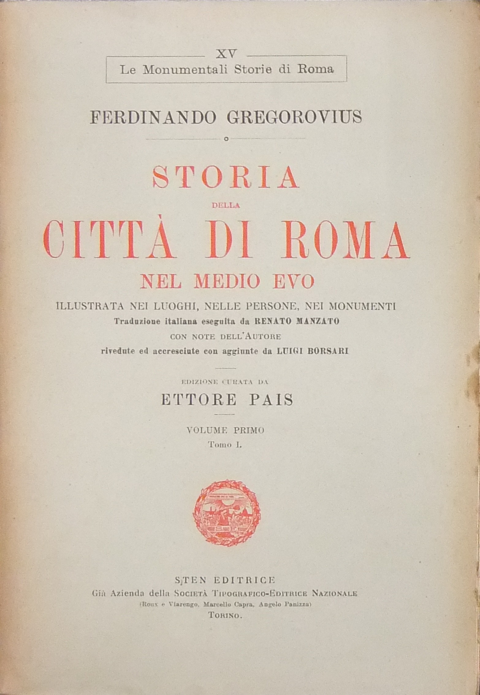 Storia della città di Roma nel Medio Evo. Illustrata nei luoghi, nelle persone, nei monumenti. Traduzione italiana eseguita da Renato Manzato. Con note dell'Autore rivedute ed accresciute con aggiunte da Luigi Borsari. Edizione curata da Ettore Pais