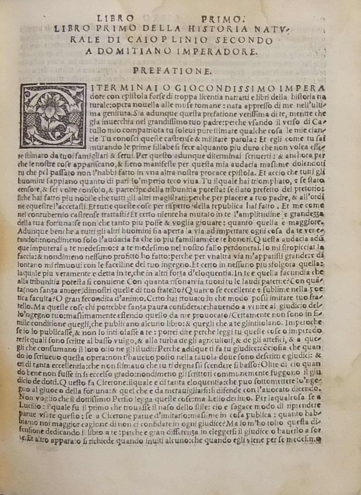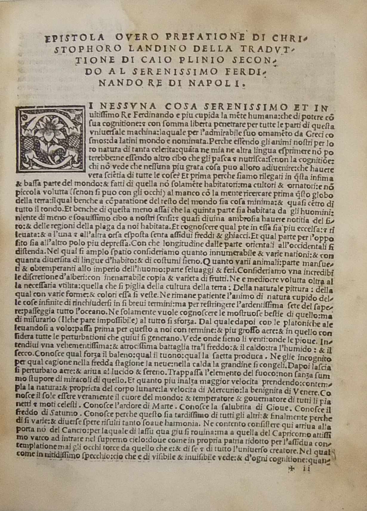 Historia naturale di C. Plinio Secondo di latino in volgare tradotta per Christophoro Landino, nuouamente in molti luoghi, doue quella mancaua, supplito, & da infiniti errori emendata, & con somma diligenza corretta, con la tauola similmente castigata, & aggiuntoui molti capitoli, che nelle altre impressioni non erano. Aggiontoui anchora di nuouo la sua vita ...