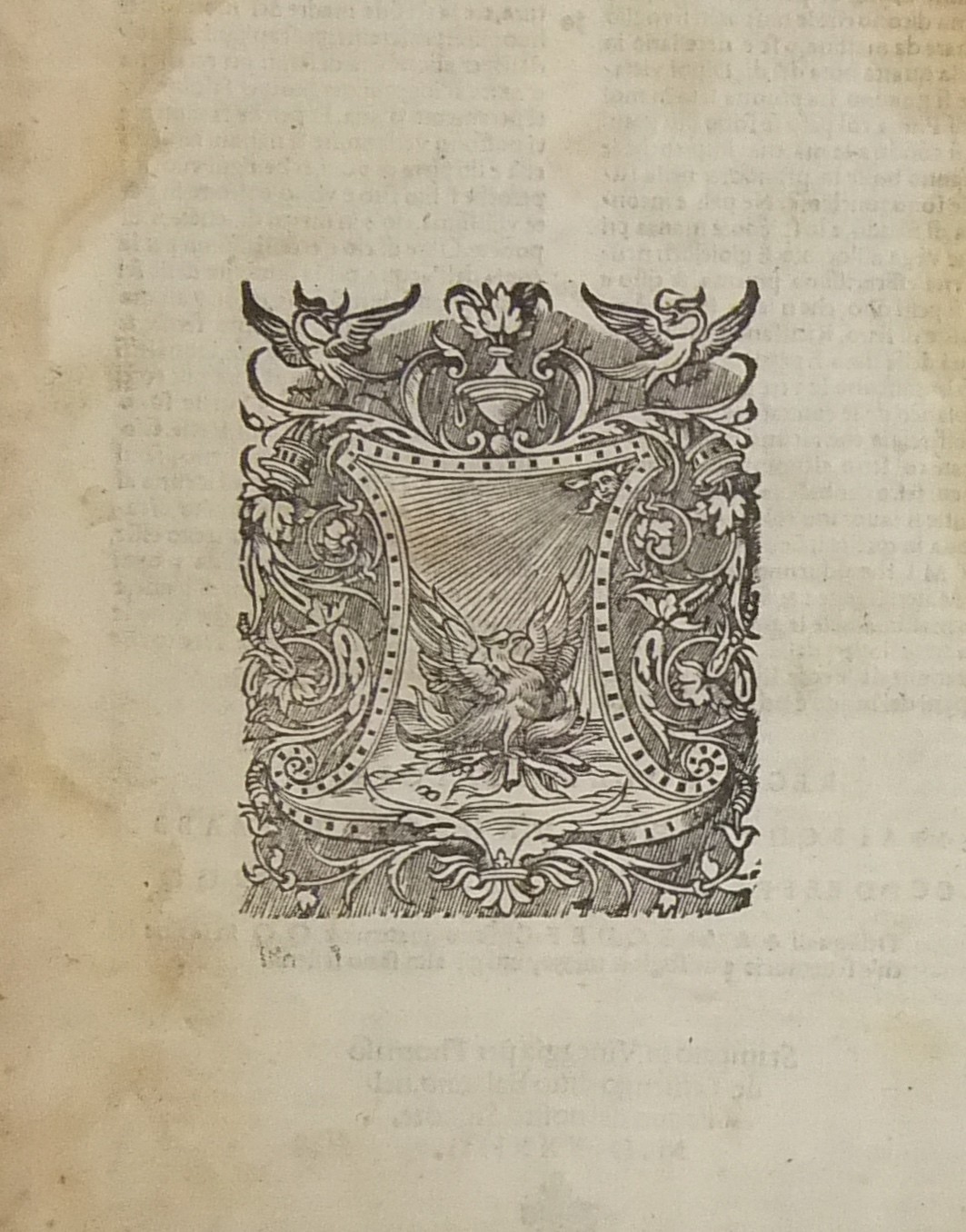Capilettera incisi, marca tipografica del Ballarino xilografata al frontespizio e a fine opera raffigurante fenice sulle fiamme che vola verso il sole in cornice figurata con motto "Nunquam deficiam cremer usque licet"