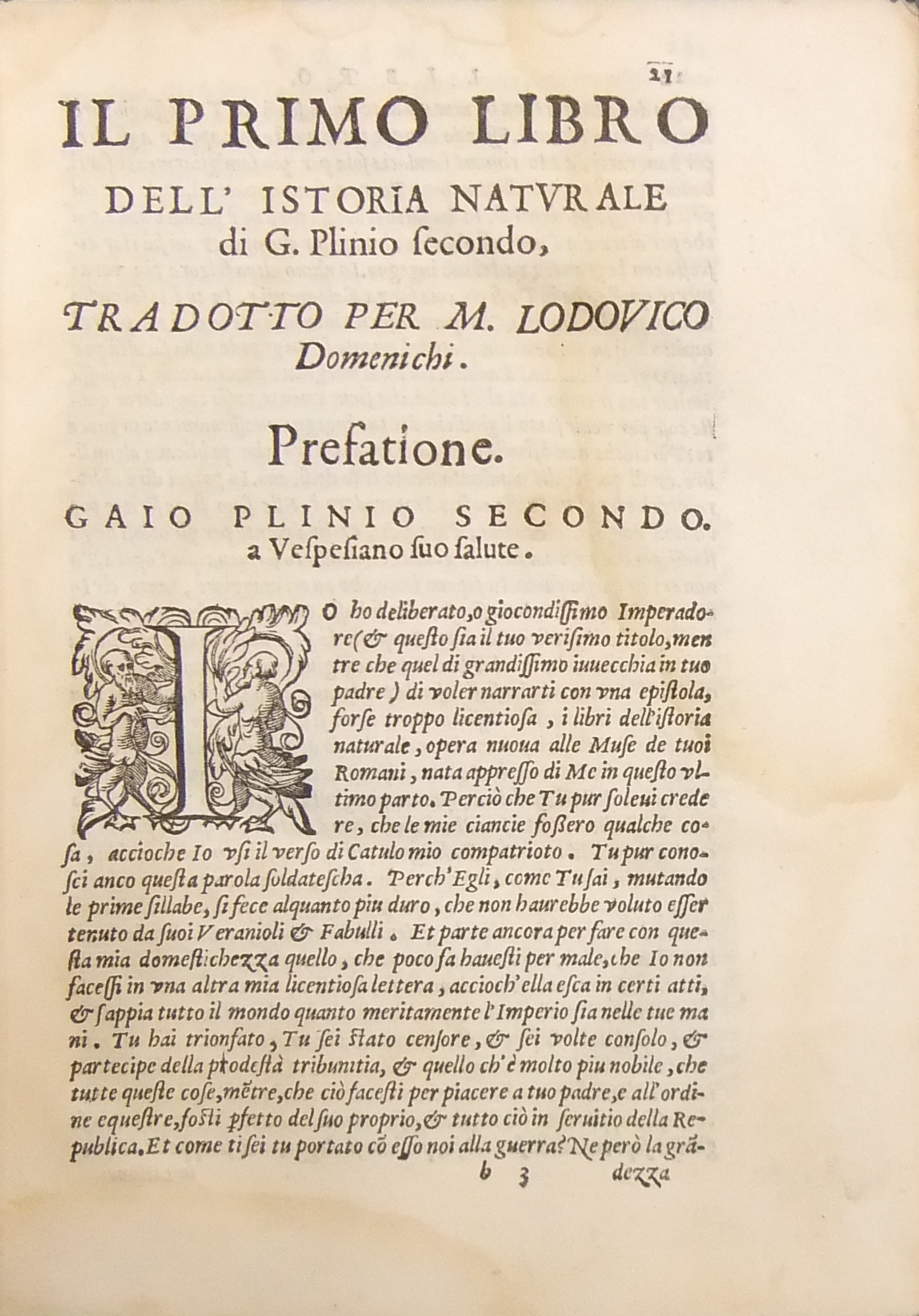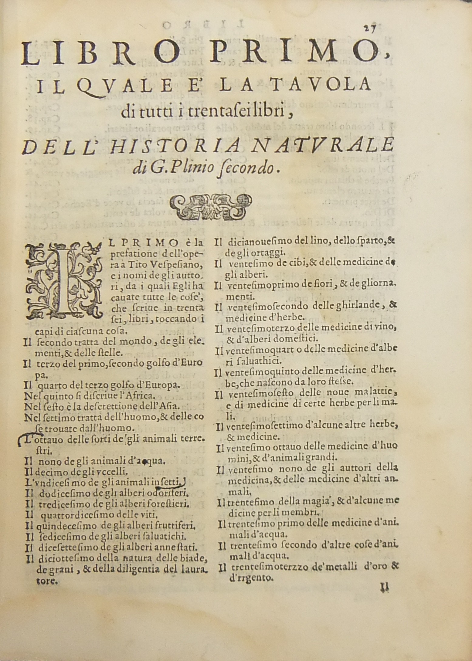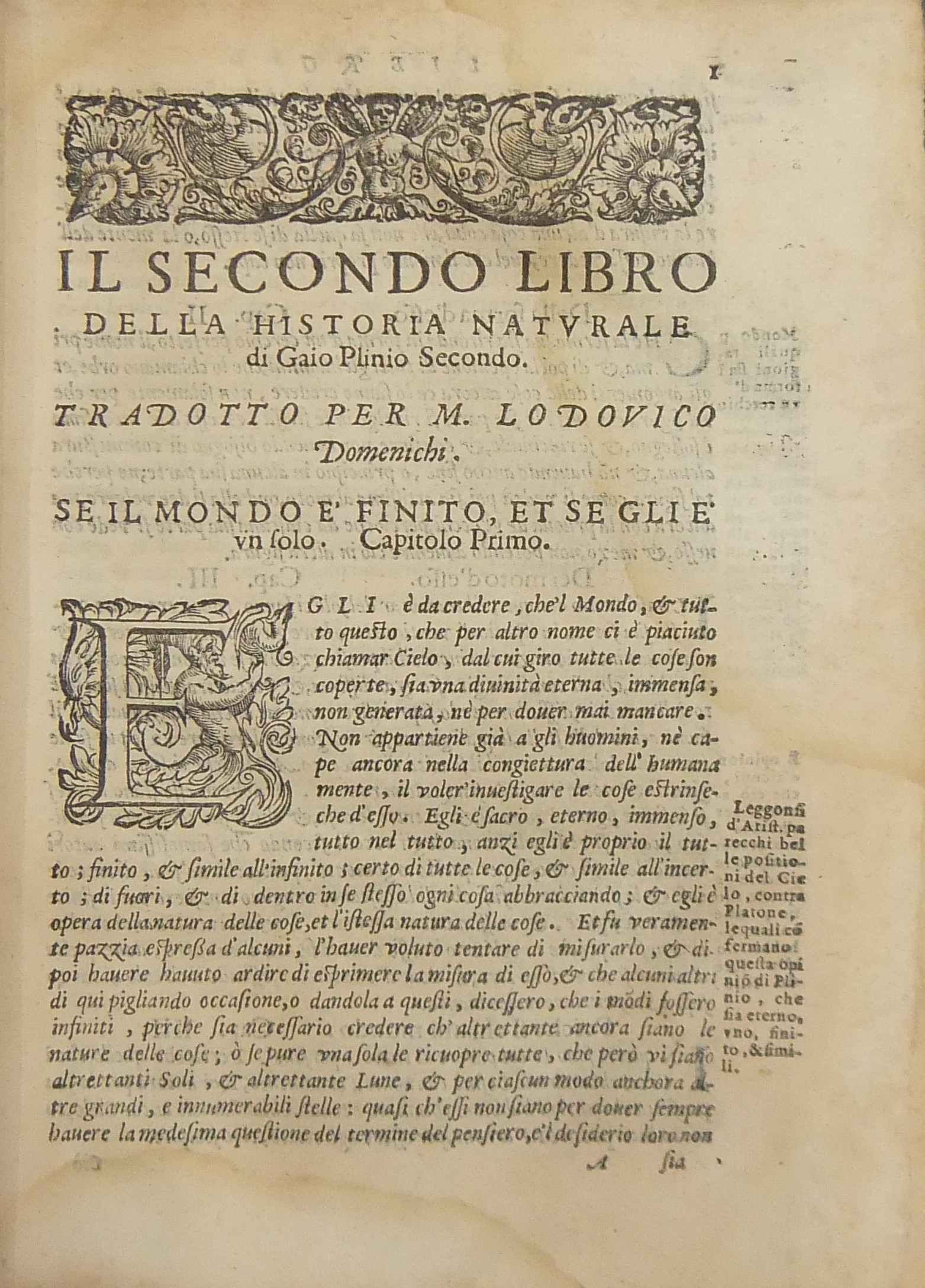 Historia naturale di G. Plinio Secondo. Tradotta per M. Lodouicho Domenichi. Con le additioni in margine, nelle quali, ò vengono segnate le cose notabili, ò citati altri auttori, che della stessa materia habbiano scritto, ò dichiarati i luoghi difficili, ò posti i nomi di geografia moderni. Di nuouo ristampate, riuiste, & ricorrette. Con le sue tauole copiosissime di tutto quel che nell'opera si contiene