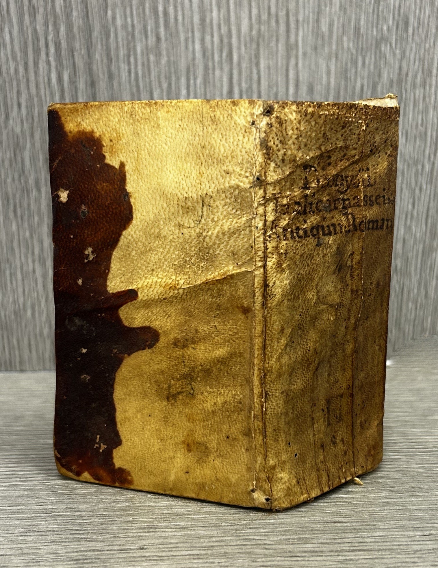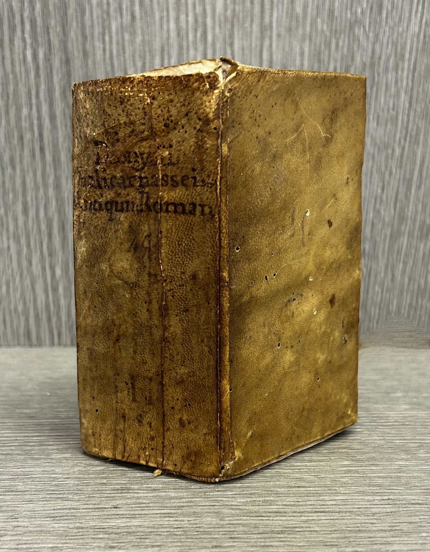 Macchia coeva di inchiostro al piatto posteriore, antica nota d\'appartenenza al frontespizio, ultima pagina parzialmente staccata, brevi percorsi di tarlo estinto sempre marginali che intaccano raramente pochissime lettere, bruniture omogenea dovute alla qualità della carta
