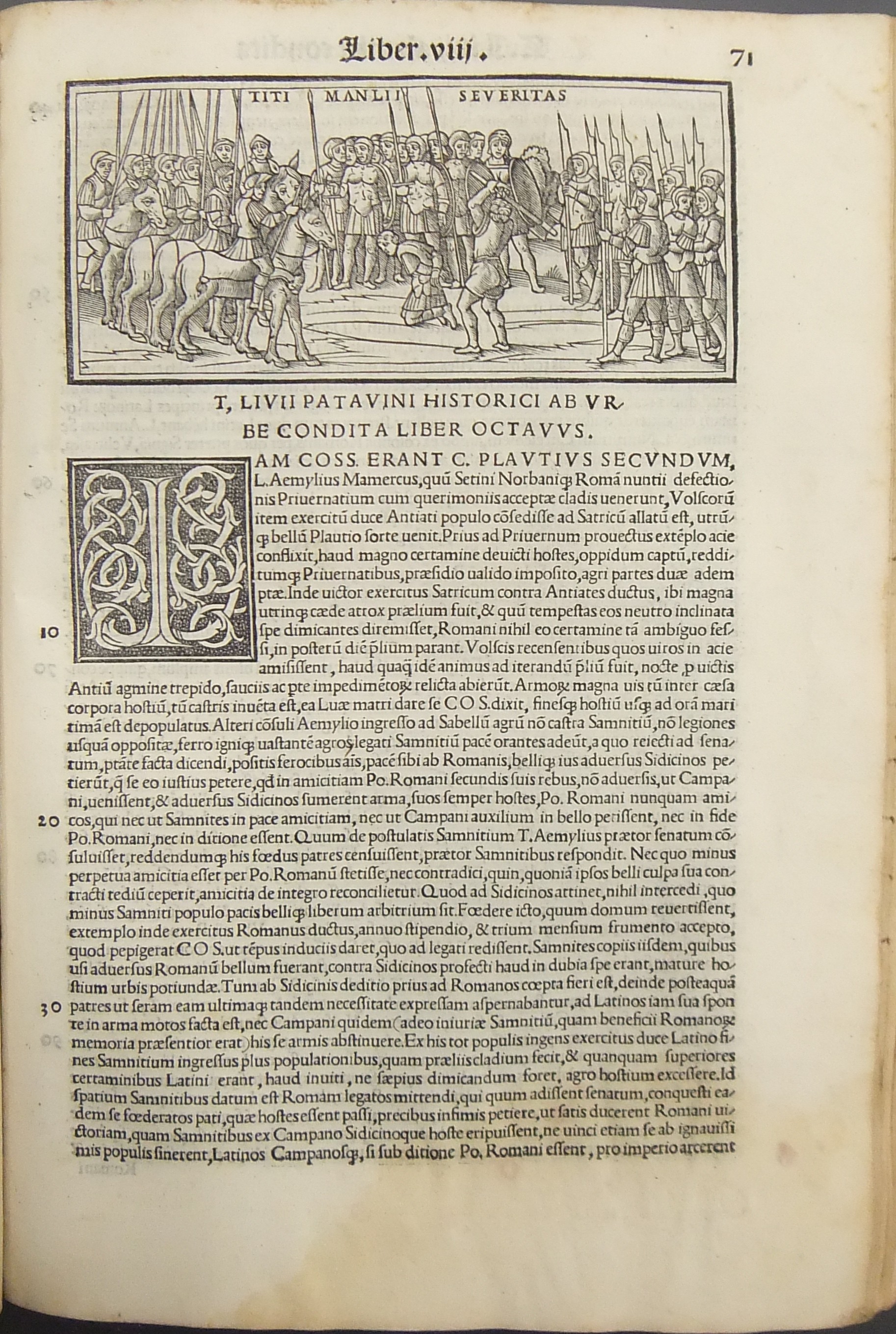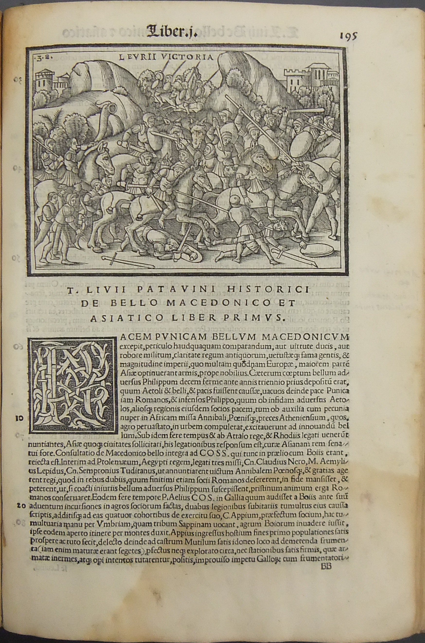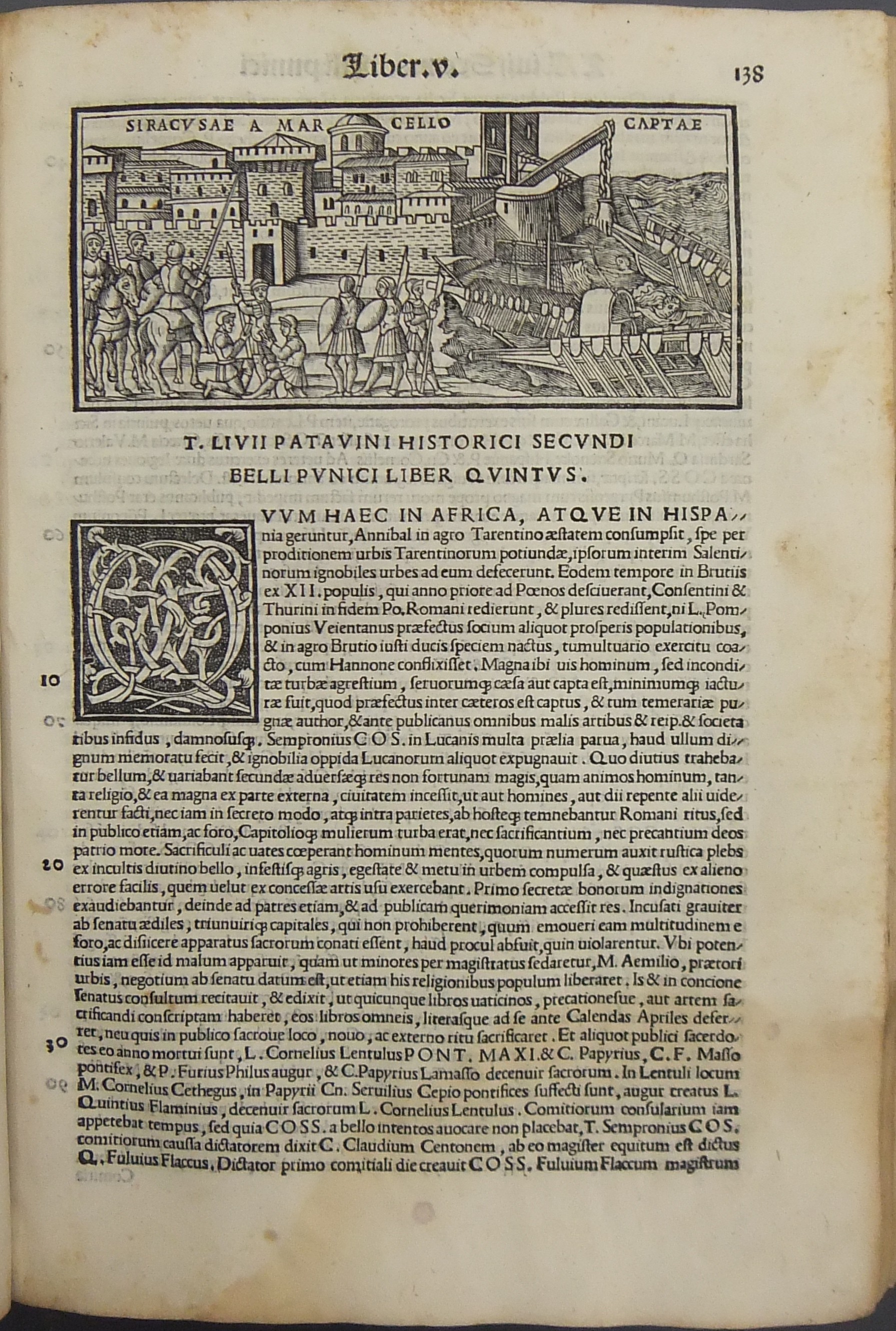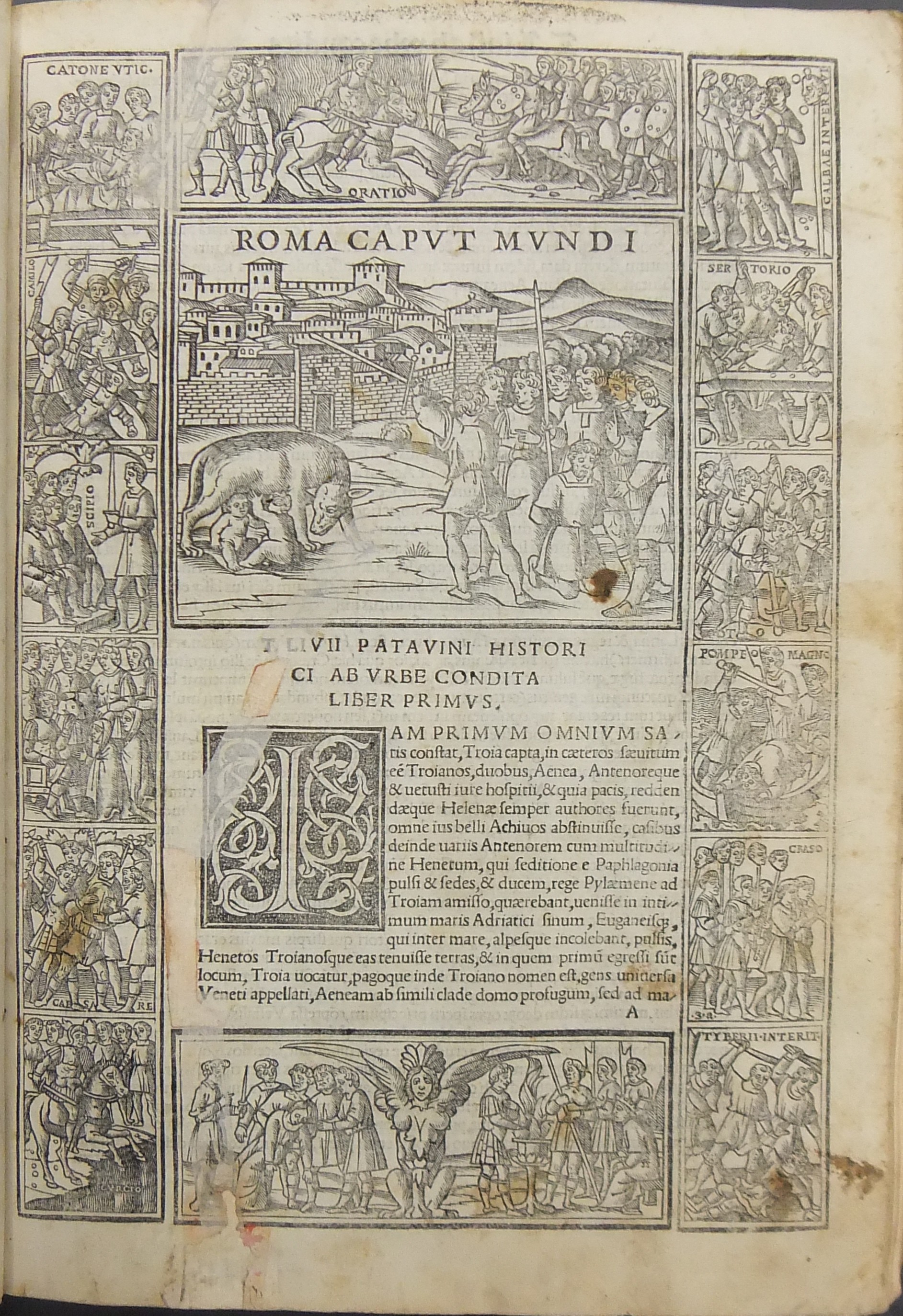Frontespizio bicromatico rosso e nero raffigurante l’Autore incorniciato che tiene in mano un libro, marca tipografica xilografata raffigurante un gatto con topo in bocca in un cerchio in cui poggia una corona. Ai lati le iniziali MS. Bellissimi capilettera ornati xilografati, prima carta del libro I xilografata e incornicata, altre nove testatine xilografate ad ogni libro dell’Urbe Condita, nei 10 libri del De Belli Punici e nei 10 libri del De Bello Macedonio e Asiatico.