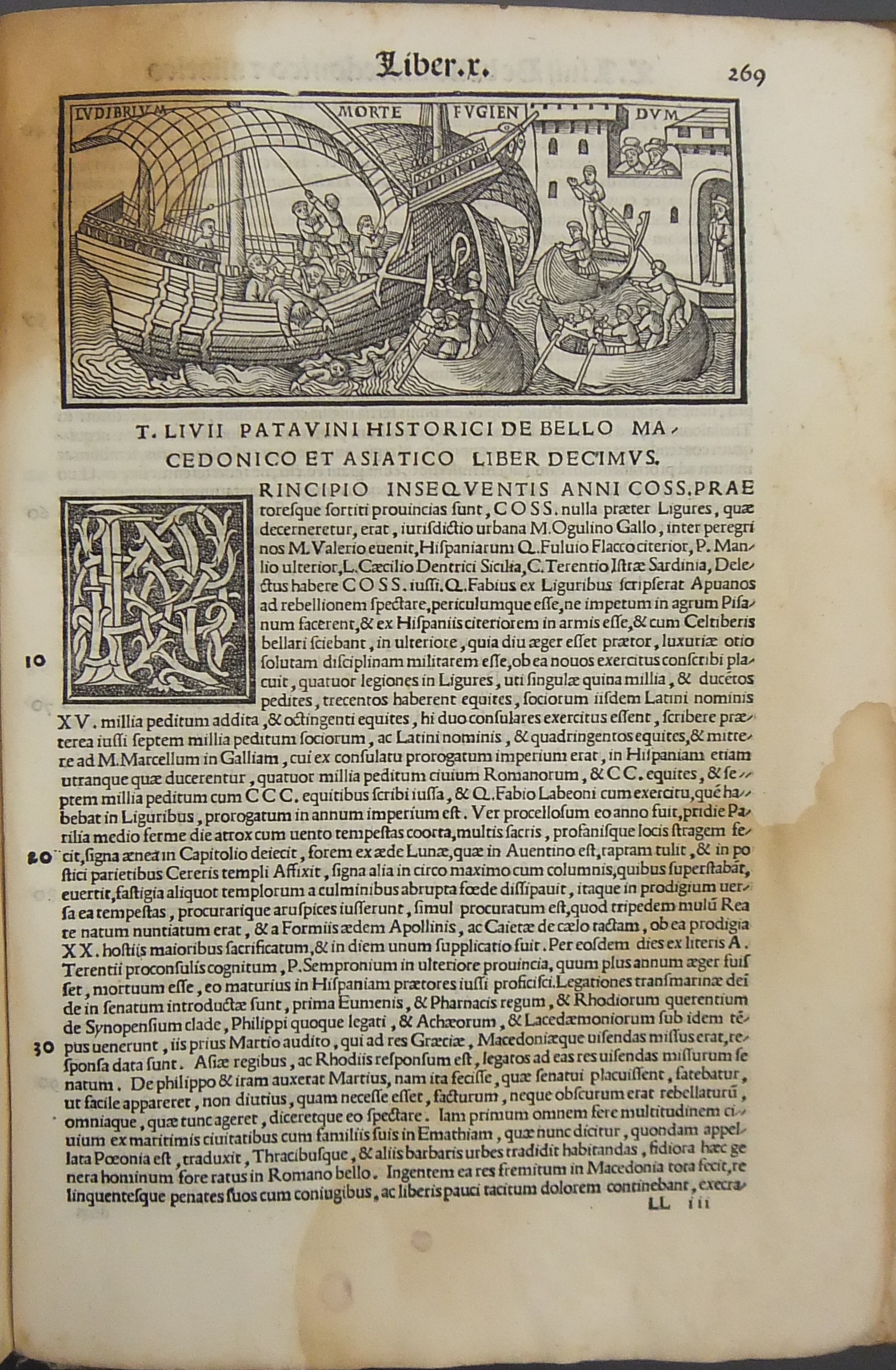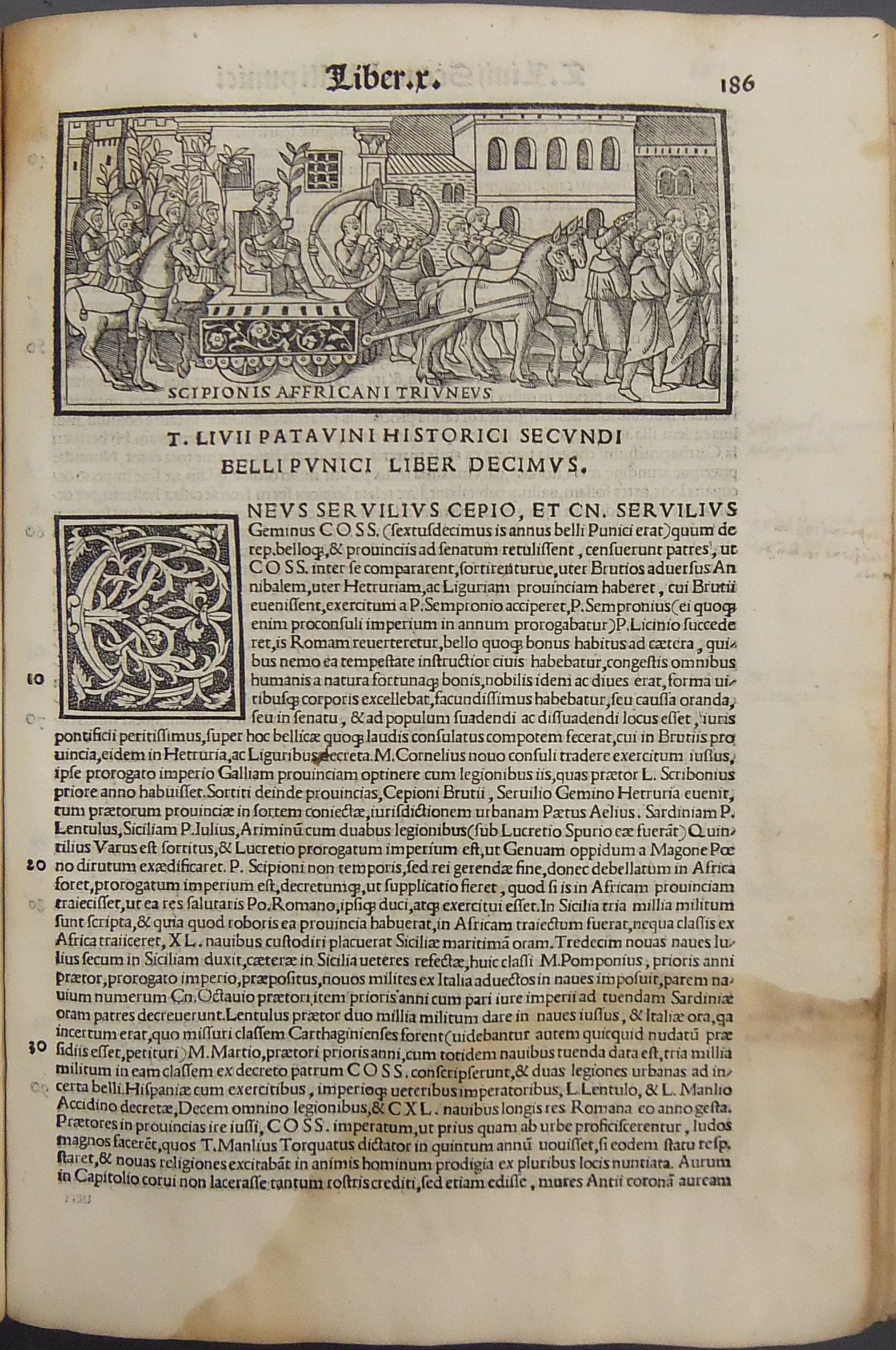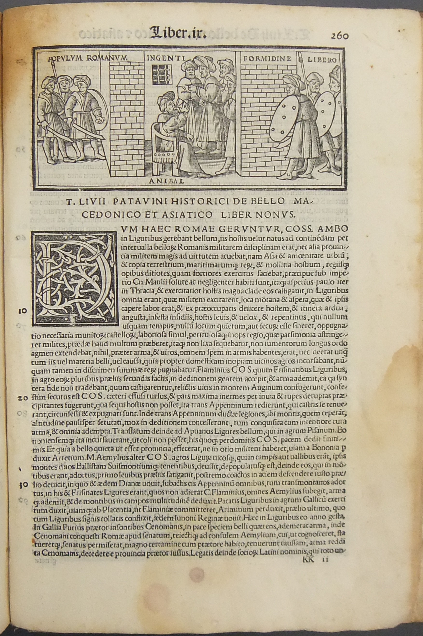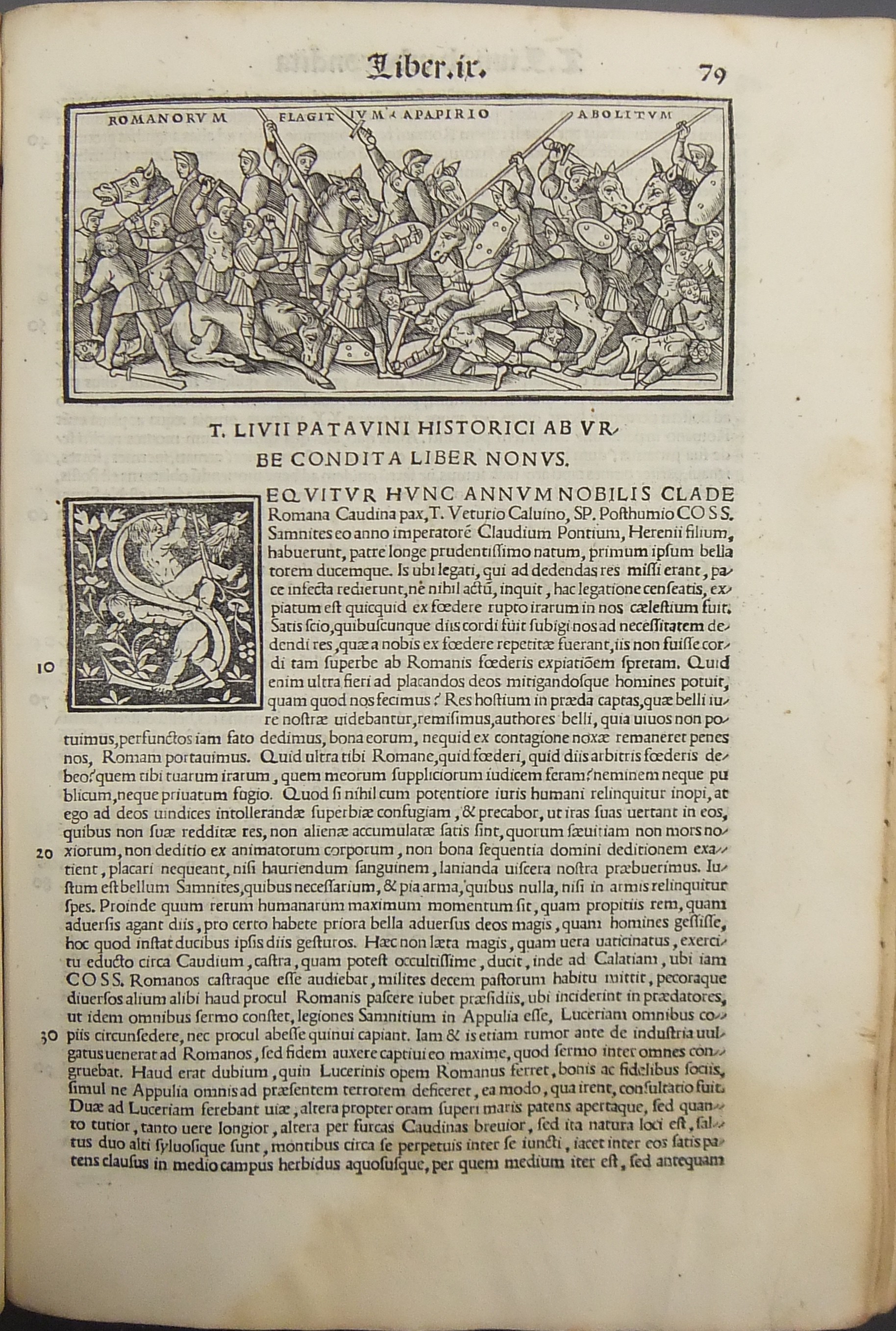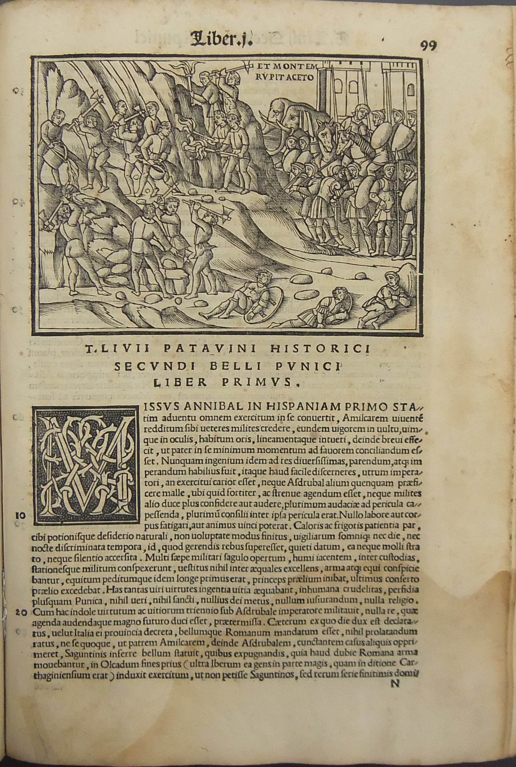 Frontespizio bicromatico rosso e nero raffigurante l’Autore incorniciato che tiene in mano un libro, marca tipografica xilografata raffigurante un gatto con topo in bocca in un cerchio in cui poggia una corona. Ai lati le iniziali MS. Bellissimi capilettera ornati xilografati, prima carta del libro I xilografata e incornicata, altre nove testatine xilografate ad ogni libro dell’Urbe Condita, nei 10 libri del De Belli Punici e nei 10 libri del De Bello Macedonio e Asiatico.