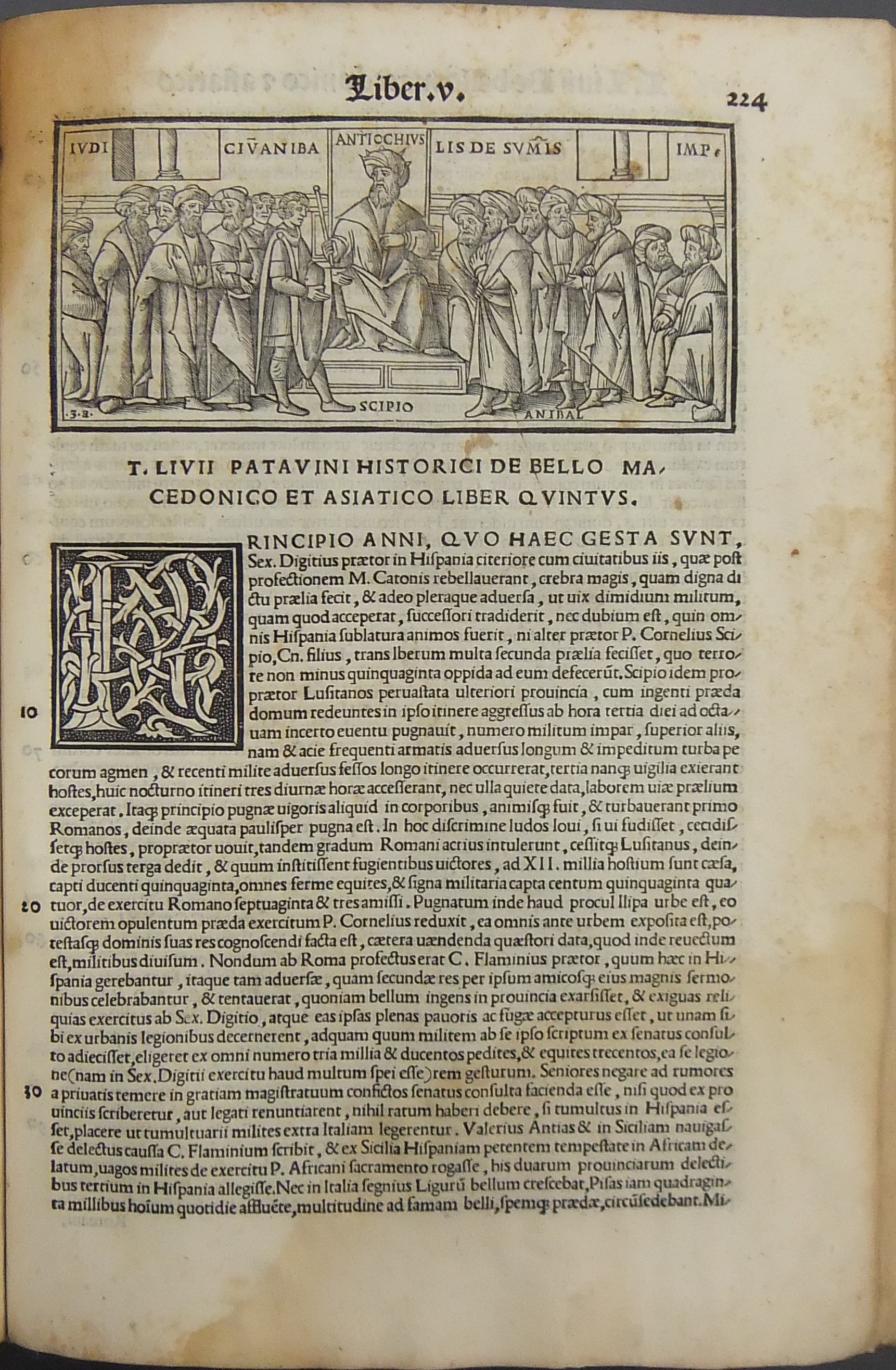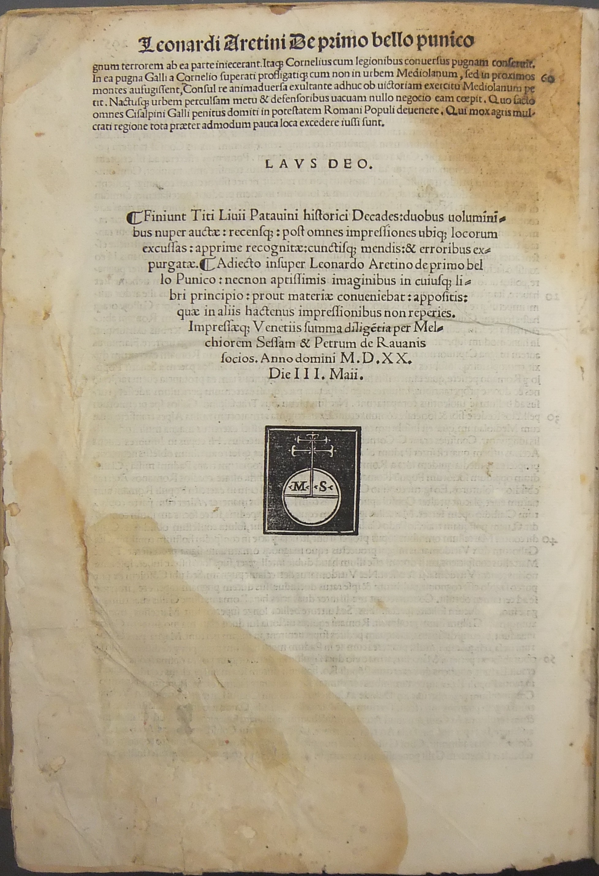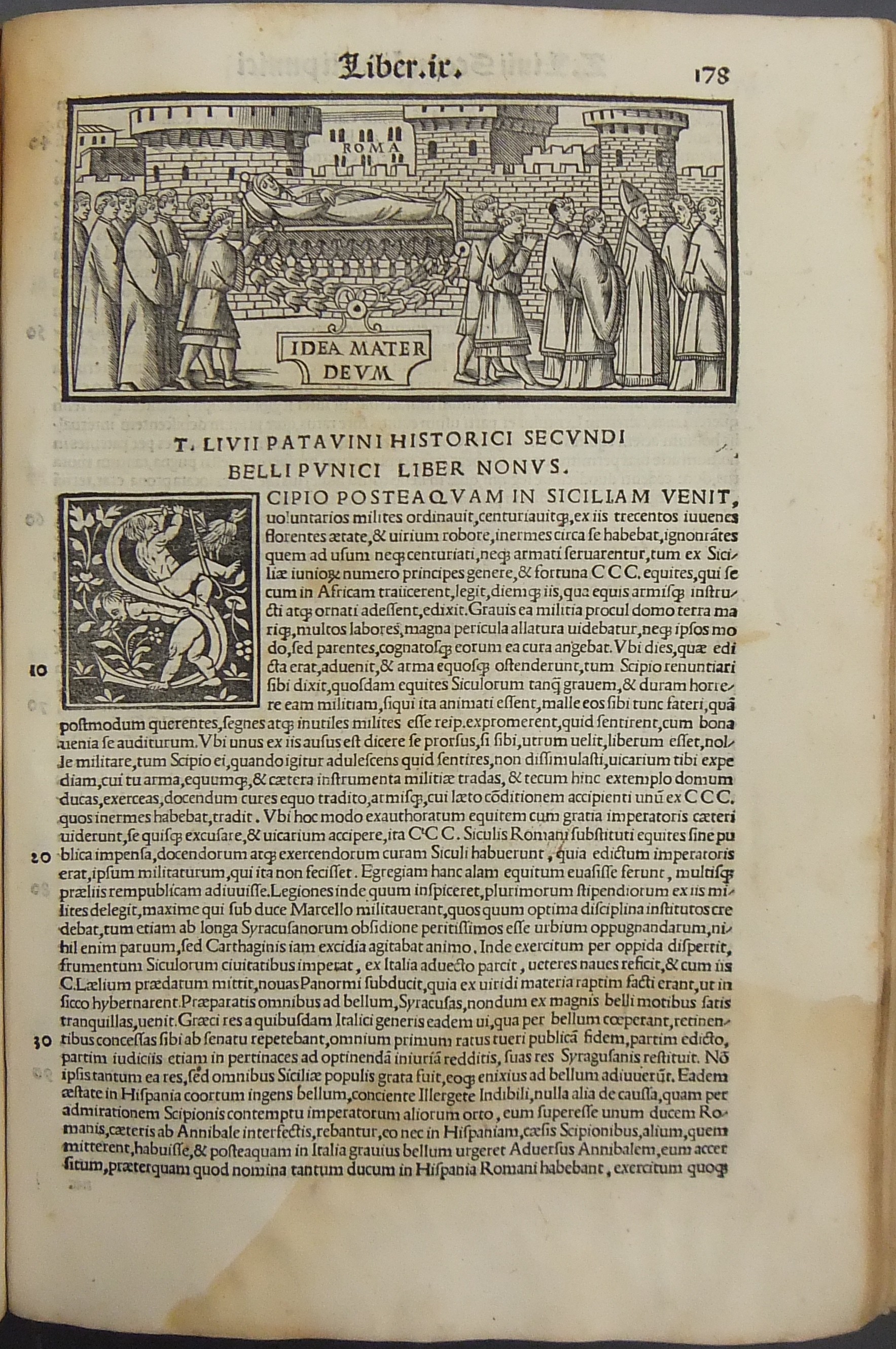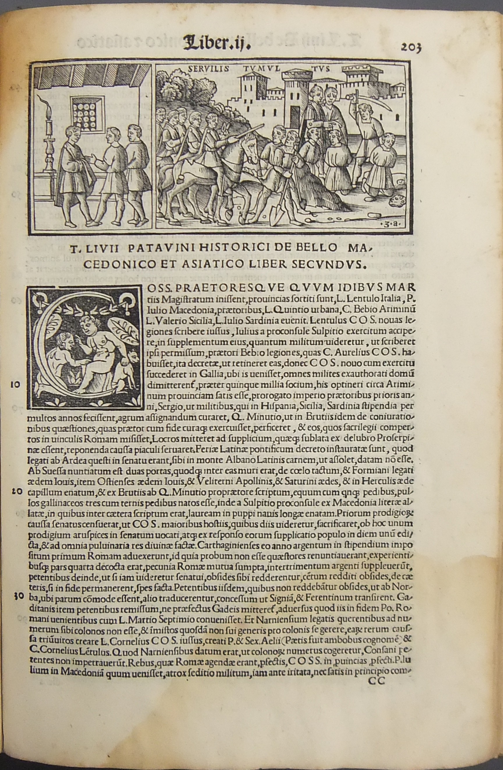 Frontespizio bicromatico rosso e nero raffigurante l’Autore incorniciato che tiene in mano un libro, marca tipografica xilografata raffigurante un gatto con topo in bocca in un cerchio in cui poggia una corona. Ai lati le iniziali MS. Bellissimi capilettera ornati xilografati, prima carta del libro I xilografata e incornicata, altre nove testatine xilografate ad ogni libro dell’Urbe Condita, nei 10 libri del De Belli Punici e nei 10 libri del De Bello Macedonio e Asiatico.