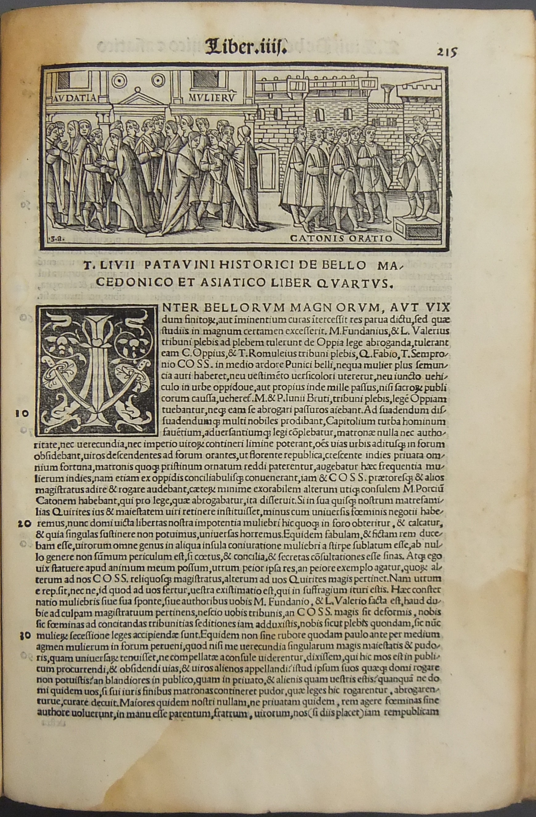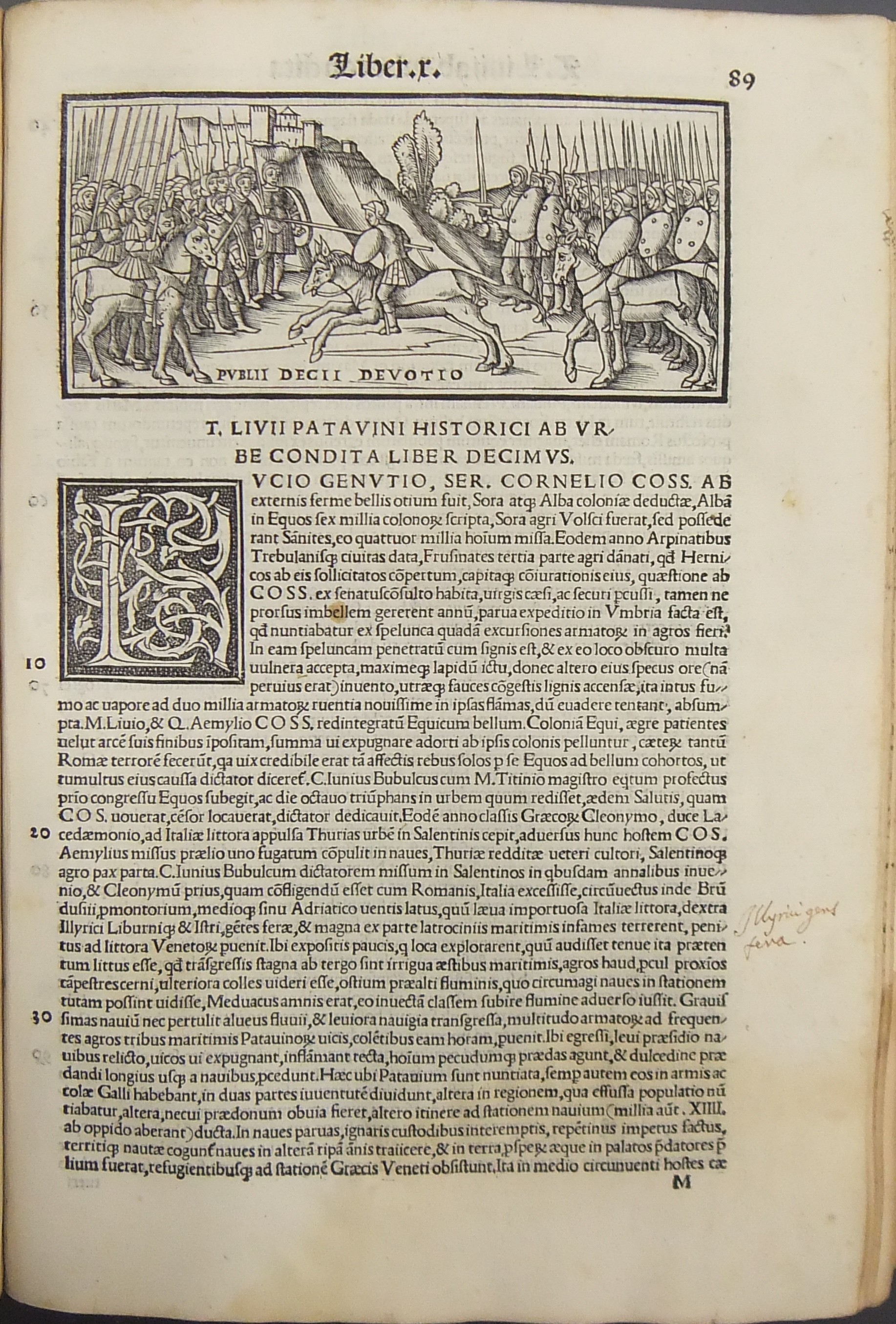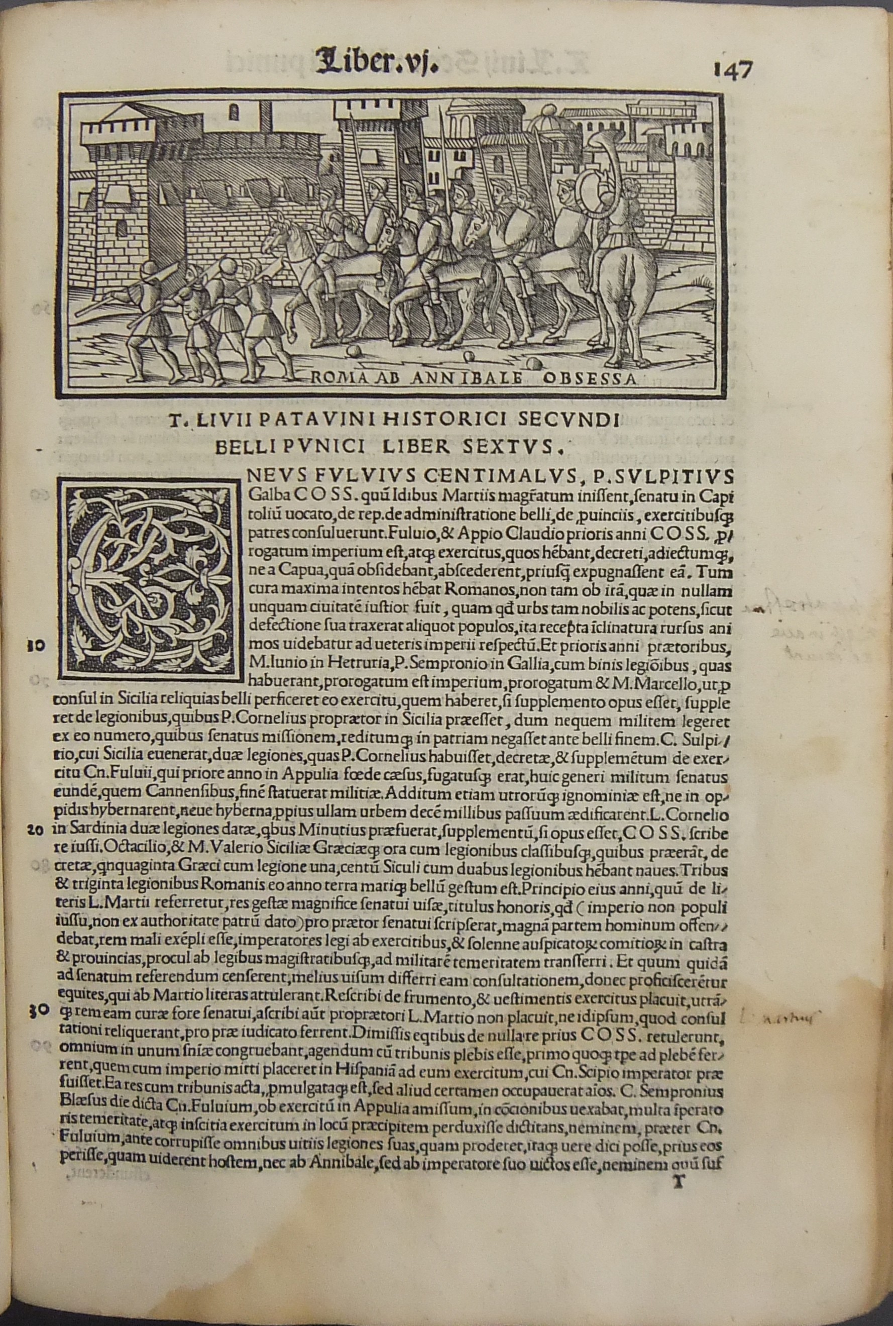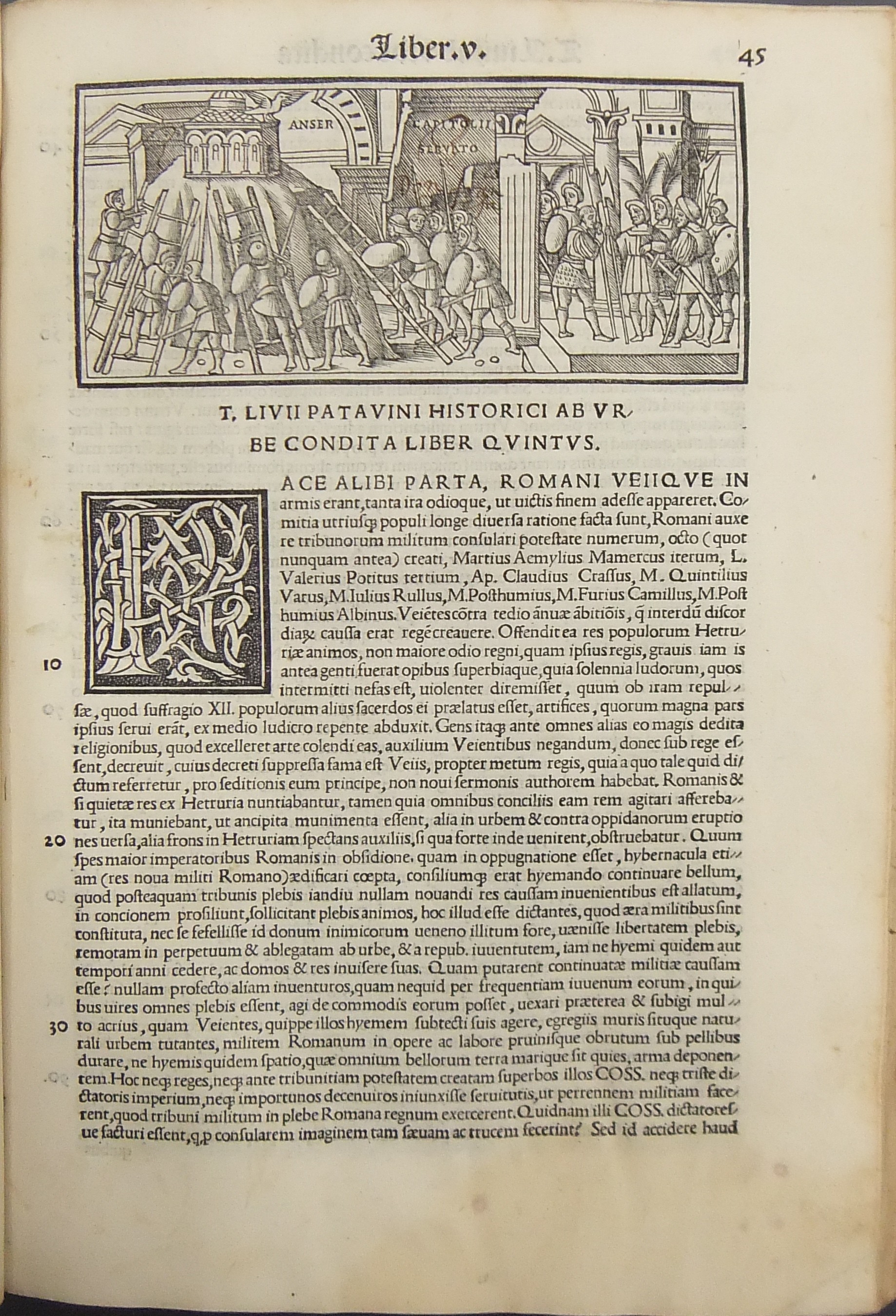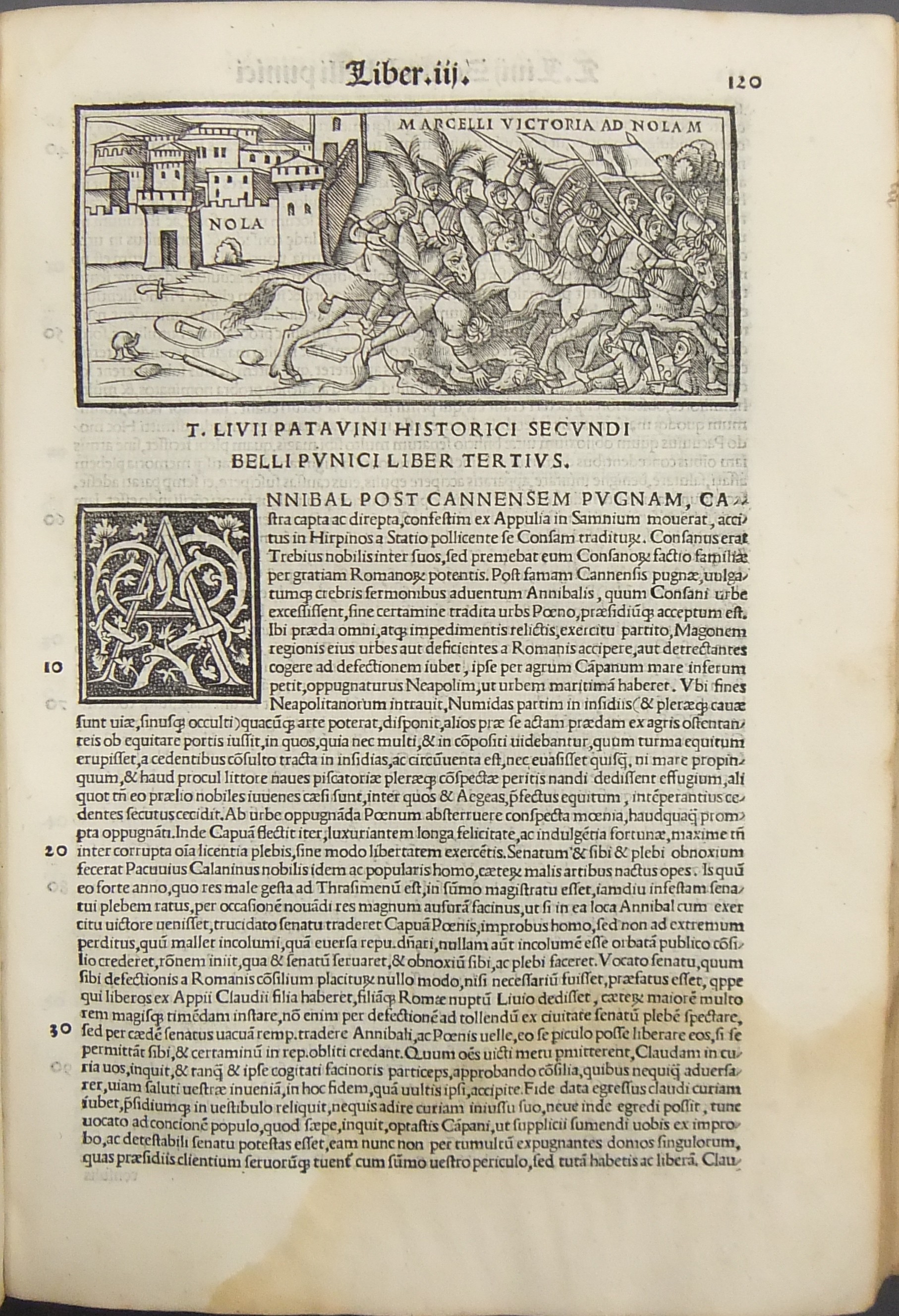Frontespizio bicromatico rosso e nero raffigurante l’Autore incorniciato che tiene in mano un libro, marca tipografica xilografata raffigurante un gatto con topo in bocca in un cerchio in cui poggia una corona. Ai lati le iniziali MS. Bellissimi capilettera ornati xilografati, prima carta del libro I xilografata e incornicata, altre nove testatine xilografate ad ogni libro dell’Urbe Condita, nei 10 libri del De Belli Punici e nei 10 libri del De Bello Macedonio e Asiatico.
