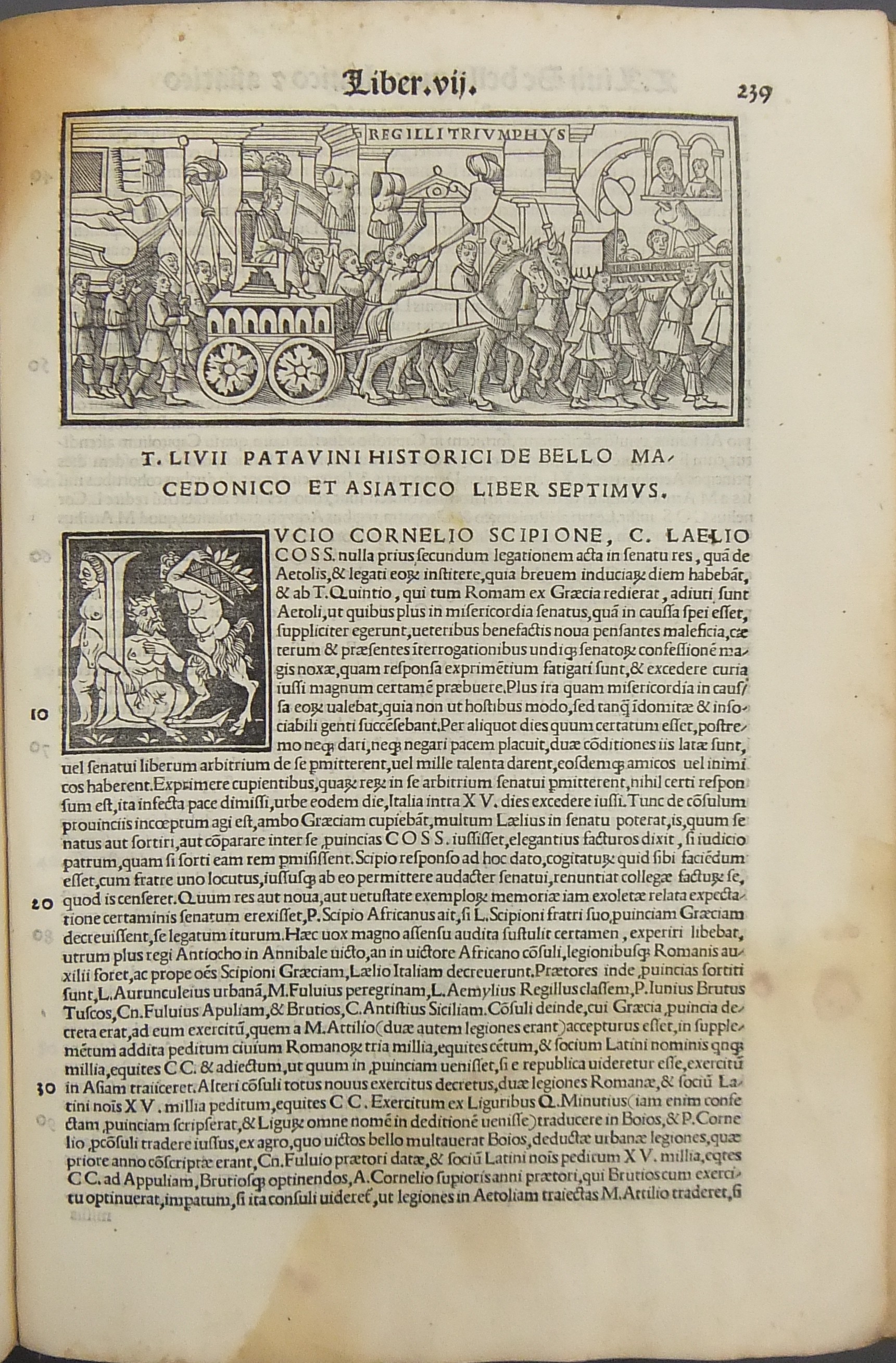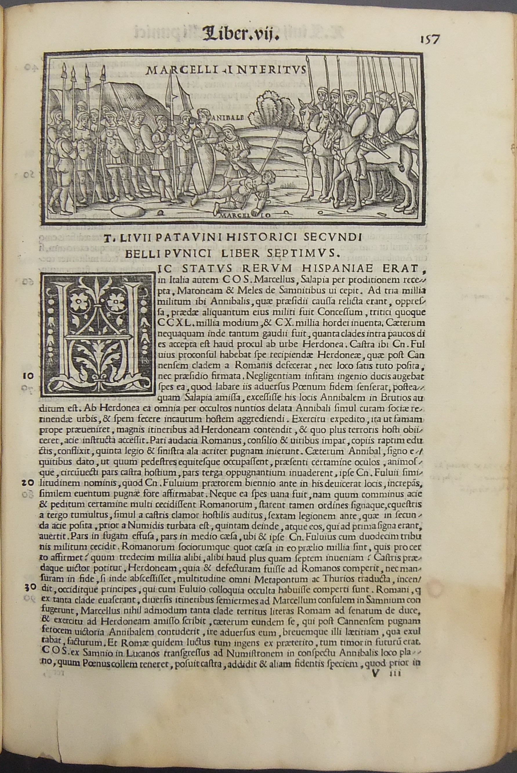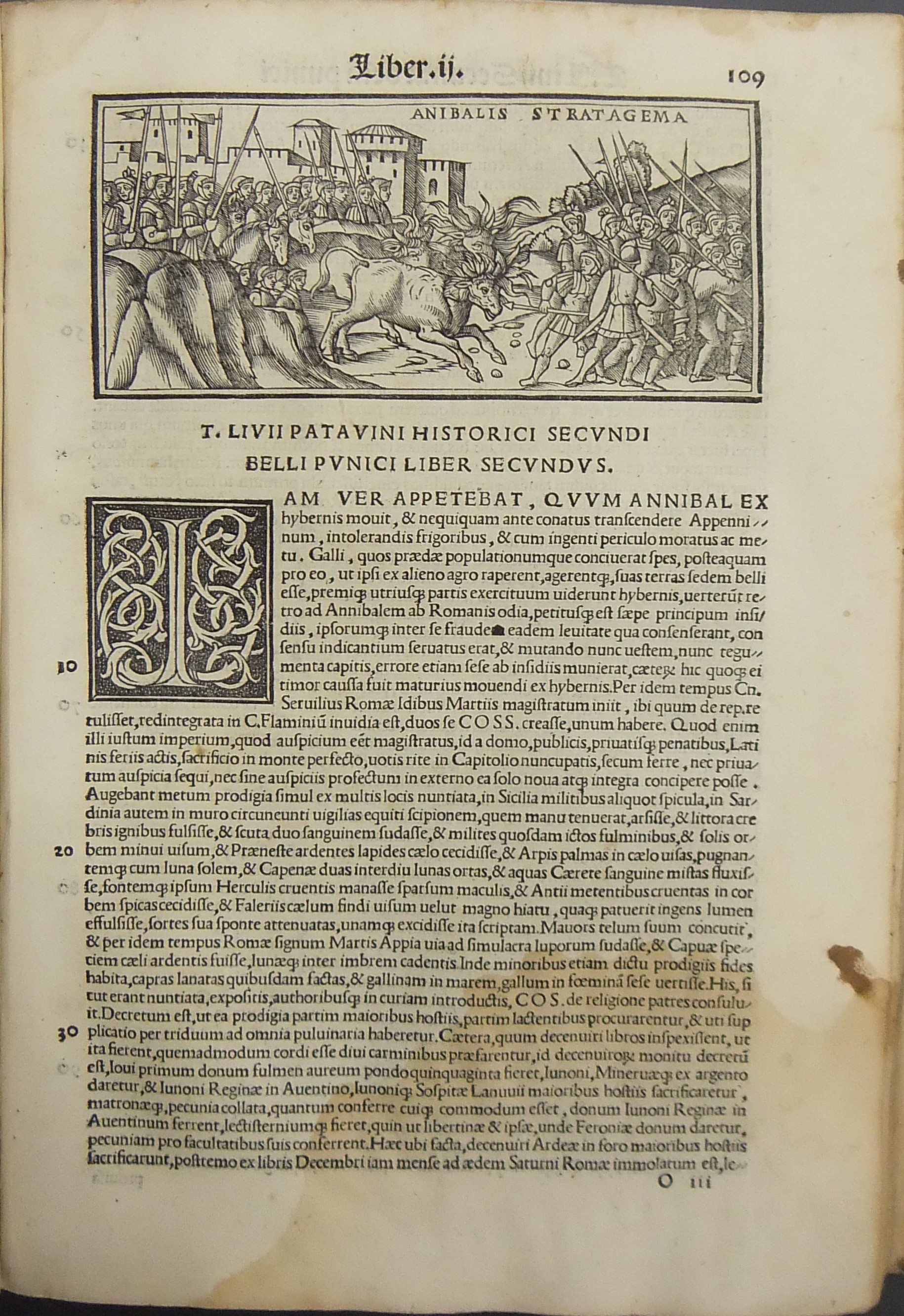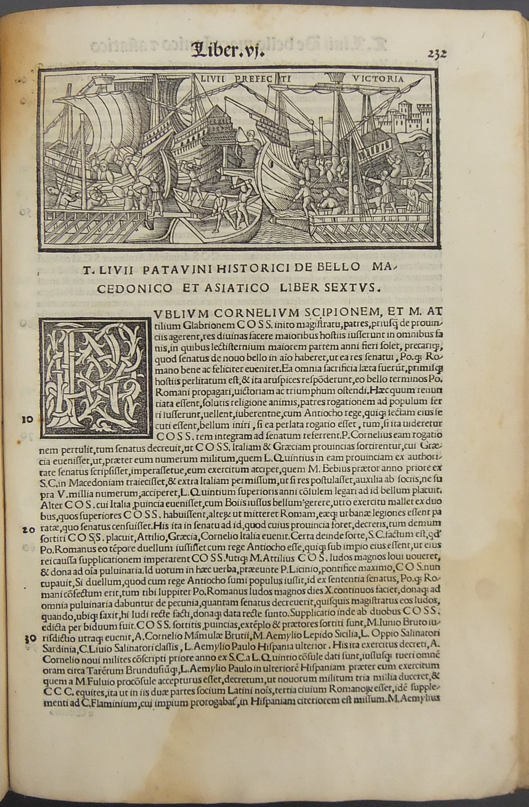 Frontespizio bicromatico rosso e nero raffigurante l’Autore incorniciato che tiene in mano un libro, marca tipografica xilografata raffigurante un gatto con topo in bocca in un cerchio in cui poggia una corona. Ai lati le iniziali MS. Bellissimi capilettera ornati xilografati, prima carta del libro I xilografata e incornicata, altre nove testatine xilografate ad ogni libro dell’Urbe Condita, nei 10 libri del De Belli Punici e nei 10 libri del De Bello Macedonio e Asiatico.