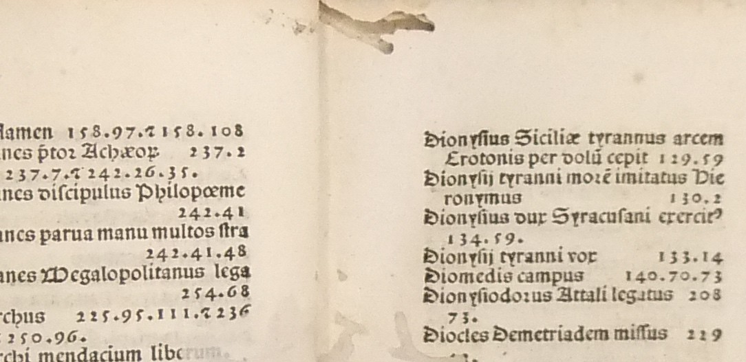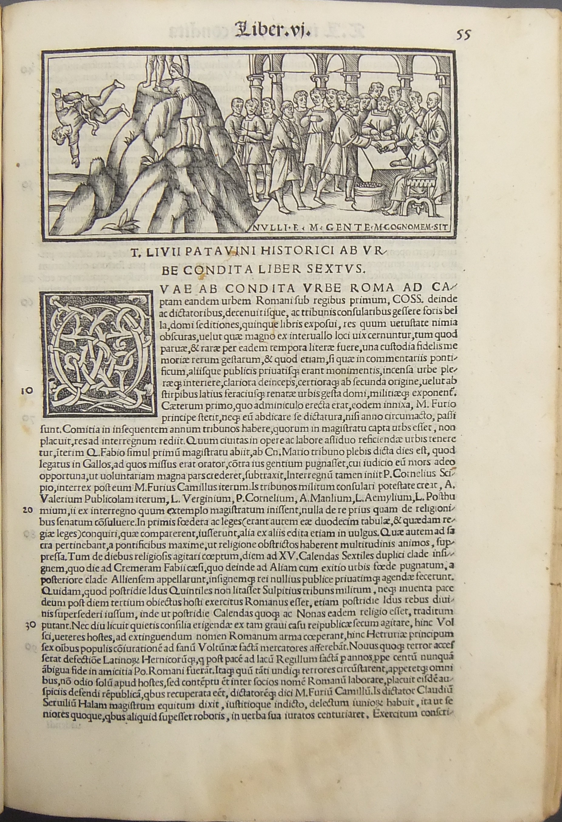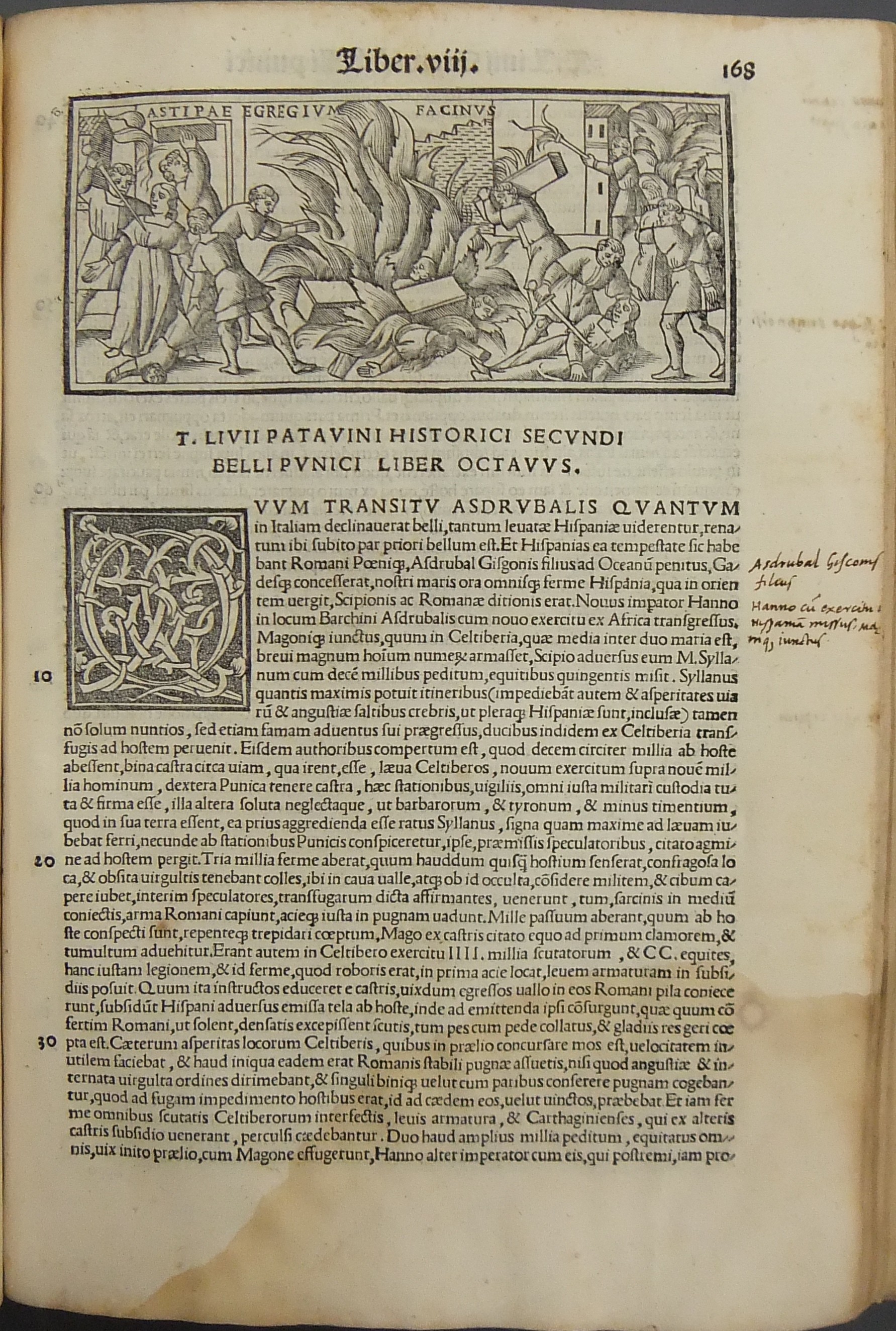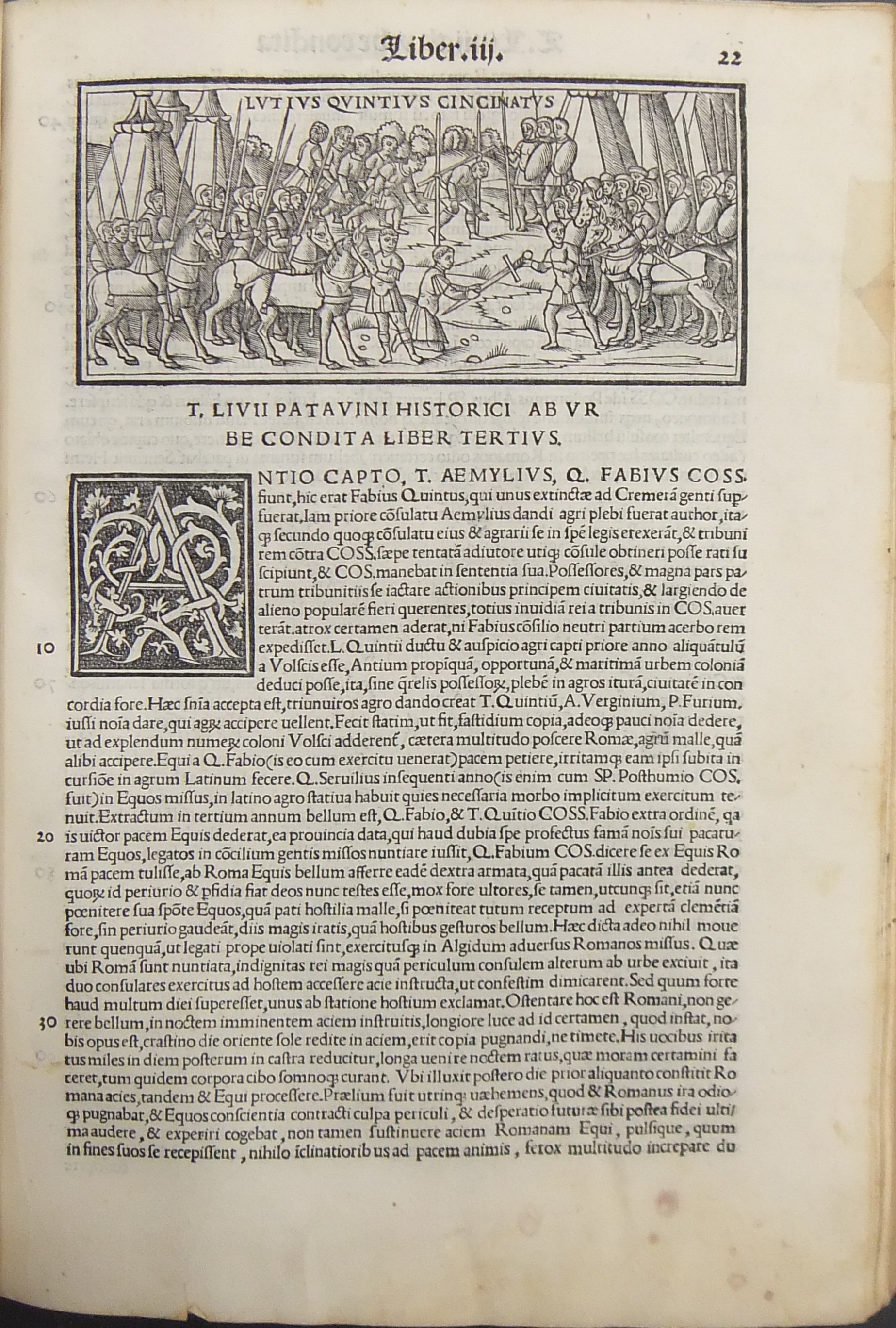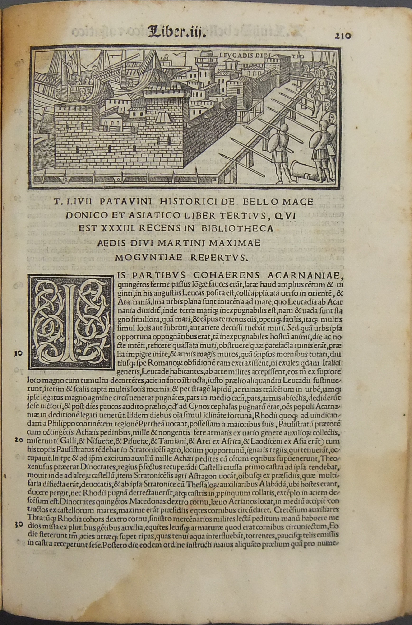 Frontespizio bicromatico rosso e nero raffigurante l’Autore incorniciato che tiene in mano un libro, marca tipografica xilografata raffigurante un gatto con topo in bocca in un cerchio in cui poggia una corona. Ai lati le iniziali MS. Bellissimi capilettera ornati xilografati, prima carta del libro I xilografata e incornicata, altre nove testatine xilografate ad ogni libro dell’Urbe Condita, nei 10 libri del De Belli Punici e nei 10 libri del De Bello Macedonio e Asiatico.
