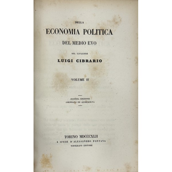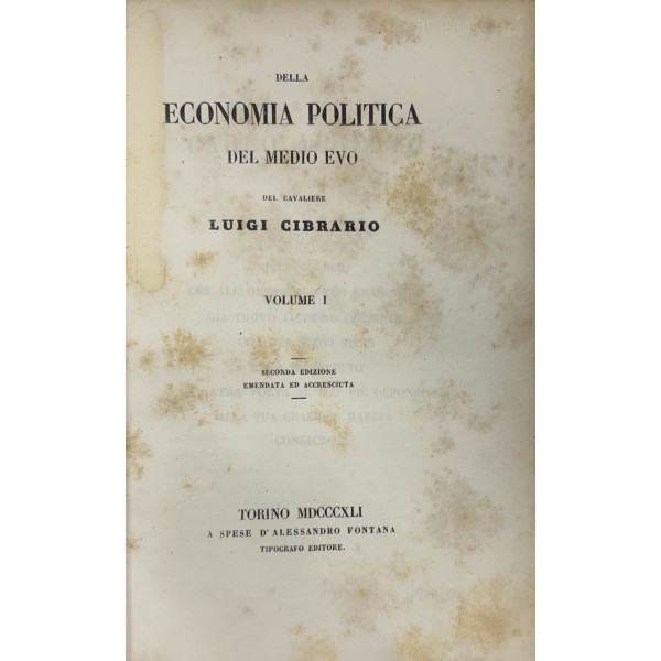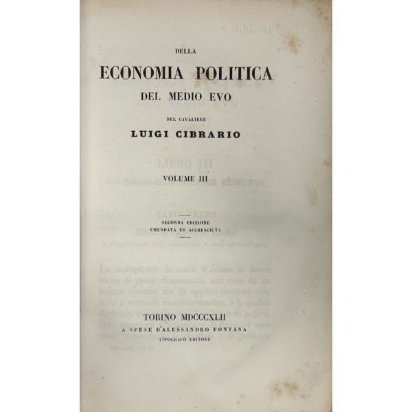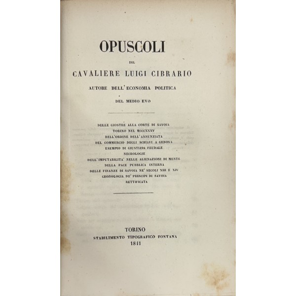 Della economia politica del Medio Evo. UNITO A: Opuscoli del Cavaliere Luigi Cibrario autore dell'economia politica del Medio Evo. Delle giostre alla corte di Savoia; Torino nel 1835; Dell'Ordine dell'Annunziata; Del commercio degli schiavi a Genova; Esempio di giustizia feudale; Necrologie; Dell'imputabilità nelle alienazioni di mente; Della pace pubblica interna; Delle finanze di Savoia ne' secoli XIII e XIV; Cronologia de' Principi di Savoia rettificata