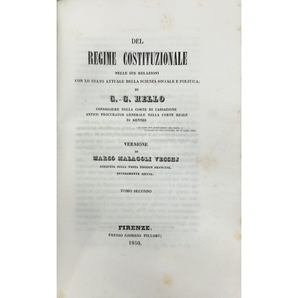 Del regime costituzionale nelle sue relazioni con lo stato attuale della scienza sociale e politica.. Versione di Marco Malagoli Vecchj eseguita sulla terza edizione francese interamente rifusa