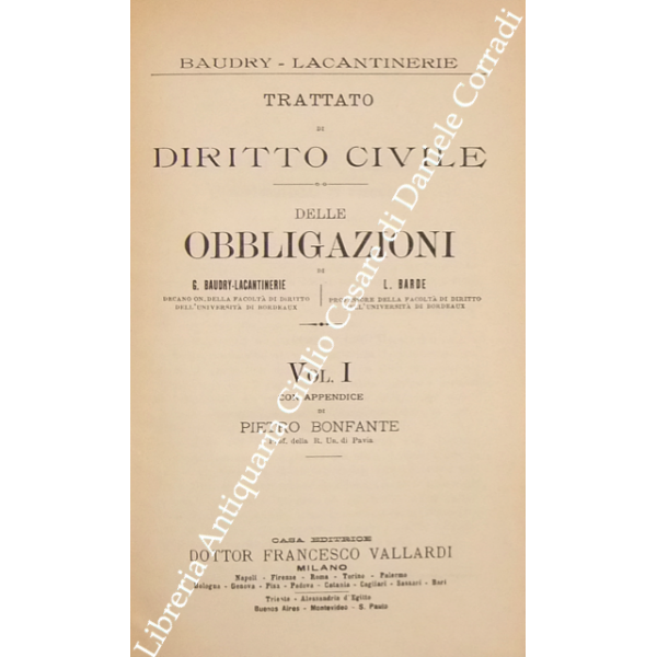 Trattato teorico pratico di diritto civile. Delle obbligazioni. Tradotto sulla terza edizione originale in corso di stampa da una Societa di Giuristi con riscontri al codice civile italiano note esplicative e appendici originali a cura dei professori P. Bonfante G. Pacchioni A. Sraffa