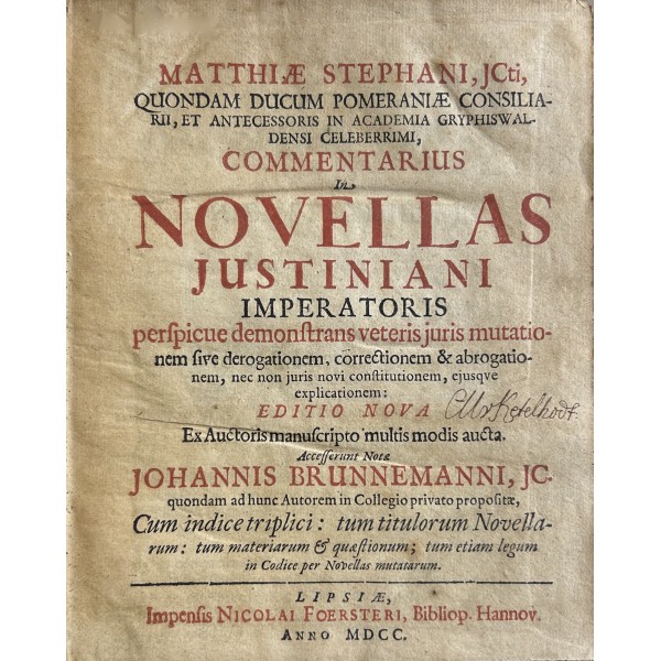Matthiae Stephani ... Commentarius in Novellas Justiniani Imperatoris perspique demonstrans veteris juris mutationem sive derogationem correctionem et abrogationem nec non juris novi constitutionem ejusque explicationem. Editio nova ex Auctoris manuscripto multis modis aucta. Accesserunt Notae Johannis Brunnemanni JC. quondam ad hunc Autorem in Collegio privato propositae. Cum indice triplici tum titulorum Novellarum tum materiarum et quaestionum tum etiam legum in Codice per Novellas mutatarum