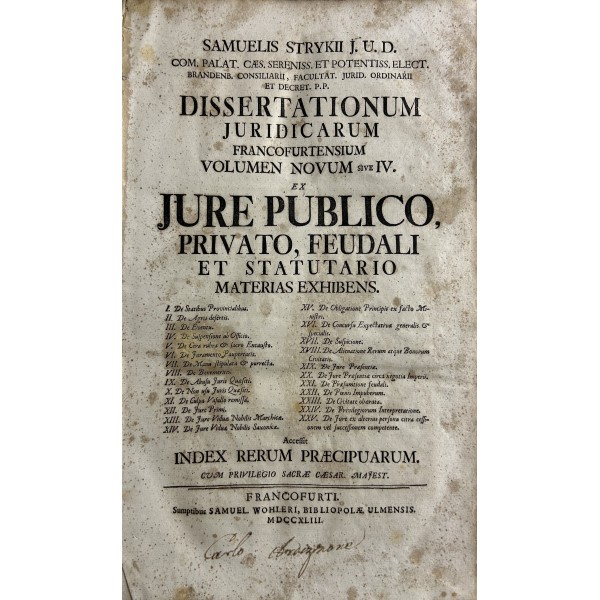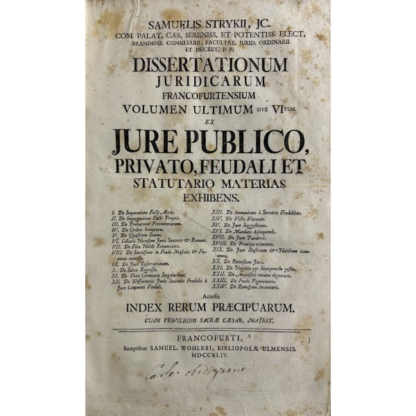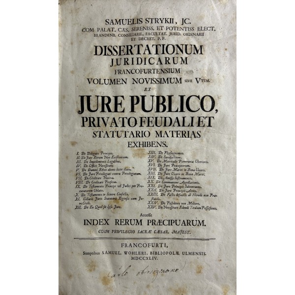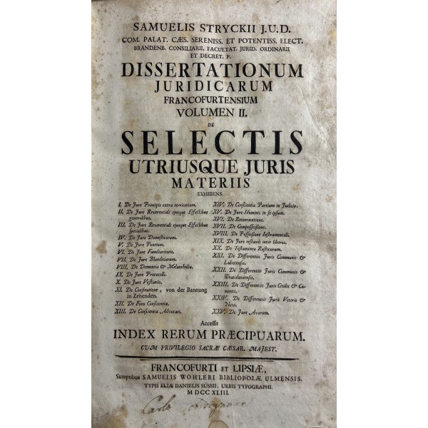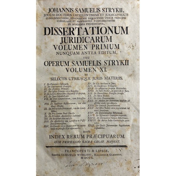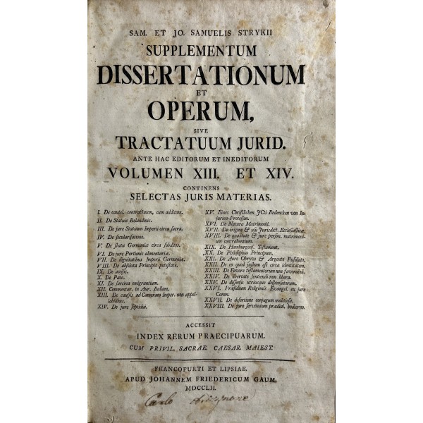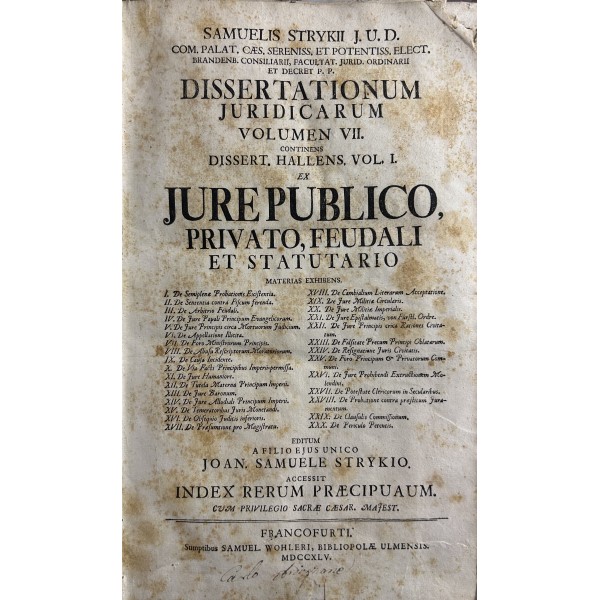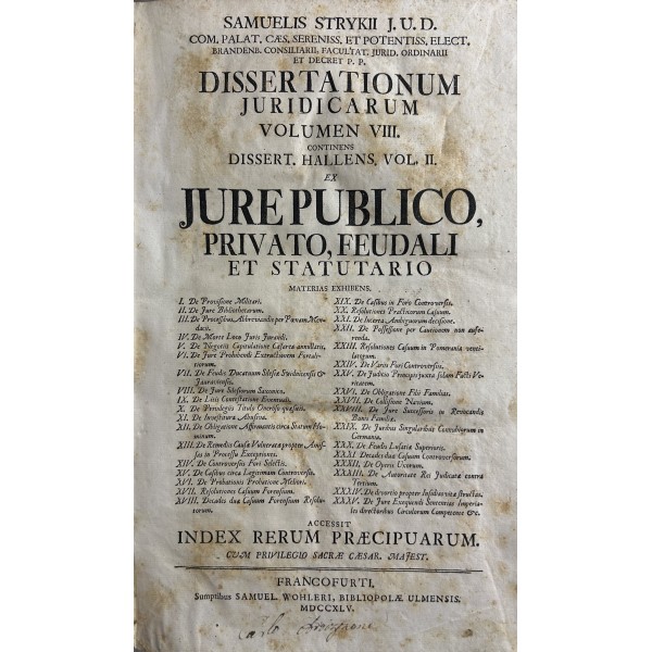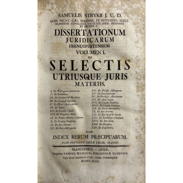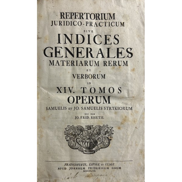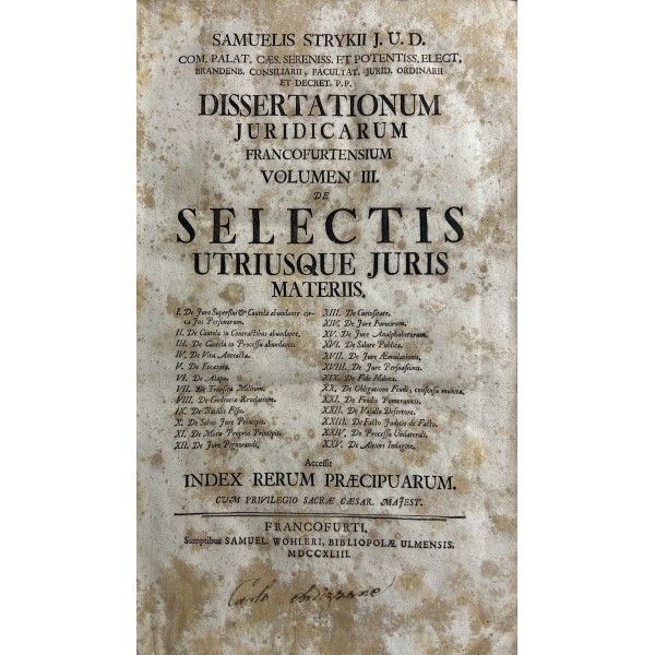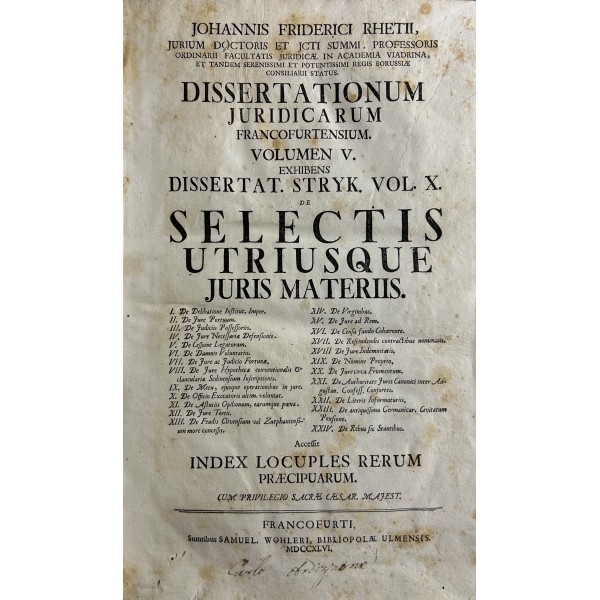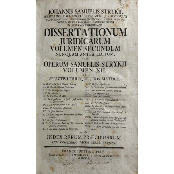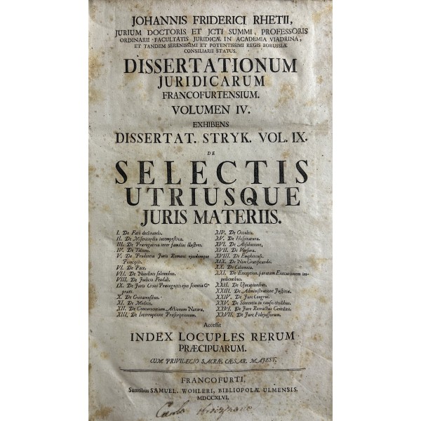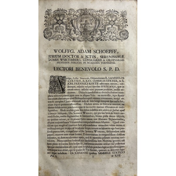 Samuelis Strykii Jc.. Nec non eius filii unici Johannis Samuelis Strykii.. Opera omnia tam tractatus quam disputationes hactenus etiam nondum coniunctim editas magnaque cura partim collectas continentia una cum illustris Joh. Frider. Rhetii.. Praemissa praefatione Wolffgang Adam. Schoepffii..