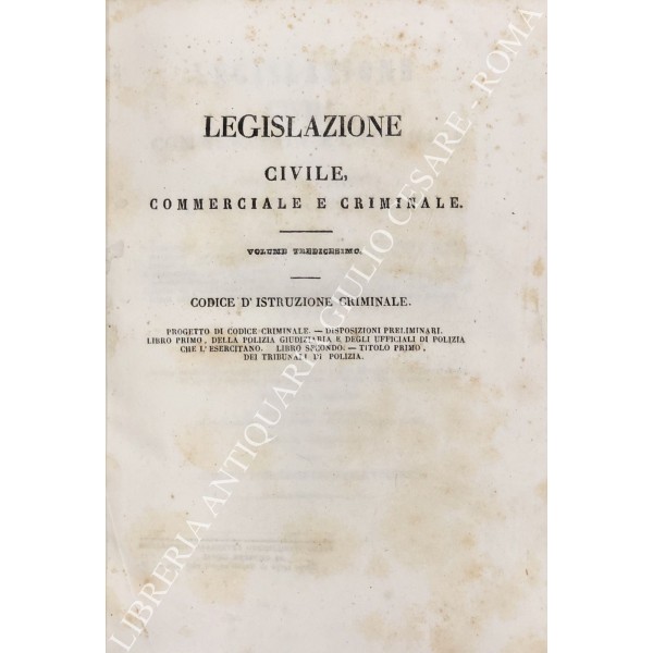 Legislazione civile, commerciale e criminale ossia comentario e compimento dei Codici francesi. Tratti cioè: Il comentario, dai processi verbali del consiglio di Stato, dalle sposizioni de' motivi, discussioni, rapporti e discorsi, fatti o pronunziati nell'assemblea del tribunato ed innanzi al corpo legislativo; Il compimento, dalle leggi anteriori alle quali i codici si riferiscono, e dalle leggi posteriori belgiche e francesi che li estendono, l'interpretano o li modificano. ... Sull'ultima edizione di Brusseles, col confronto delle leggi antiche e moderne delle due Sicilie per cura di Giuseppe Cioffi. Voll. I-VIII - Codice civile. Voll. IX-X - Codice di procedura civile. Voll. XI-XII - Codice di commercio. Voll. XII-XIV - Codice d'istruzione criminale. Vol. XV - Codice penale. Vol. XVI - Tavola alfabetica generale delle materie