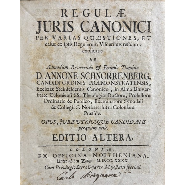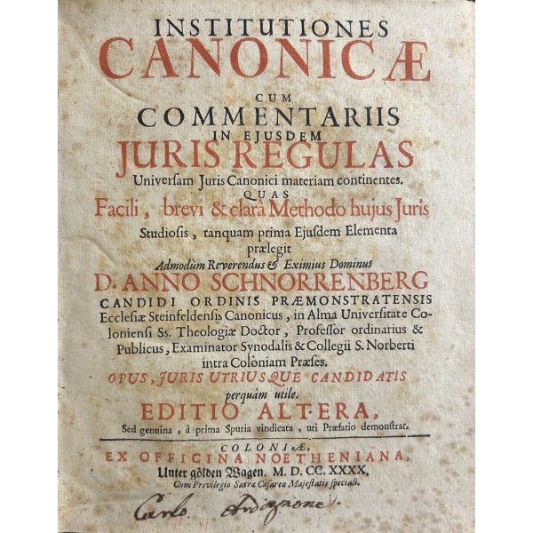 Institutiones canonicae cum commentariis in ejusdem juris regulas Universam Juris Canonici materiam continentes. UNITO A: Regulae juris canonici per varias quaestiones, et casus ex ipsis Regularum Visceribus resolutos explicatae