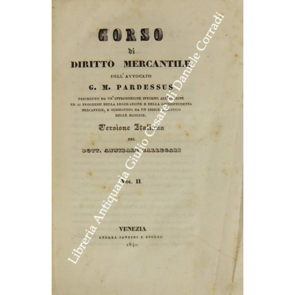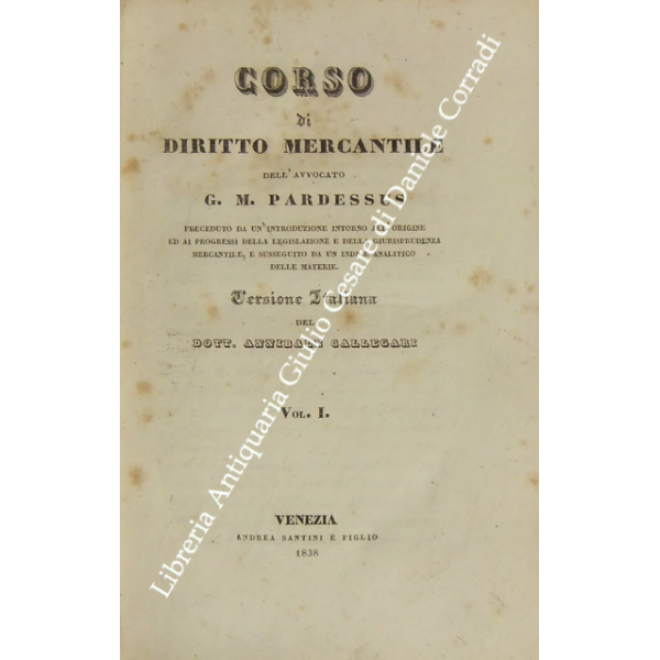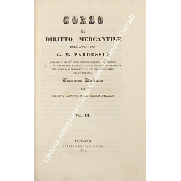 Corso di diritto mercantile.. Preceduto da un'introduzione intorno all'origine ed ai progressi della legislazione e della giurisprudenza mercantile e susseguito da un indice analitico delle materie. Versione italiana del Dott. Annibale Callegari