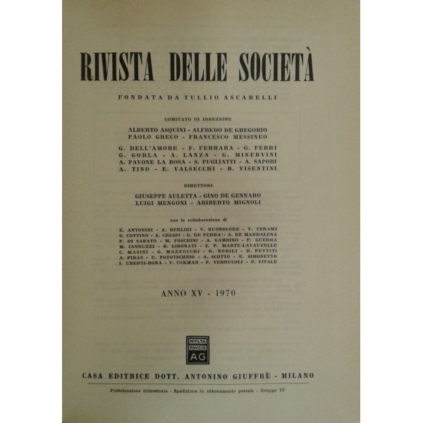 Rivista delle società. Fondata da Tullio Ascarelli. Diretta da: A.Asquini, G.Auletta, A.Crespi, G.de Gennaro, A.De Gregorio, G.Dell'Amore, F.Ferrara, F.Ferri, G.Frè, G.Gorla, C.Grassetti, P.Greco, G.Landi, A.Lanza, L.Mengoni, F.Messineo, A.Mignoli, G.Minervini, A.Pavone La Rosa, G.B.Portale, S.Pugliatti, G.Rossi, A.Sapori, A.Tino, E.Valsecchi, B.Visentini