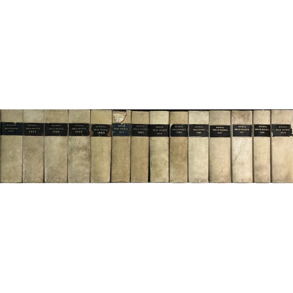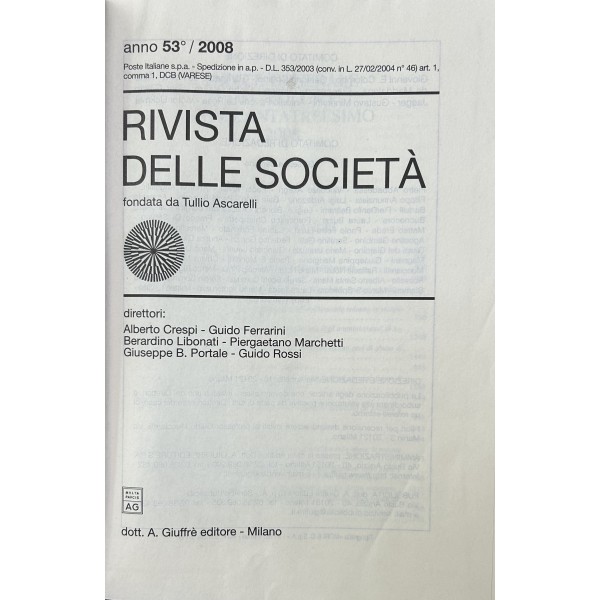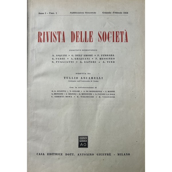 Rivista delle società. Fondata da Tullio Ascarelli. Diretta da: A.Asquini, G.Auletta, A.Crespi, G.de Gennaro, A.De Gregorio, G.Dell'Amore, F.Ferrara, F.Ferri, G.Frè, G.Gorla, C.Grassetti, P.Greco, G.Landi, A.Lanza, L.Mengoni, F.Messineo, A.Mignoli, G.Minervini, A.Pavone La Rosa, G.B.Portale, S.Pugliatti, G.Rossi, A.Sapori, A.Tino, E.Valsecchi, B.Visentini