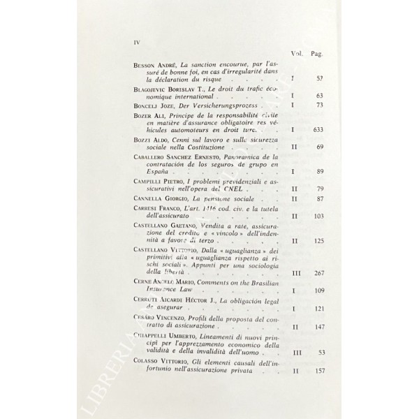 Edizione promossa dall'Associazione Internazionale di Diritto delle Assicurazioni. Introduce il libro una cronaca della cerimonia d'apertura. Ritratto fotografico di Donati ad inizio del primo volume. Scritti di: Angela, Arena, Arendt, Artom, Asquini, Baeli, Baldi, Barahona, Bard, Battara, Bauerreis, Benedetti, Besson, Blagojevic, Boncelj, Bozer, Bozzi, Caballero, Campilli, Cannella, Carresi, G. Castellano, V. Castellano, Cerne, Cerruti Aicardi, Cesaro, Chiappelli, Colasso, Coppini, D'Addario, D'Agata, Dall'Aglio, Dalmartello, D'Antonio, De Ferra, De Larramendi, De Meo, De Mori, Di Stefano, Duni, Duque, Durante, Ehrenzweig, Emanuelli, Eula, Fanelli, Favara, Federici, Ferrarini, G. Ferri, Franceschelli, Gambino, Gambogi, Garrigues Canabate, Gasperoni, Genovese, Geri, Giannattasio, Giannone, Halperin, Hellner, Innami, Jovanovic, Kelly, Kimball, Kimura, Koenig, Kohler, Lasok, La Torre, Lefebvre D'Ovidio, L'Eltore, Levi Sandri, Linden Allen, Longo, Mantilla, Molina, Marchetti, Martino, Matricardi, Menendez, Mezzanotte, Micheli, Molinaro, Moller, R. Monaco, Morandi, Nolst, Omori, Ossa, Ottaviani, Padoa, Parrillo, Pasanisi, Pella, Perdikas, Petrilli, Poggi, Prochazka, Prosperetti, Reichert Facilides, Rocas, Roehrssen, Rogers, Rosso, Ruta, Salvemini, Sanchez Calero, Santoro Passarelli, Sassoon, Scalfi, Schmidt, Scotto, Selmer, Shaw, Simonetto, Sotgia, Stammati, Steinlin, M. Stella Richter, Stolfi, Sylos Labini, Tagliacarne, Tamburrino, Tavolaro, Volpe Putzolu, Warkallo, Wets, Zaanoun.