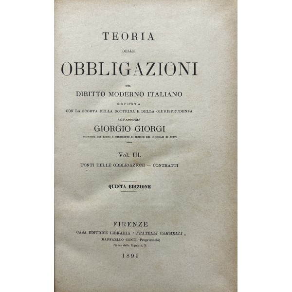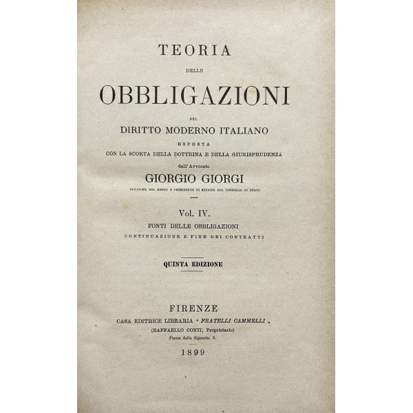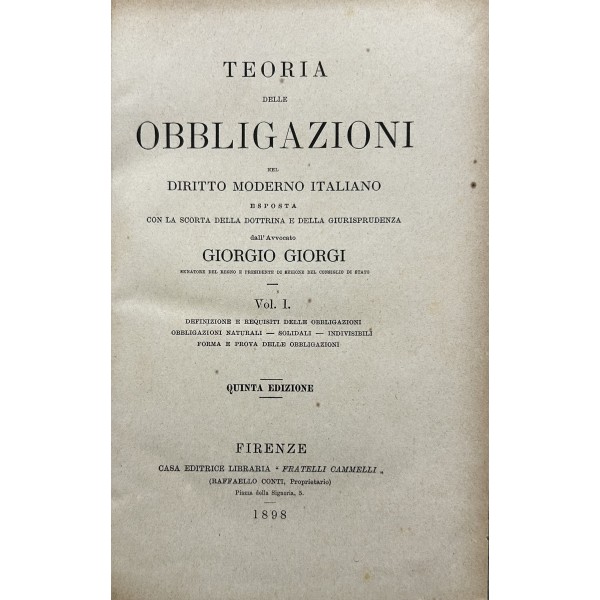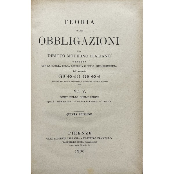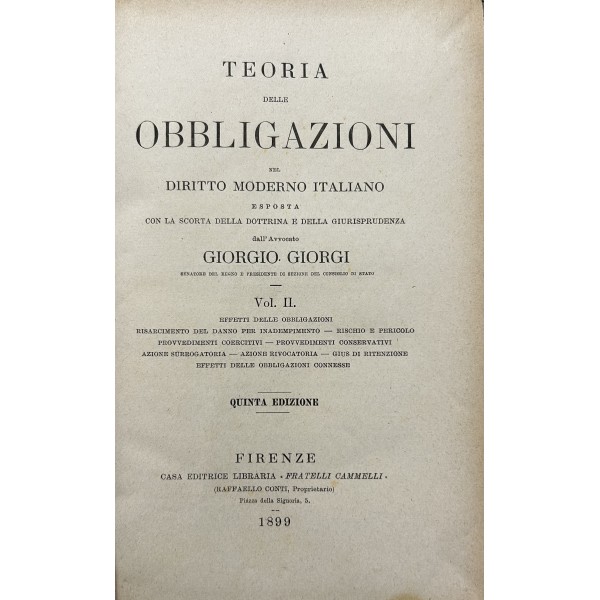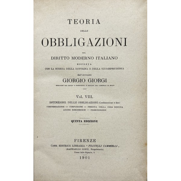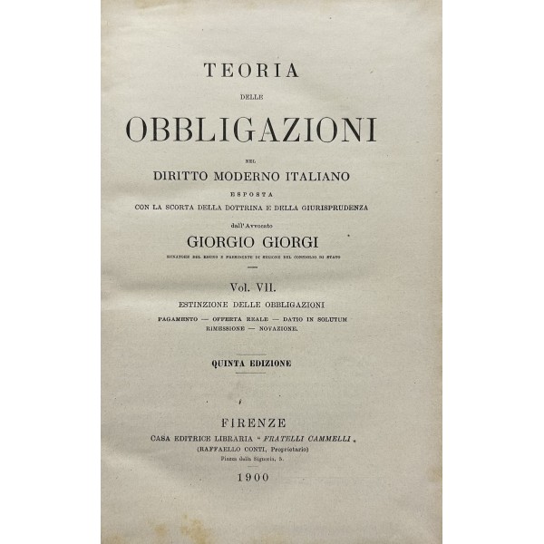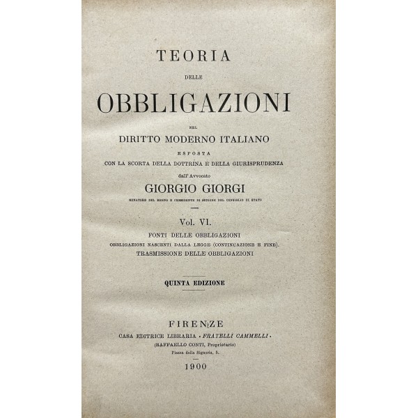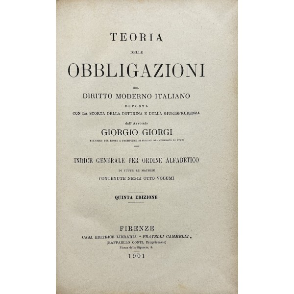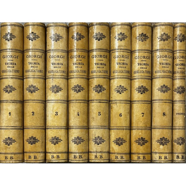 Teoria delle obbligazioni nel diritto moderno italiano esposta con la scorta della dottrina e della giurisprudenza. Vol. I - Definizioni e requisiti delle obbligazioni. Obbligazioni naturali solidali indivisibili. Forma e prova delle obbligazioni. Vol. II - Effetti delle obbligazioni. Risarcimento del danno per inadempimento. Rischio e pericolo. Provvedimenti coercitivi. Provvedimenti conservativi. Azione surrogatoria. Azione rivocatoria. Gius di ritenzione. Effetti delle obbligazioni connesse. Vol. III - Fonti delle obbligazioni. Contratti. Vol. IV - Fonti delle obbligazioni. Continuazione e fine dei contratti. Vol. V - Fonti delle obbligazioni. quasi contratti. Fatti illeciti. Legge. Vol. VI - Fonti delle obbligazioni. Obbligazioni nascenti dalla legge (continuazione e fine). Trasmissione delle obbligazioni. Vol. VII - Estinzione delle obbligazioni. Pagamento. Offerta reale. Datio in solutum. Rimessione. Novazione. Vol. VIII - Estinzione delle obbligazioni (continuazione e fine). Compensazione. Confusione. Perdita della cosa dovuta. Azioni rescissorie. Prescrizione. Vol. IX - Indice generale per ordine alfabetico di tutte le materie contenute negli otto volumi