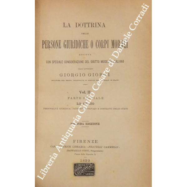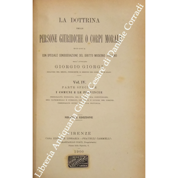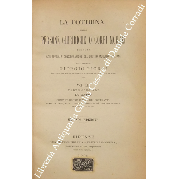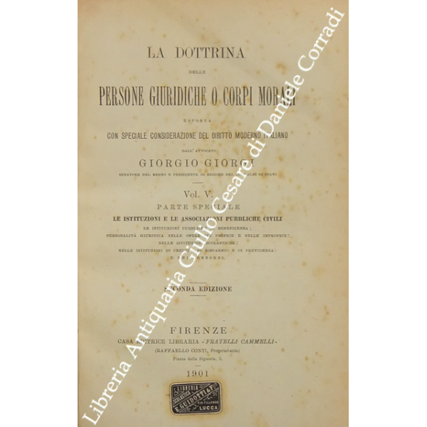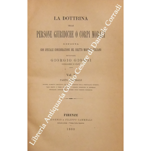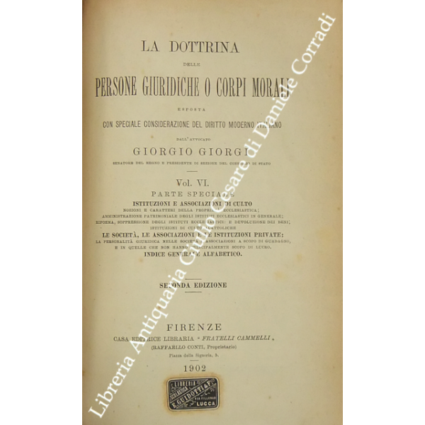 La dottrina delle persone giuridiche o corpi morali esposta con speciale considerazione del diritto moderno italiano. Vol. I - Parte generale. Vol. II e III - Parte speciale. Lo Stato. Vol. IV - Parte speciale. I comuni e le provincie. Vol. V - Parte speciale. Le istituzioni e le associazioni pubbliche civili. Vol. VI - Parte speciale. Istituzioni e associazioni di culto. Le società, le associazioni e le istituzioni private. Indice generale alfabetico