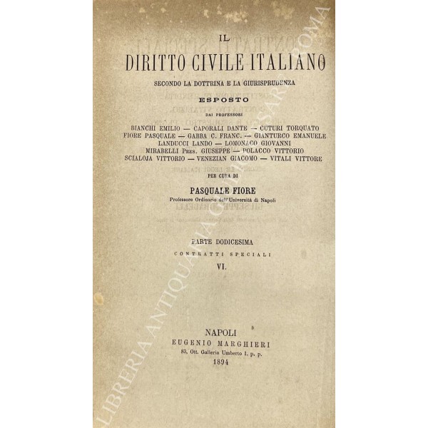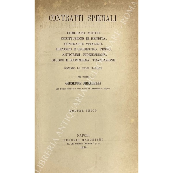 Contratti speciali. Comodato. Mutuo. Costituzione di rendita. Contratto di vitalizio. Deposito e sequestro. Pegno. Anticresi. Fideiussione. Giuoco e scommessa. Transazione. Secondo le leggi italiane