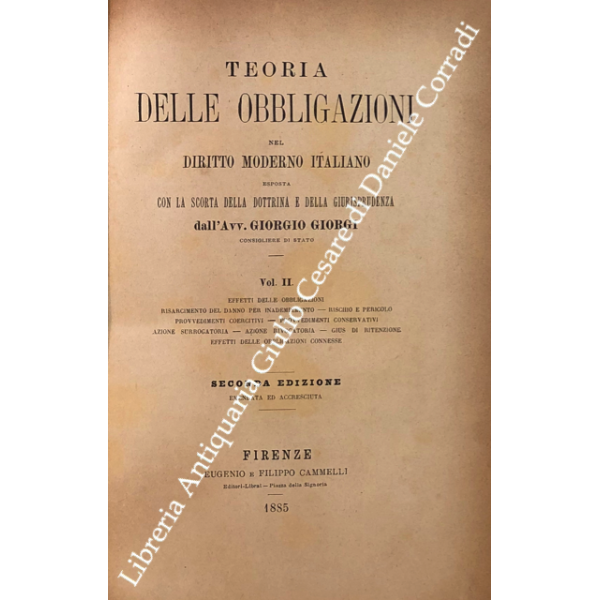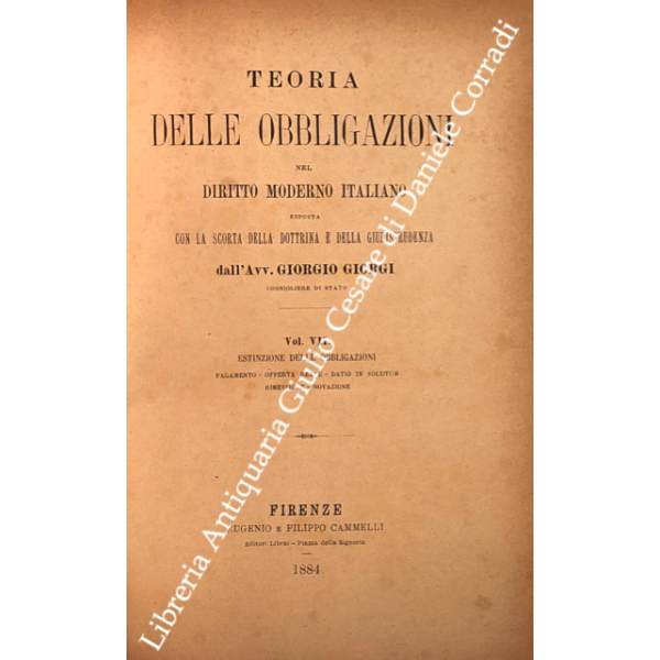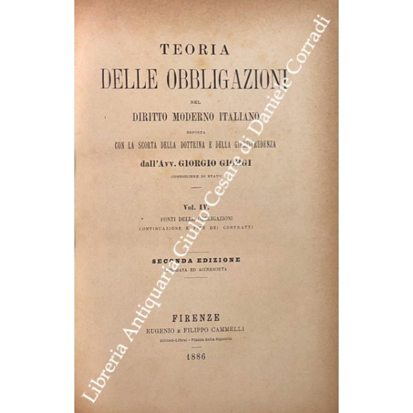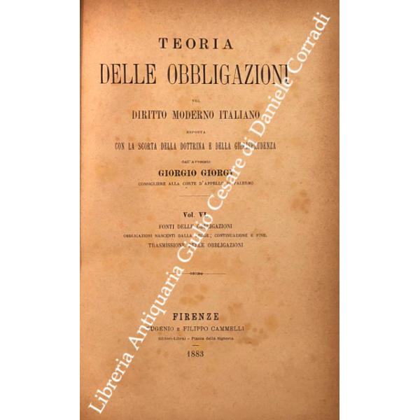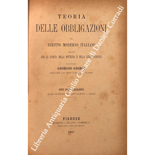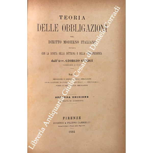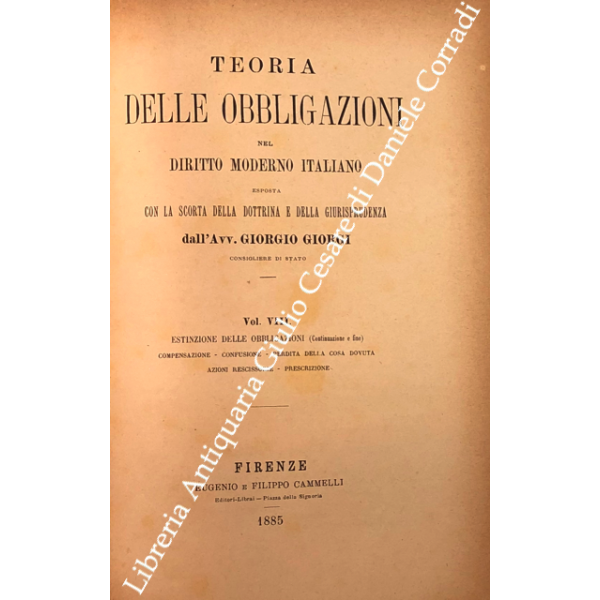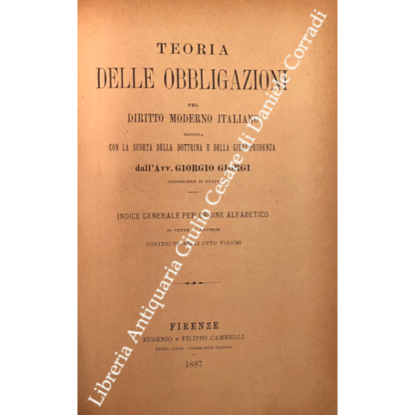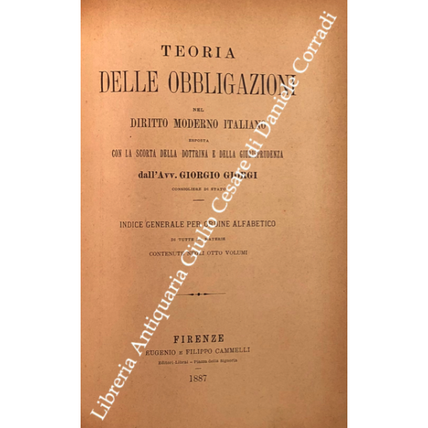 Teoria delle obbligazioni nel diritto moderno italiano esposta con la scorta della dottrina e della giurisprudenza. Vol. I - Definizioni e requisiti delle obbligazioni. Obbligazioni naturali solidali indivisibili. Forma e prova delle obbligazioni; Vol. II - Effetti delle obbligazioni. Risarcimento del danno per inadempimento. Rischio e pericolo. Provvedimenti coercitivi. Provvedimenti conservativi. Azione surrogatoria. Azione rivocatoria. Gius di ritenzione. Effetti delle obbligazioni connesse; Vol. III - Fonti delle obbligazioni. Contratti; Vol. IV - Fonti delle obbligazioni. Continuazione e fine dei contratti; Vol. V - Fonti delle obbligazioni. quasi contratti. Fatti illeciti. Legge; Vol. VI - Fonti delle obbligazioni. Obbligazioni nascenti dalla legge (continuazione e fine). Trasmissione delle obbligazioni; Vol. VII - Estinzione delle obbligazioni. Pagamento. Offerta reale. Datio in solutum. Rimessione. Novazione; Vol. VIII - Estinzione delle obbligazioni (continuazione e fine). Compensazione. Confusione. Perdita della cosa dovuta. Azioni rescissorie. Prescrizione; Vol. IX - Indice generale per ordine alfabetico di tutte le materie contenute negli otto volumi