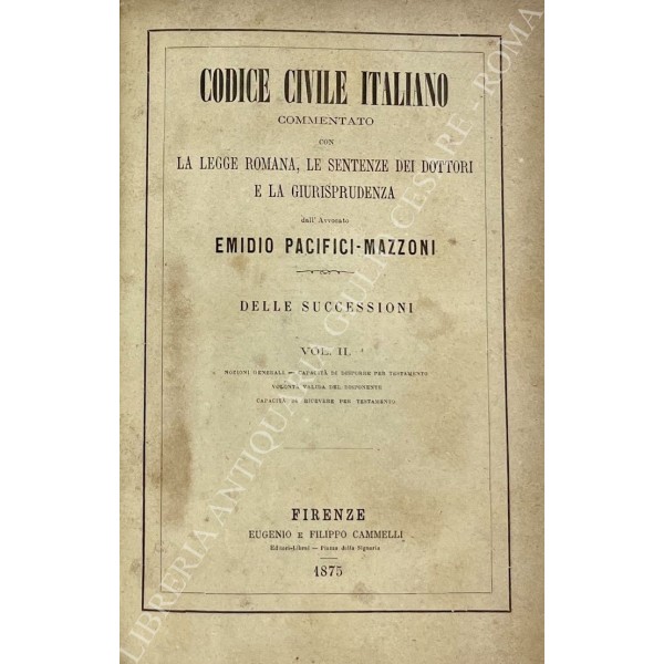 Codice civile italiano commentato con la legge romana, le sentenze dei dottori e la giurisprudenza. Delle successioni. Vol. II - Nozioni generali; Capacità di disporre per testamento; Volontà valida del disponente; Capacità di ricevere per testamento