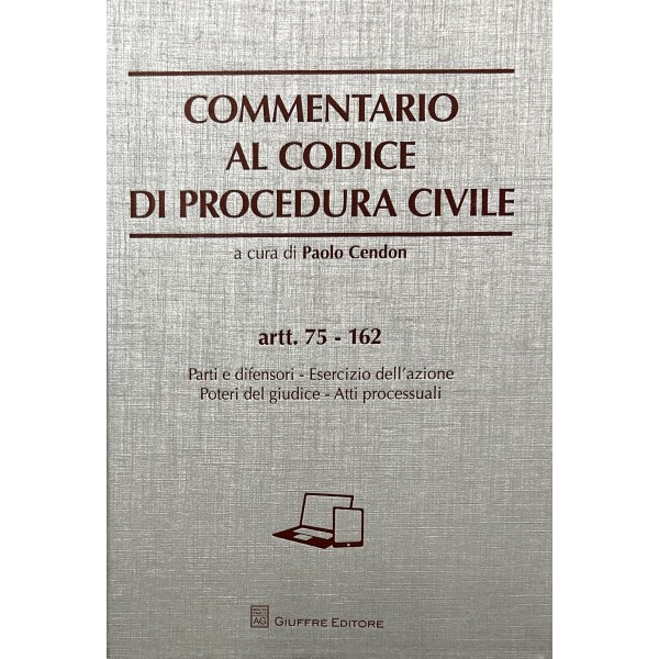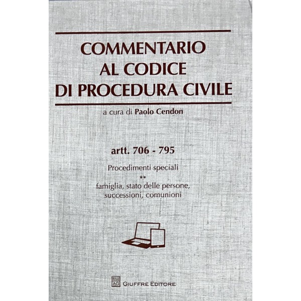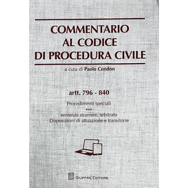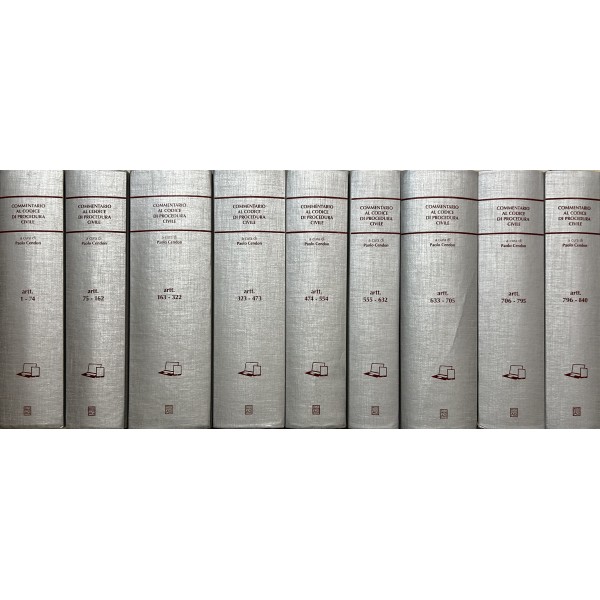 Commentario al codice di procedura civile. Vol. I - Artt. 1-74: Organi giudiziari - Pubblico Ministero. Vol. II - Artt. 75-162: Parti e difensori - Esercizio dell'azione - Poteri del giudice - Atti processuali. Vol. III - Artt. 163-322: Processo di cognizione - Procedimento davanti al tribunale - Giudice di pace. Vol. IV - Artt. 323-473: Impugnazioni - Contoversie in materia di lavoro. Vol. V - Artt. 474-554: Processo di esecuzione: atto di precetto, espropriazione mobiliare, espropriazione presso terzi. Vol. VI - Artt. 555-632: Processo di esecuzione: espropriazione immobiliare, opposizioni. Vol. VII - Artt. 633-705: Procedimenti speciali: procedimenti sommari. Vol. VIII - Artt. 706-795: Procedimenti speciali: famiglia, stato delle persone, successioni, comunioni. Vol. IX - Artt. 796-840: Procedimenti speciali: sentenze straniere, arbitrato - Disposizioni di attuazione e transitorie
