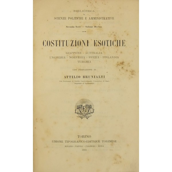 Costituzioni esotiche. Il sistema rappresentativo al Giappone (Furuya). Studio sulla Costituzione del Giappone (Tackumassu). La costituzione dell'Australia (Moore). La Costituzione ungherese (Radò). La Norvegia Stato sovrano (Drolsum). Il diritto costituzionale del Regno di Svezia (Berencreutz). Il diritto pubblico del Granducato di Finlandia (Mechelin). La Costituzione Ottomana (Ubicini e Luzzatti). La Costituzione ungherese e le relazioni tra l'Austria e l'Ungheria (Apponyi). Prefazione di Attilio Brunialti