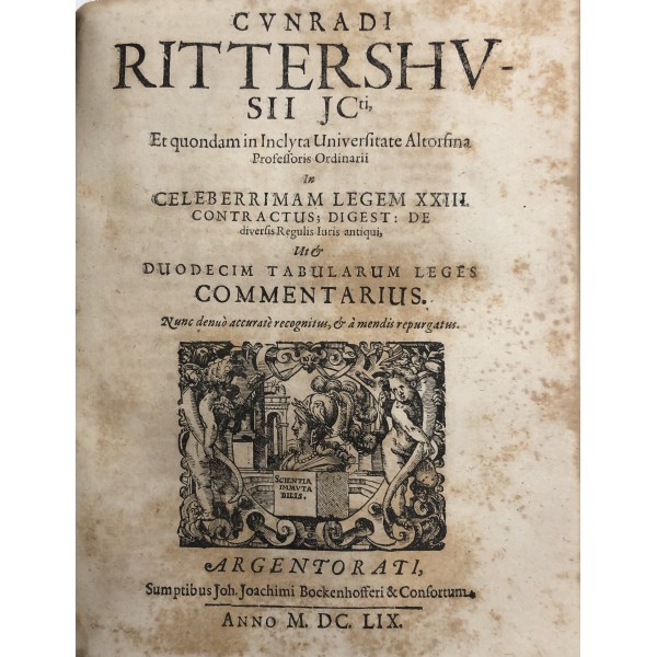 In titulum Digestorum de verborum significatione Commentarius. Cum Indice Rerum & Verborum. UNITO A: Cunradi Rittershusii - Commentarius novus, pulcherrimus.. In celeberrimam legem XXIII. Contractus; Digest: De diversis regulis iuris antiqui ut Duodecim Tabularum Leges Commentarius. Argentorati, Joachimi Bockenhofferi, 1659. UNITO A: Cunradi Rittershusii - Dodecadeltos sive in duodecim tabularum leges commentarius novum. Argentorati, Joachimi Bockenhofferi, 1659