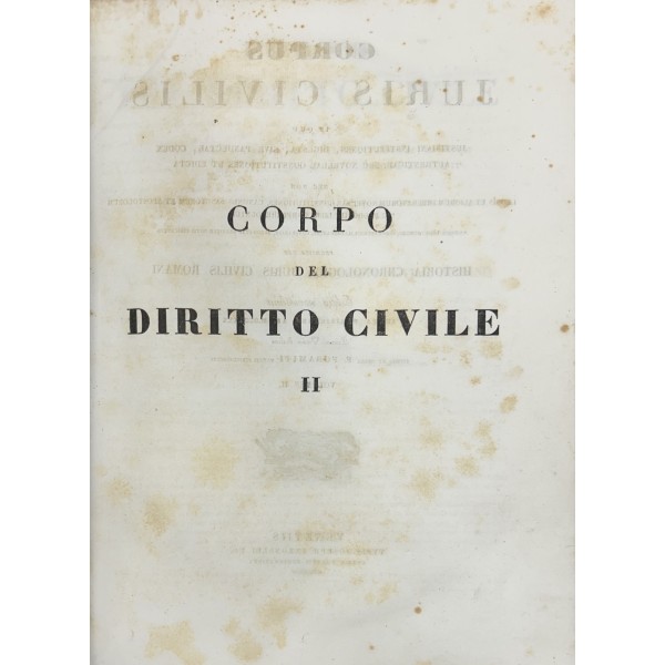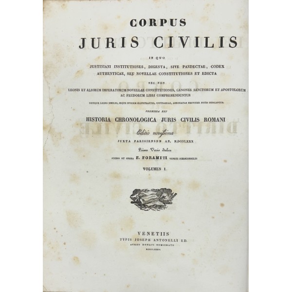 Corpo del diritto civile in cui si contengono le instituzioni di Giustiniano, i digesti o pandette, il codice, le autentiche, ossiano novelle costituzioni, e gli editti, non che le novelle costituzioni di Leone e di altri imperatori, i canoni de' santi e degli apostoli e i libri de' feudi con brevi note indicanti le leggi simili, quelle che a vicenda s'illustrano, le contrarie e le abrogate, premessa: La storia cronologica del diritto civile romano. Corpus juris civilis in quo Justiniani institutiones, didesta, sive pandectae, codex, authenticae, seu novellae constitutiones et edicta