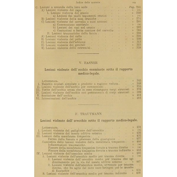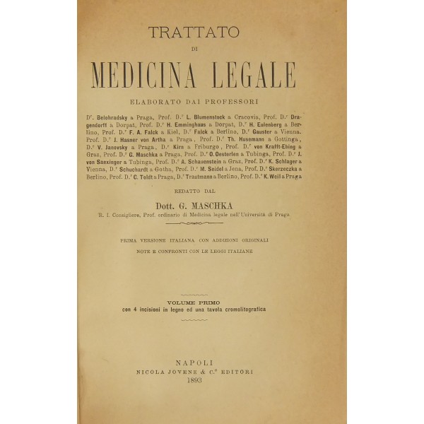 L'opera si completa in 4 volumi. Contributi di: Belohradsky, Blumenstock, Dragendorff, Emminghaus, Eulenberg, Falck, Gauster, Hasner von, Husemann, Janovsky, Kirn, Krafft Ebing von, Maschka, Oesterlen, Saexinger von, Schauenstein, Schlager, Schuchardt, Seidel, Skerzeczka, Toldt, Trautmann, Weil. Vol. I - (Janovsky): Sviluppo storico della medicina legale. (Eulenberg): Compito del medico legale nell'eseguire le ricerche e nel dare il suo parere. (Blumenstok): Dottrina delle lesioni violente meccaniche con speciale riguardo alle escoriazioni, contusioni, ferite da taglio, da fendente, lacere e da arma a fuoco. (Hasner): Lesioni violente dell'occhio esaminate sotto il rapporto medico legale. (Trautmann): Lesioni violente dell'orecchio sotto il rapporto medico legale. (Weil): Le cicatrici sotto il rapporto medico legale. (Blumenstok): Risposta alla domanda: Omicidio, suicidio o morte accidentale? (Dragendorff): Esame delle tracce di sangue. (Oesterlen): Esame dei peli. (Schauenstein): Esame delle tracce prodotte da pedate e da istrumenti. (Maschka): Morte per soffocazione. (Belohradsky): Morte per annegamento. (Oesterlen): Morte per dissanguamento. (Falk): Morte per sottrazione di alimenti. Morte per scottatura. (Blumenstok): Morte per congelazione. (Oesterlen): Colpo di fulmine. (Schauenstein): Danni alla salute e morte per traumi pscichici. (Skrzeczka): Infanticidio. Vol. II - Gli avvelenamenti sotto il rapporto medico-legale. Per i professori: Schuchardt, Seidel, Husemann, Schauenstein. Vol. III - La inattitudine alla riproduzione. Ermafrodismo. Caratteri della verginità e attentati al pudore. Gravidanza e parto. Aborto procurato. Fenomeni cadaverici. Alterazioni cadaveriche innoltrate. Le ossa sotto il rapporto medico-legale. Errori professionali dei medici e chirurgi. Imperizia d'arte in ostetricia. Elaborato da: Oesterlen, Maschka, von Saxinger, Schauenstein, Toldt. Tradotto da Filomusi Guelfi e Vincenzo Meyer. Vol. IV - La psicopatologia legale. Elaborata da: Schlager, Emminghaus, Kirn, Gauster, von Krafft Ebing. Tradotta dai dottori Leonardo Bianchi e Vincenzo Meyer.